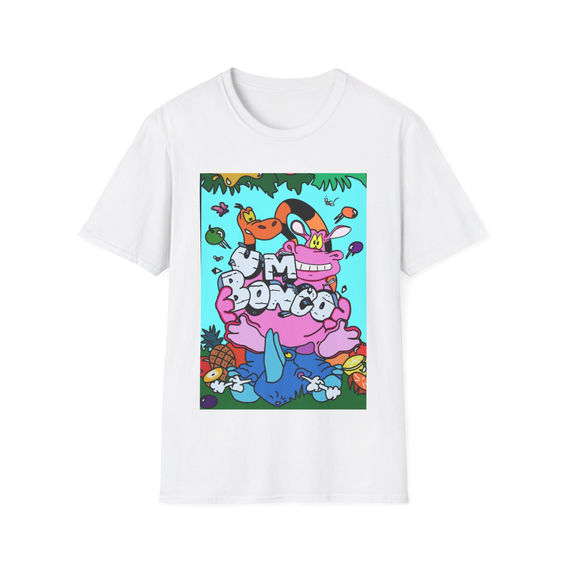 Bright, playful, and a little wild—this lightweight tee brings cartoon chaos to everyday wear. A punchy, colorful print sits on a soft white background: oversized characters, popping shapes, and the bold text at the center create an energetic, street-art vibe. The shirt feels light and breathable, so it layers easily under a jacket or stands on its own when you want the design to do the talking. Wear it when you’re heading out to a gig, a skate session, or a weekend hang with friends—the graphic starts conversations and lifts the mood without slowing you down.