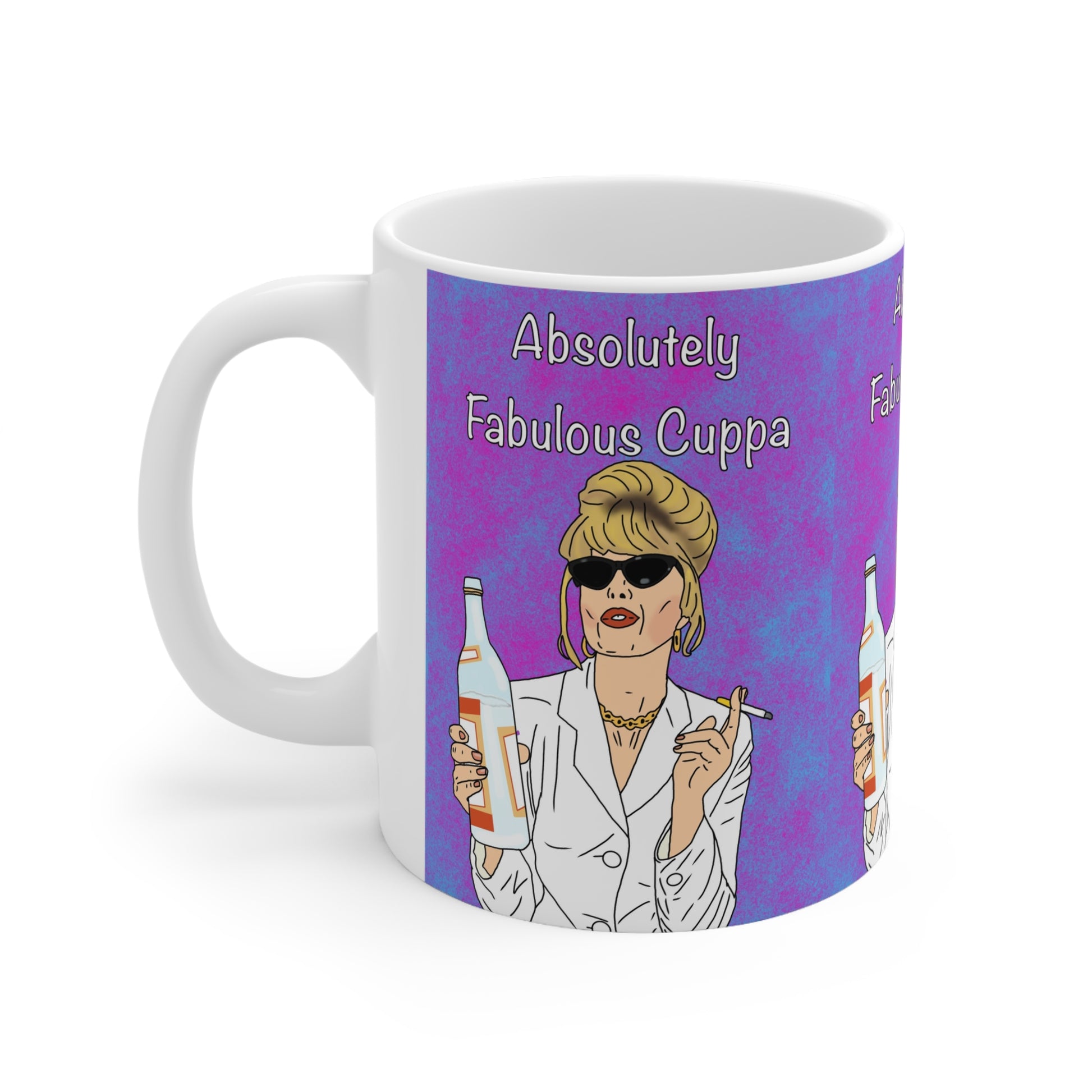 Bright, glossy ceramic mug that brings a cheeky, confident vibe to your morning routine. The wraparound design features a sassy, retro-styled woman in sunglasses holding a bottle and cigarette, set against a vibrant purple-pink marbled background with the phrase “Absolutely Fabulous Cuppa.” It feels like settling into a spirited conversation with a bold friend — lively, unapologetic, and a little glamorous. Use it to lift a slow weekday morning, punctuate a gossip-filled brunch, or keep on your desk as a small, joyful reminder to own your mood.
