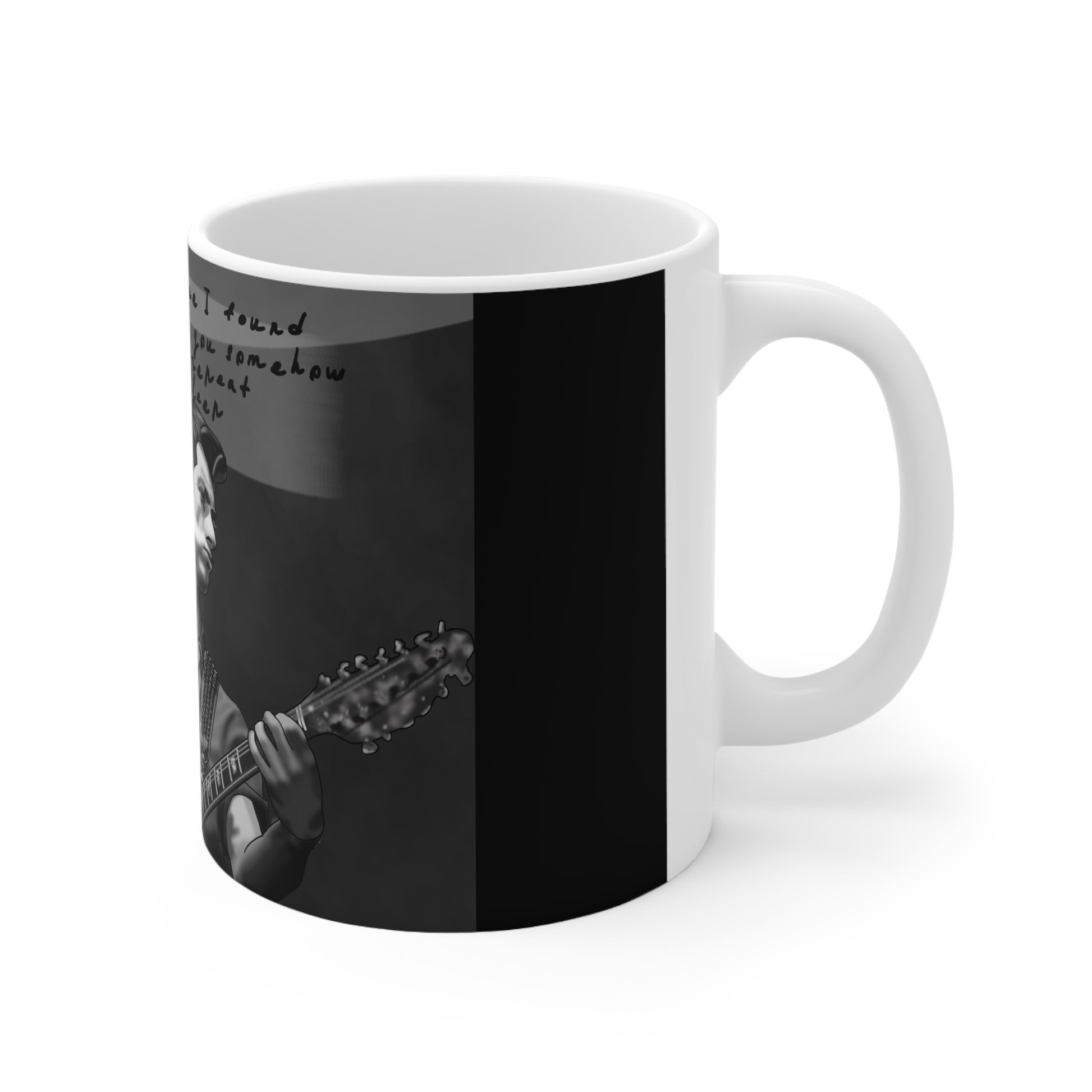 This mug sits naturally in the hands of music lovers, gig-goers, and anyone who collects small rituals tied to sound and memory. The grayscale palette fits on a cluttered pedalboard, a studio desk, or a living room filled with vinyl. Use it during songwriting, while cueing up a record, or as the cup you reach for when a particular lyric keeps looping in your head.