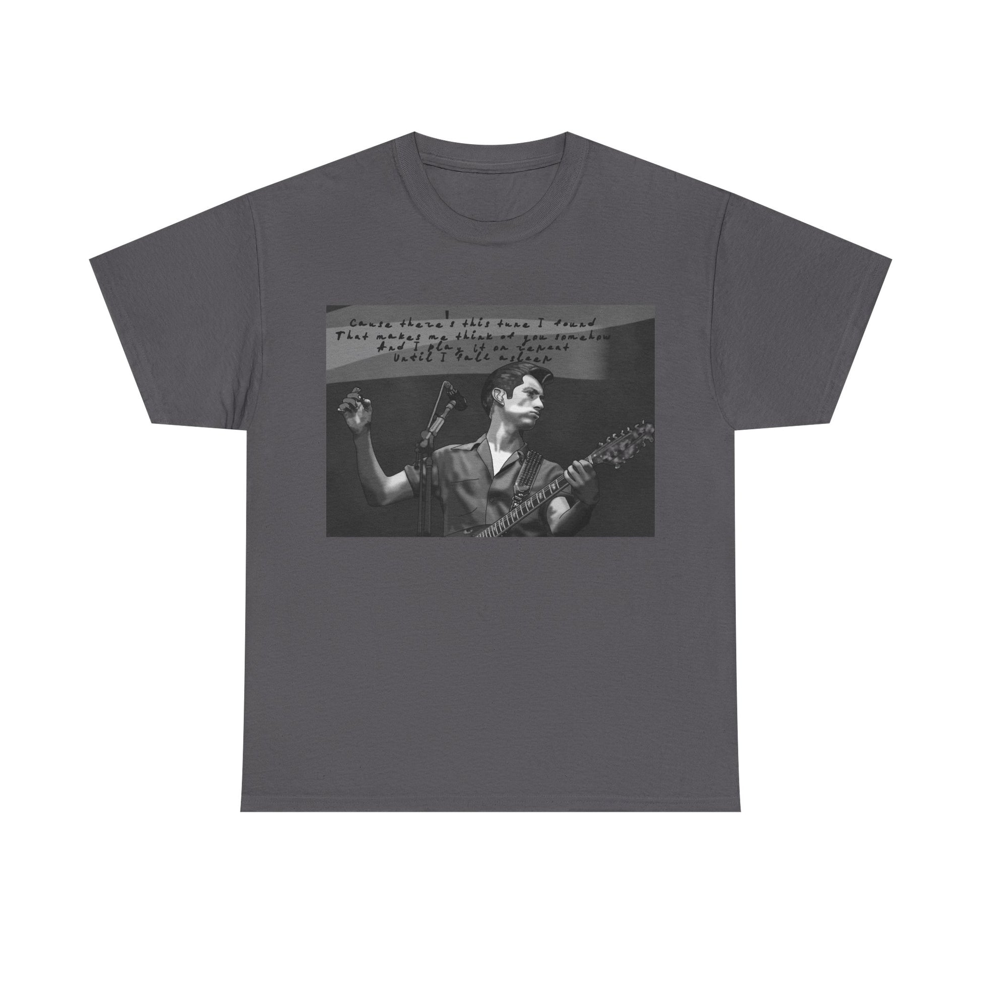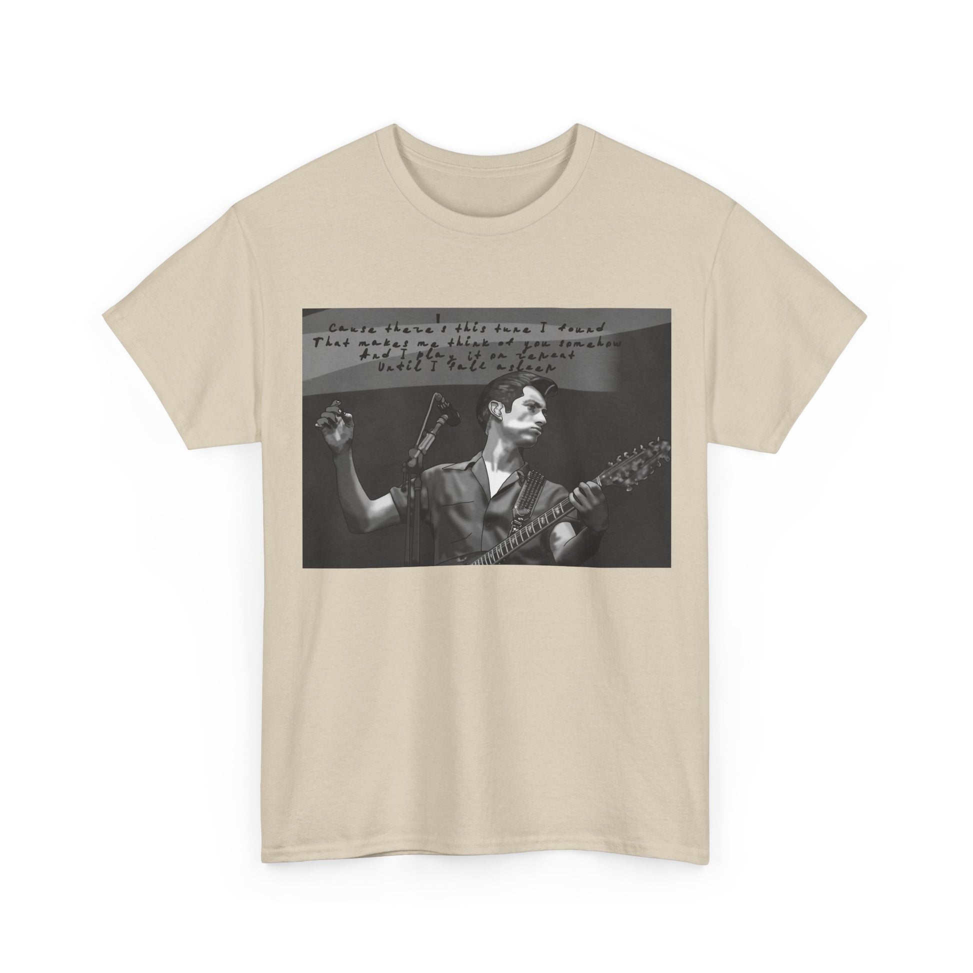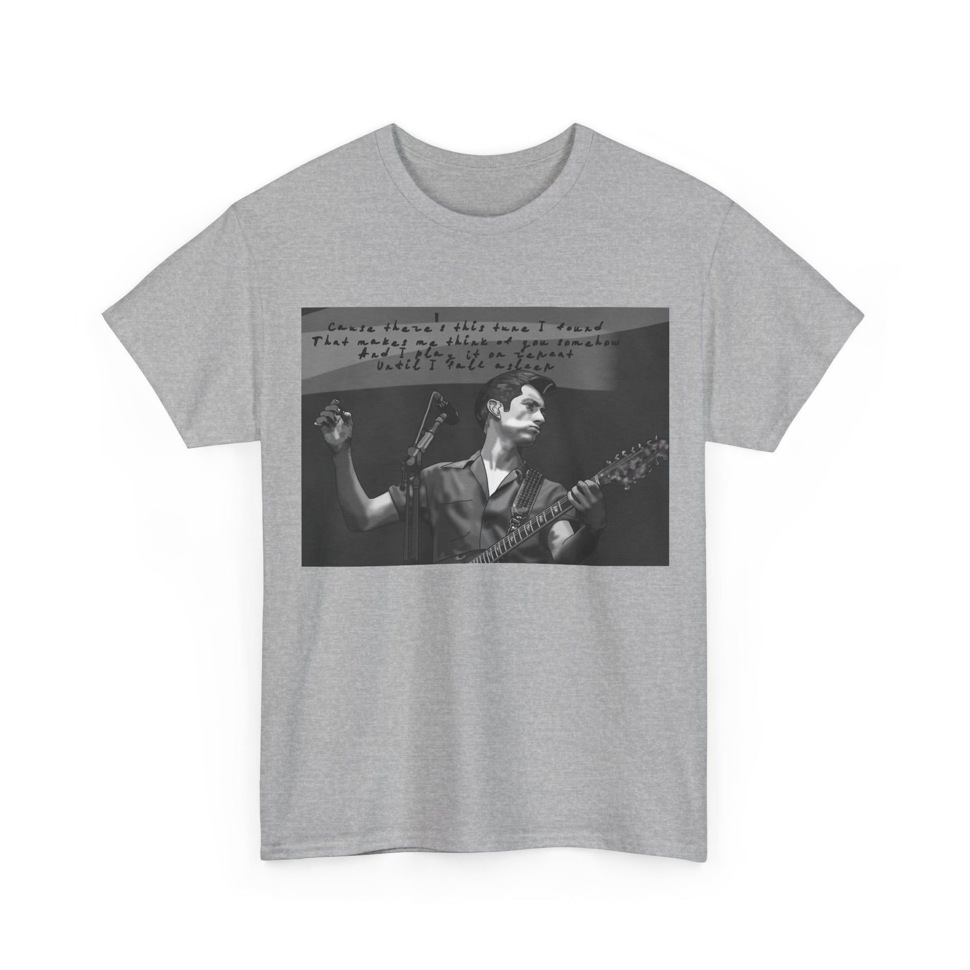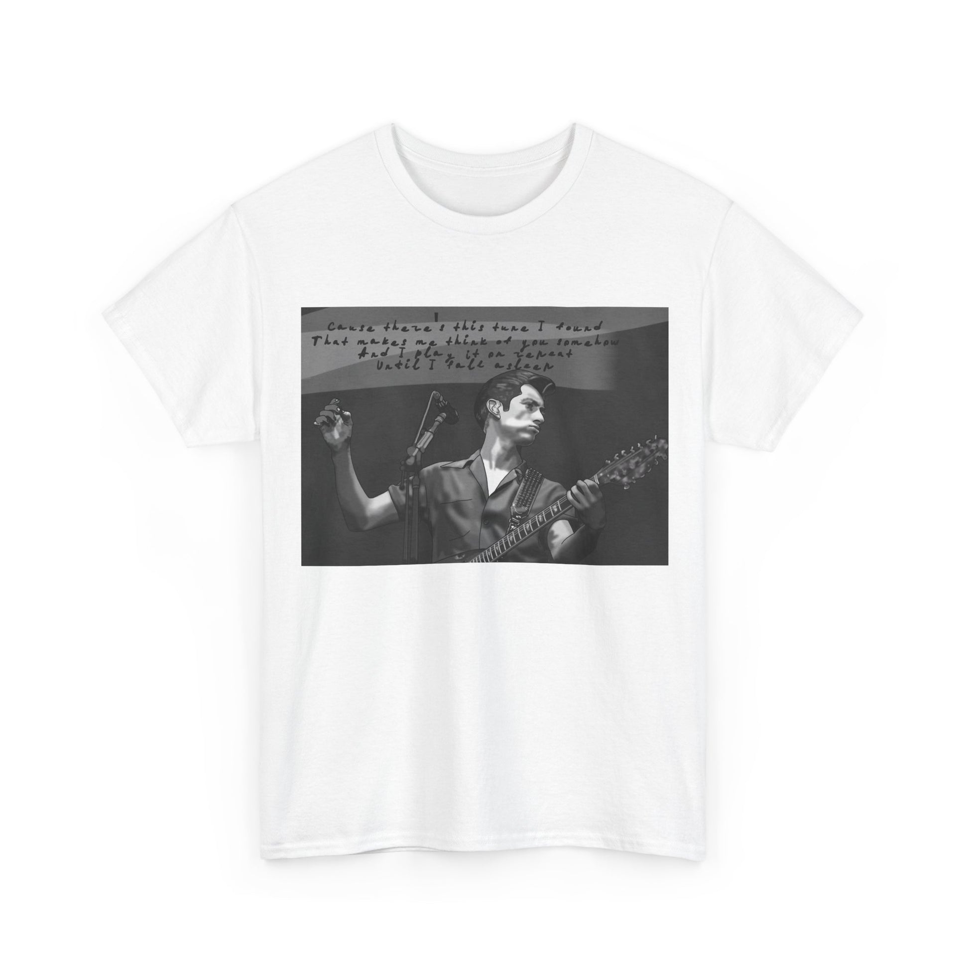A soft, lived-in tee that carries the hush of late-night gigs and the grainy warmth of analog photos. The front features a monochrome image of a solo musician mid-song, hand raised and guitar in frame, with a faint handwritten lyric strip above — like a memory pulled from an old cassette sleeve. Wear it layered under a denim jacket between sets, to the record store, or while scribbling chords in a dorm room. The relaxed crew neck and classic cut let the image sit honest and unpretentious. It ages with you, the cotton growing softer, the print settling into familiar rhythm. This is for people who keep setlists folded into pockets, who prefer the scratch of vinyl, and who enjoy clothing that tells a quiet story rather than shouts for attention.
