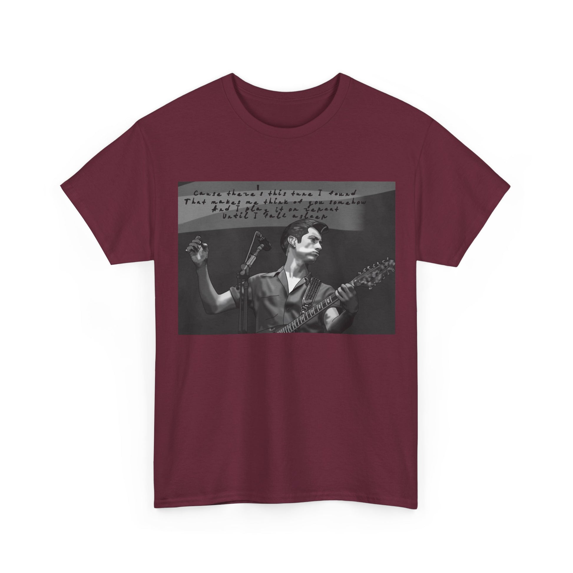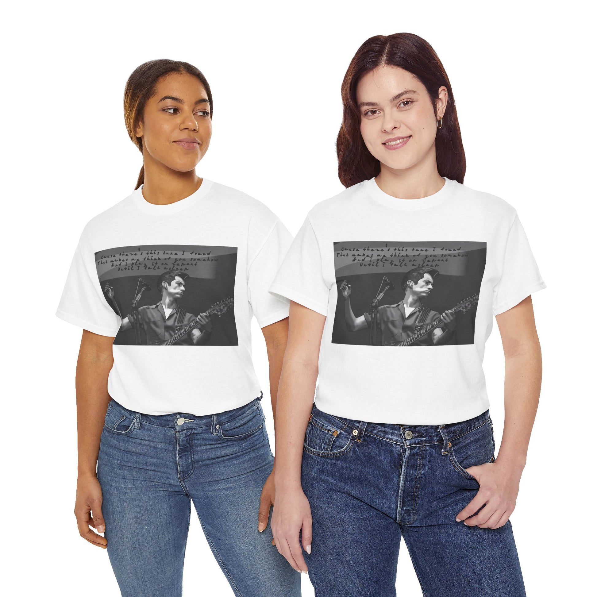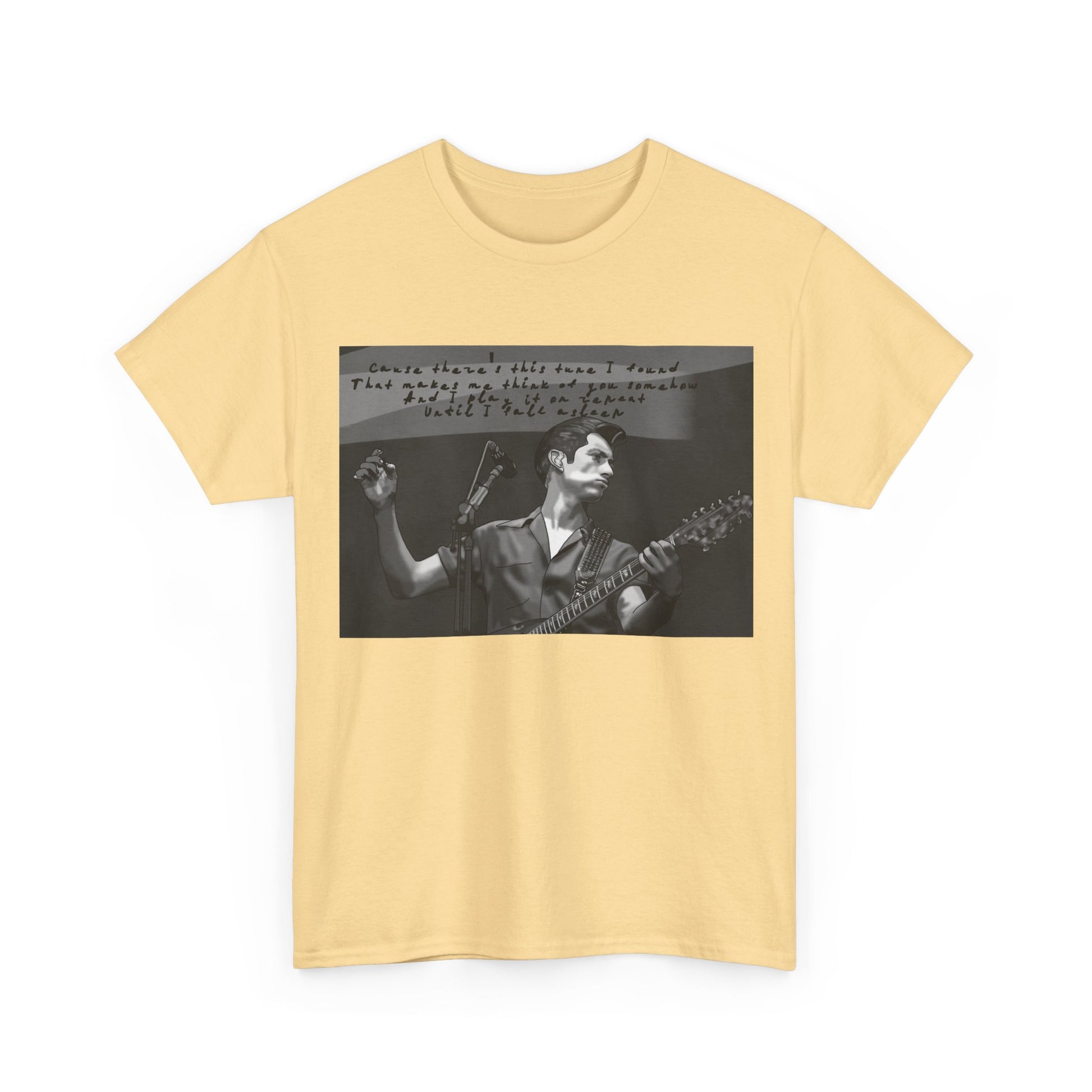 A soft, lived-in tee that carries the hush of late-night gigs and the grainy warmth of analog photos. The front features a monochrome image of a solo musician mid-song, hand raised and guitar in frame, with a faint handwritten lyric strip above — like a memory pulled from an old cassette sleeve. Wear it layered under a denim jacket between sets, to the record store, or while scribbling chords in a dorm room. The relaxed crew neck and classic cut let the image sit honest and unpretentious. It ages with you, the cotton growing softer, the print settling into familiar rhythm. This is for people who keep setlists folded into pockets, who prefer the scratch of vinyl, and who enjoy clothing that tells a quiet story rather than shouts for attention.