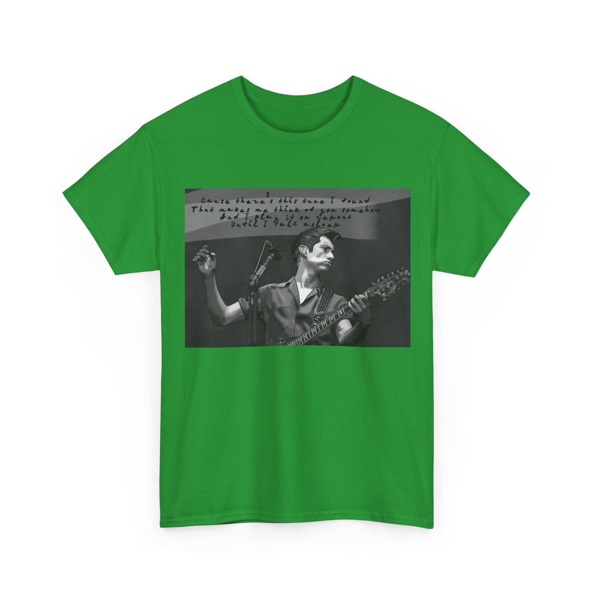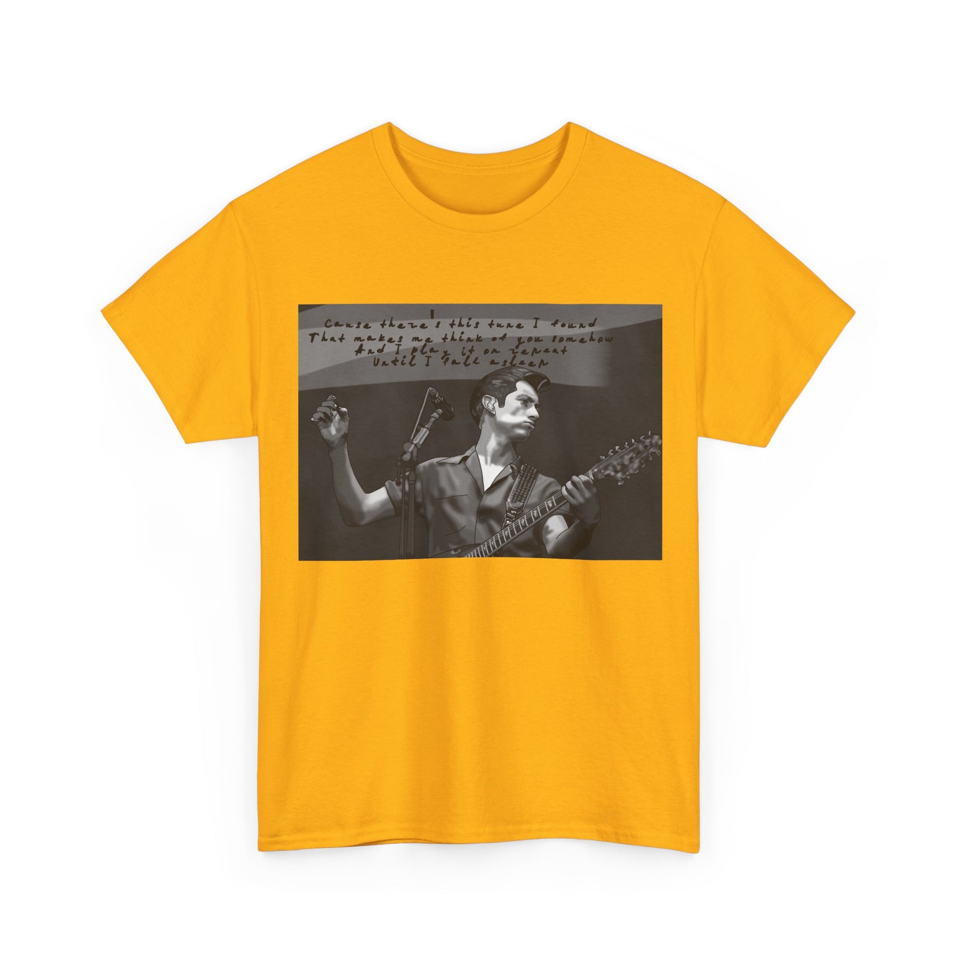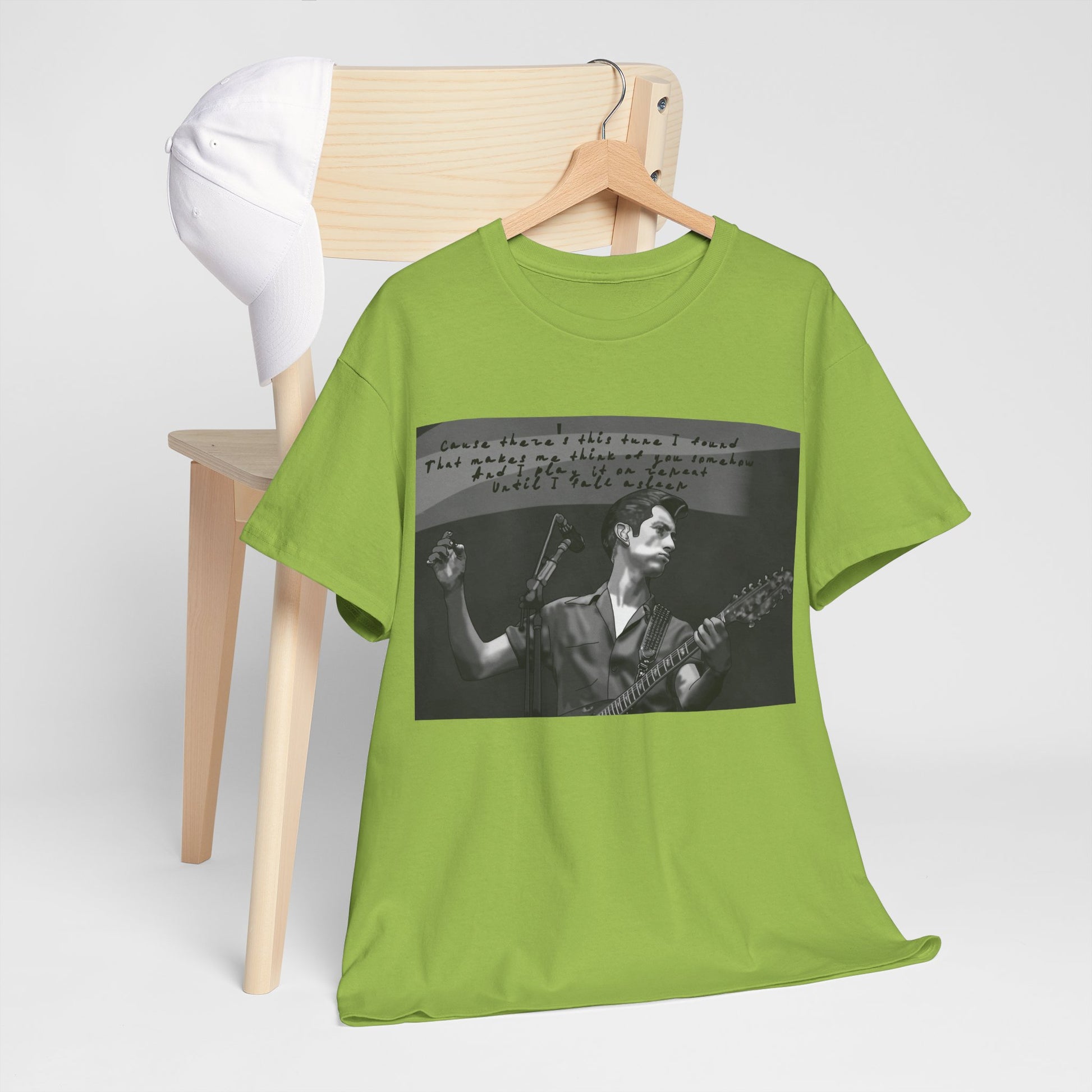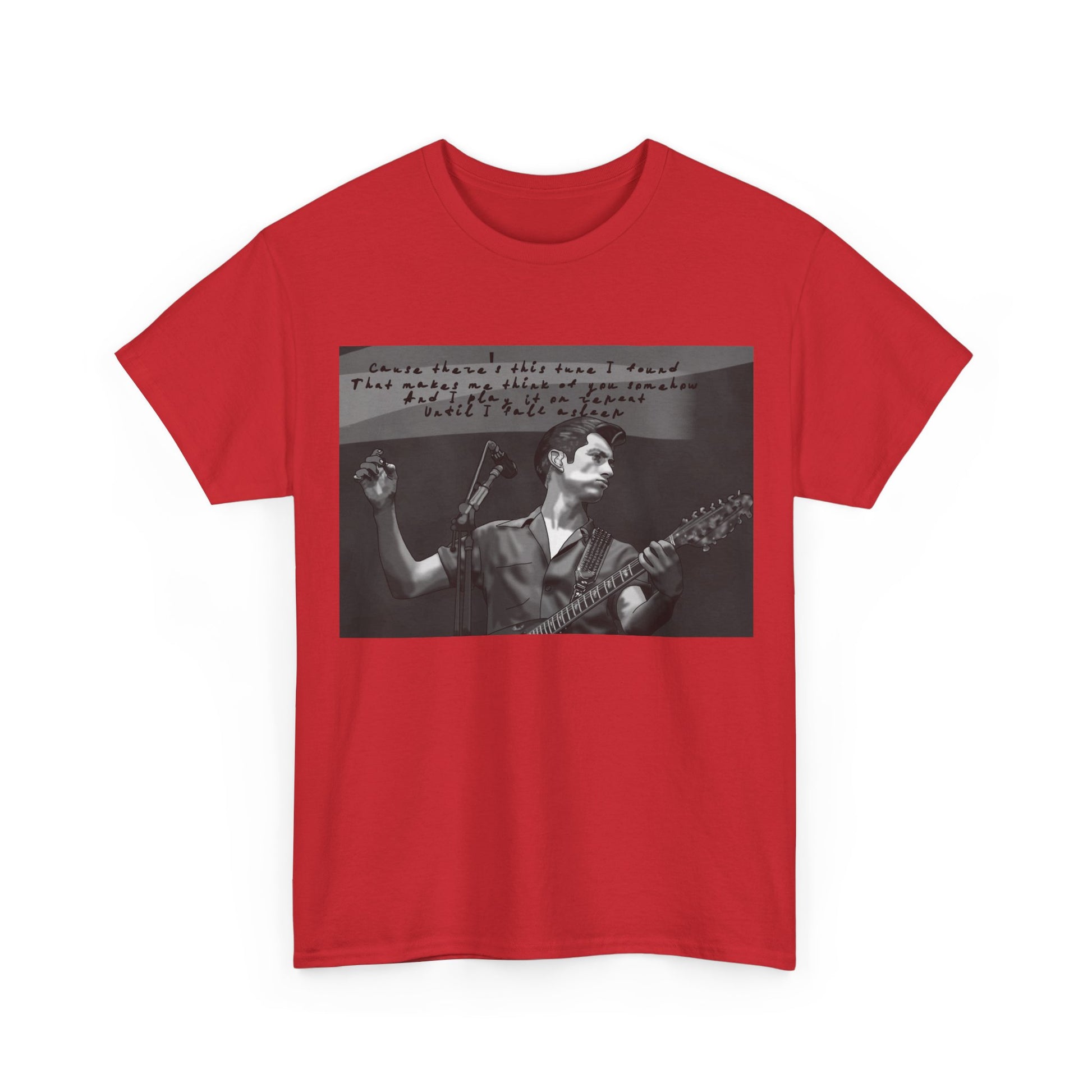 A soft, lived-in tee that carries the hush of late-night gigs and the grainy warmth of analog photos. The front features a monochrome image of a solo musician mid-song, hand raised and guitar in frame, with a faint handwritten lyric strip above — like a memory pulled from an old cassette sleeve. Wear it layered under a denim jacket between sets, to the record store, or while scribbling chords in a dorm room. The relaxed crew neck and classic cut let the image sit honest and unpretentious. It ages with you, the cotton growing softer, the print settling into familiar rhythm. This is for people who keep setlists folded into pockets, who prefer the scratch of vinyl, and who enjoy clothing that tells a quiet story rather than shouts for attention.