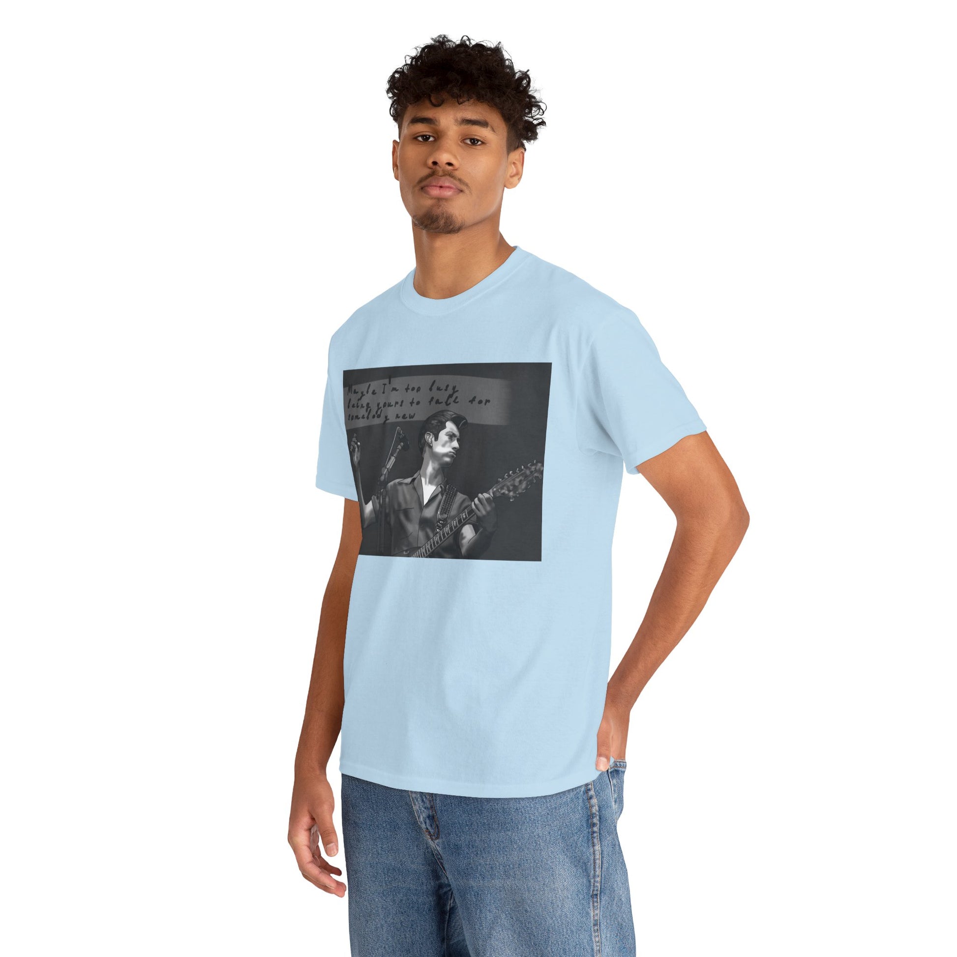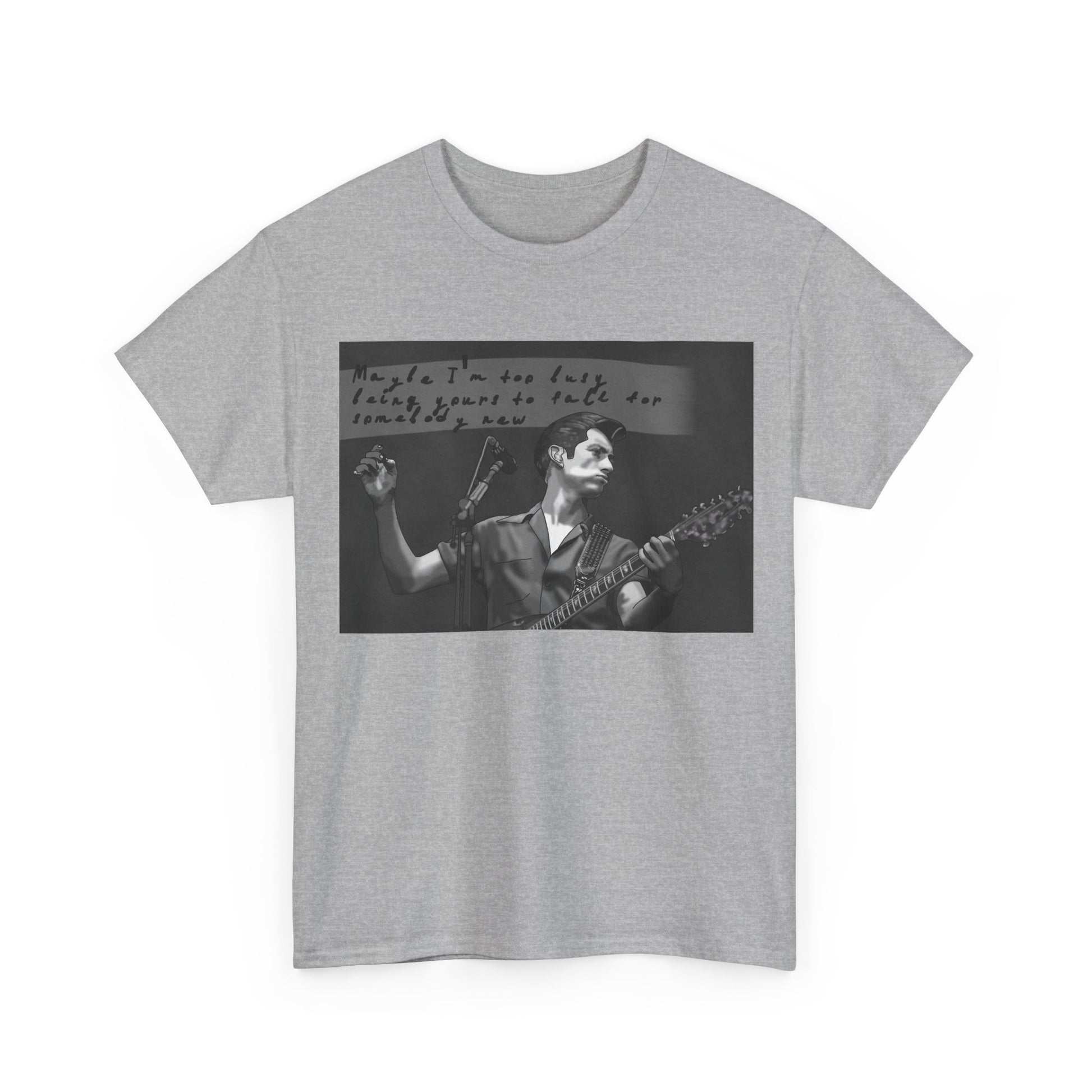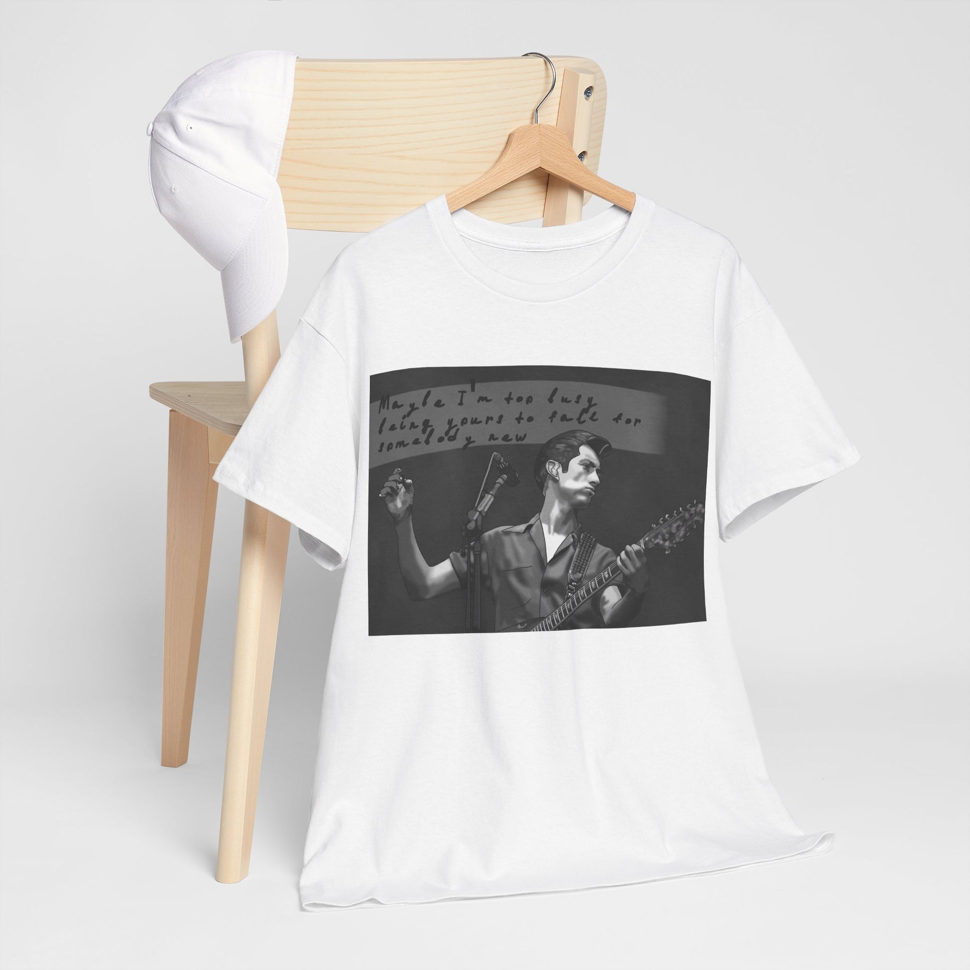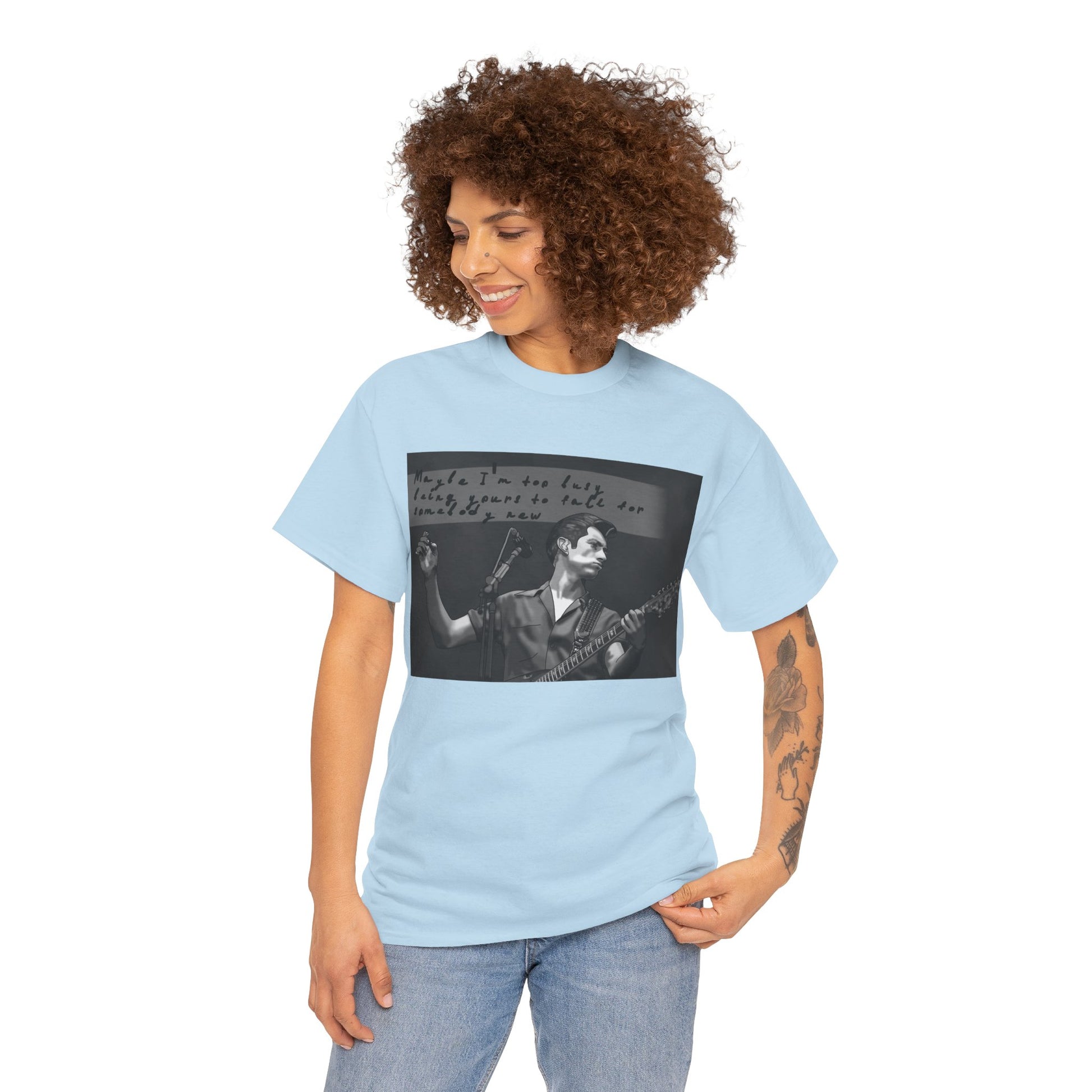 A soft, classic cotton tee that feels like a worn-in band shirt from day one. The front features a moody black-and-white photo of a guitarist mid-set with handwritten text above—an intimate snapshot that pulls you into late-night venues, cigarette smoke, and raw, honest performance. Lightweight but sturdy, the shirt sits relaxed on the shoulders and keeps its shape with a ribbed collar and shoulder tape. Wear it to record shops, basement shows, or when you want to carry that underground, nostalgic energy into everyday life.