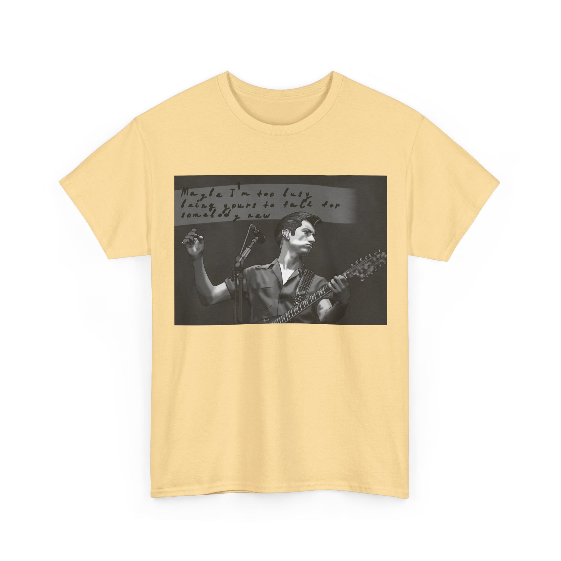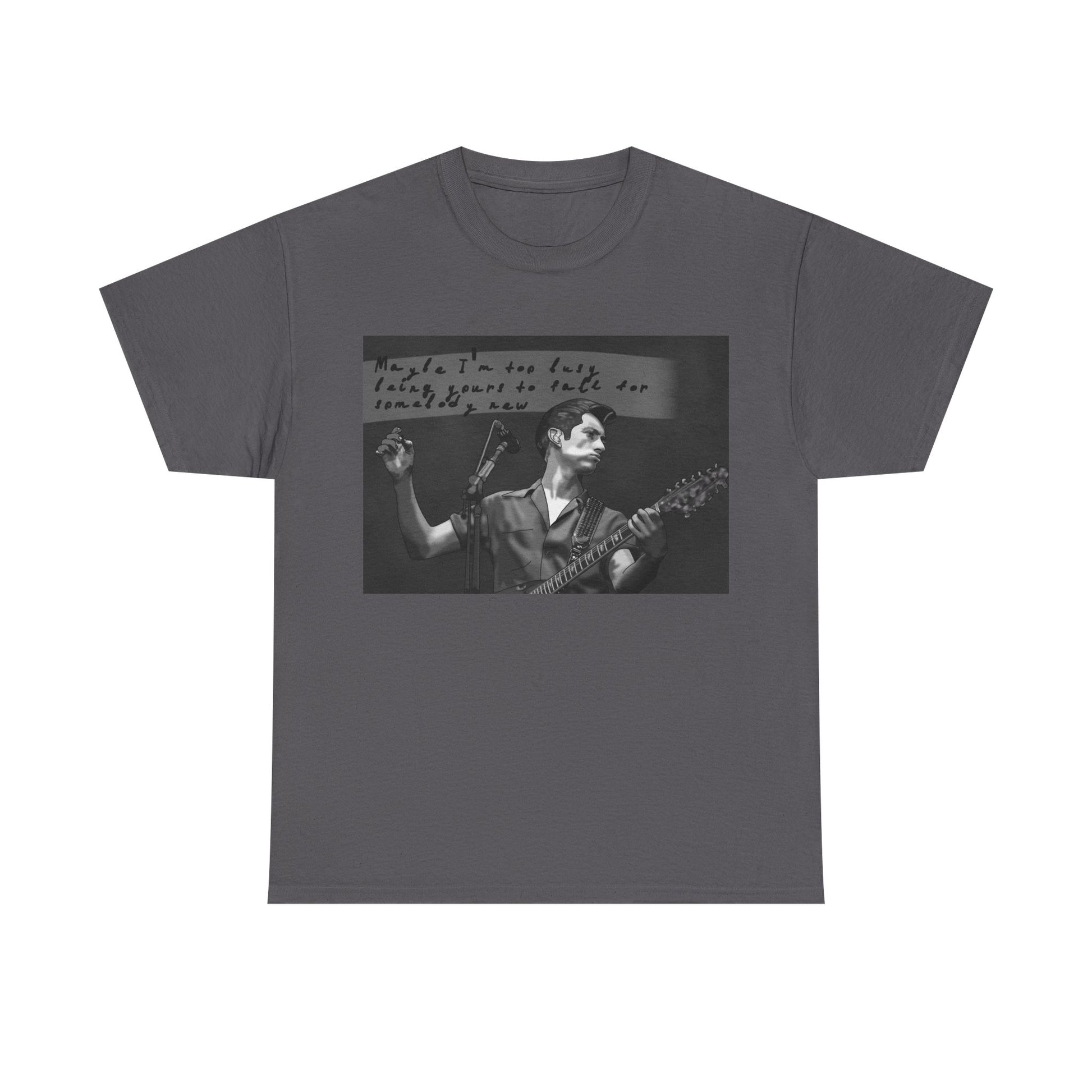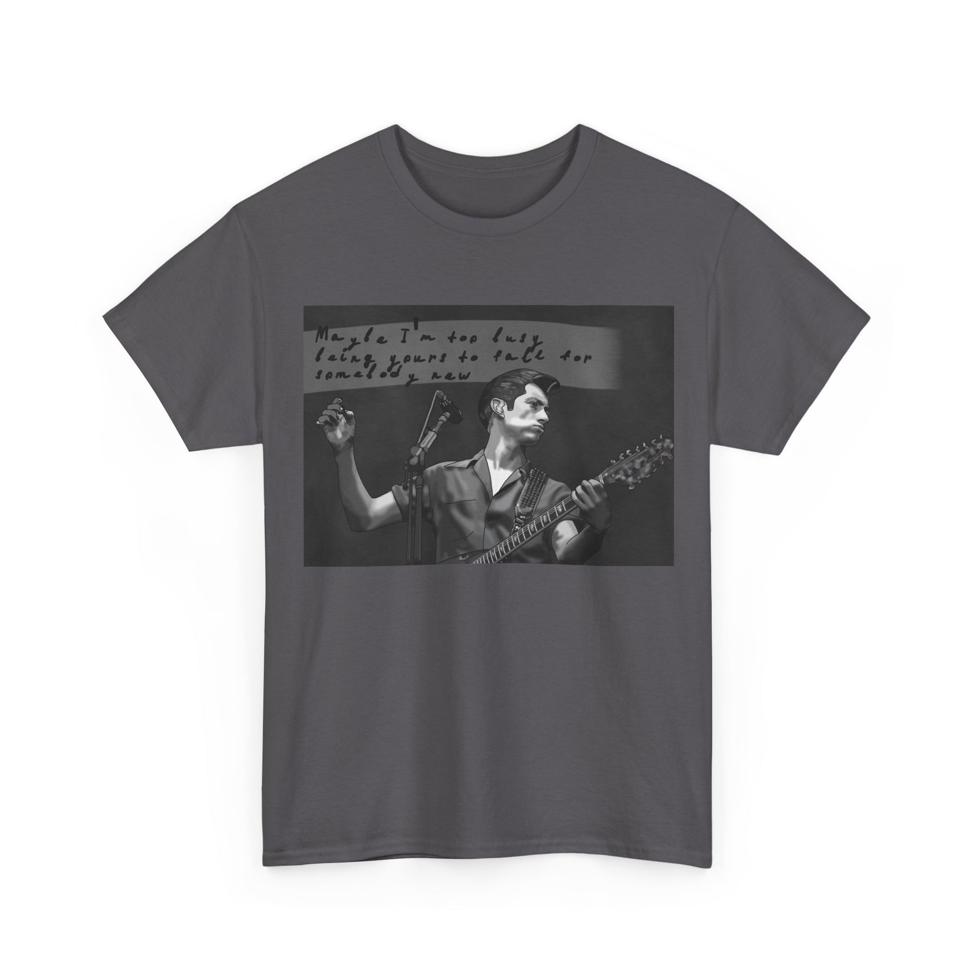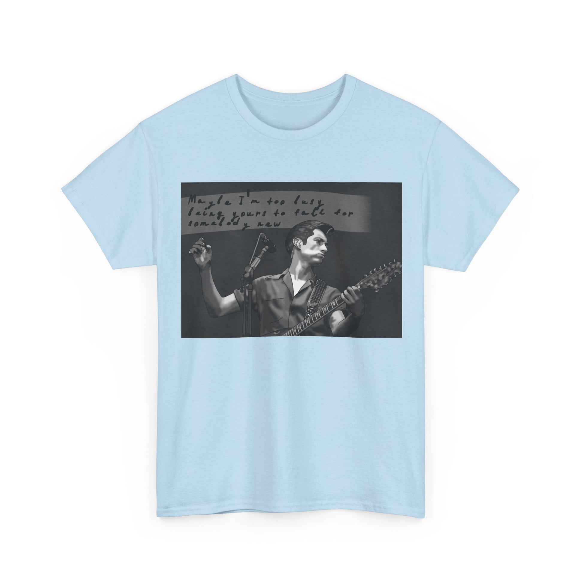 A soft, classic cotton tee that feels like a worn-in band shirt from day one. The front features a moody black-and-white photo of a guitarist mid-set with handwritten text above—an intimate snapshot that pulls you into late-night venues, cigarette smoke, and raw, honest performance. Lightweight but sturdy, the shirt sits relaxed on the shoulders and keeps its shape with a ribbed collar and shoulder tape. Wear it to record shops, basement shows, or when you want to carry that underground, nostalgic energy into everyday life.