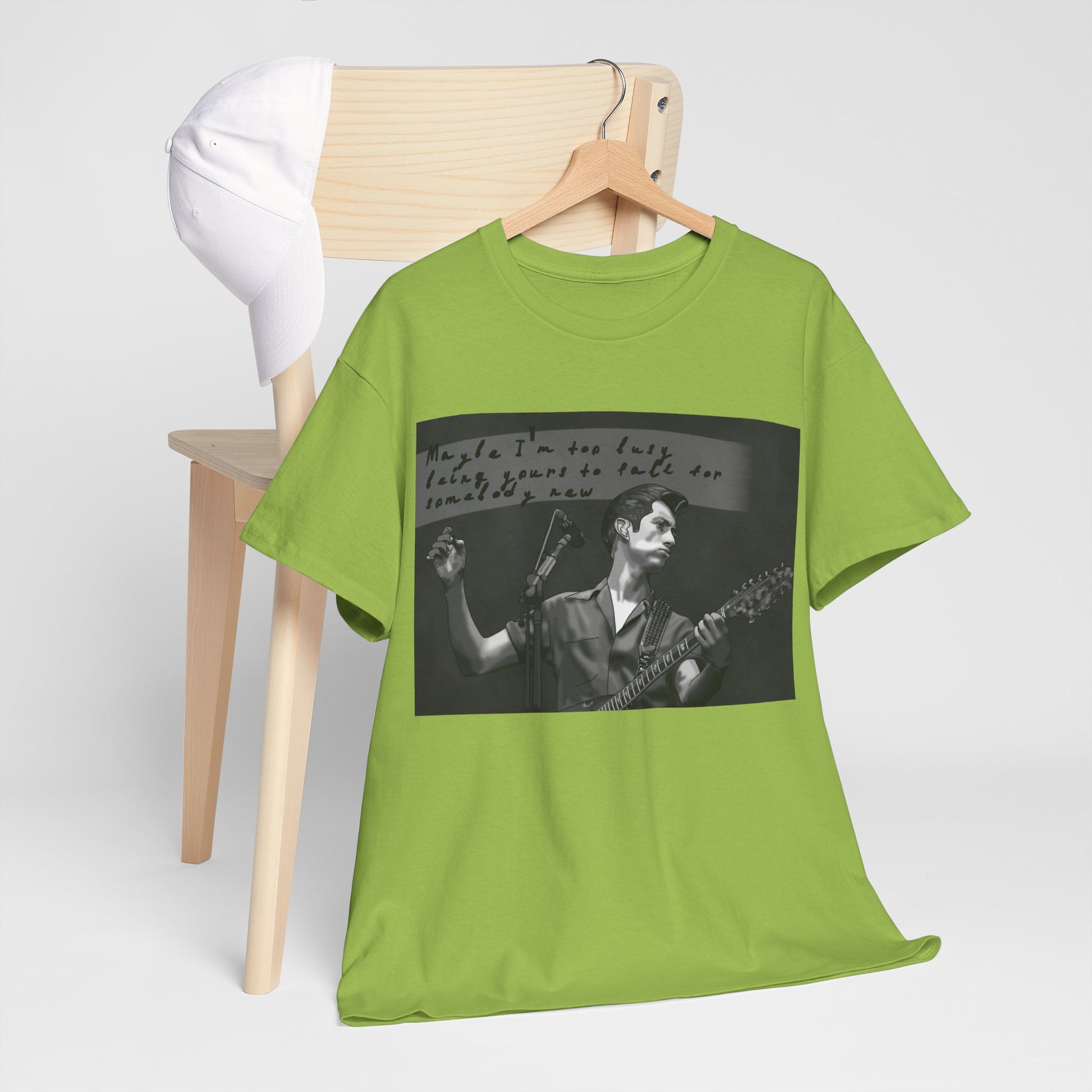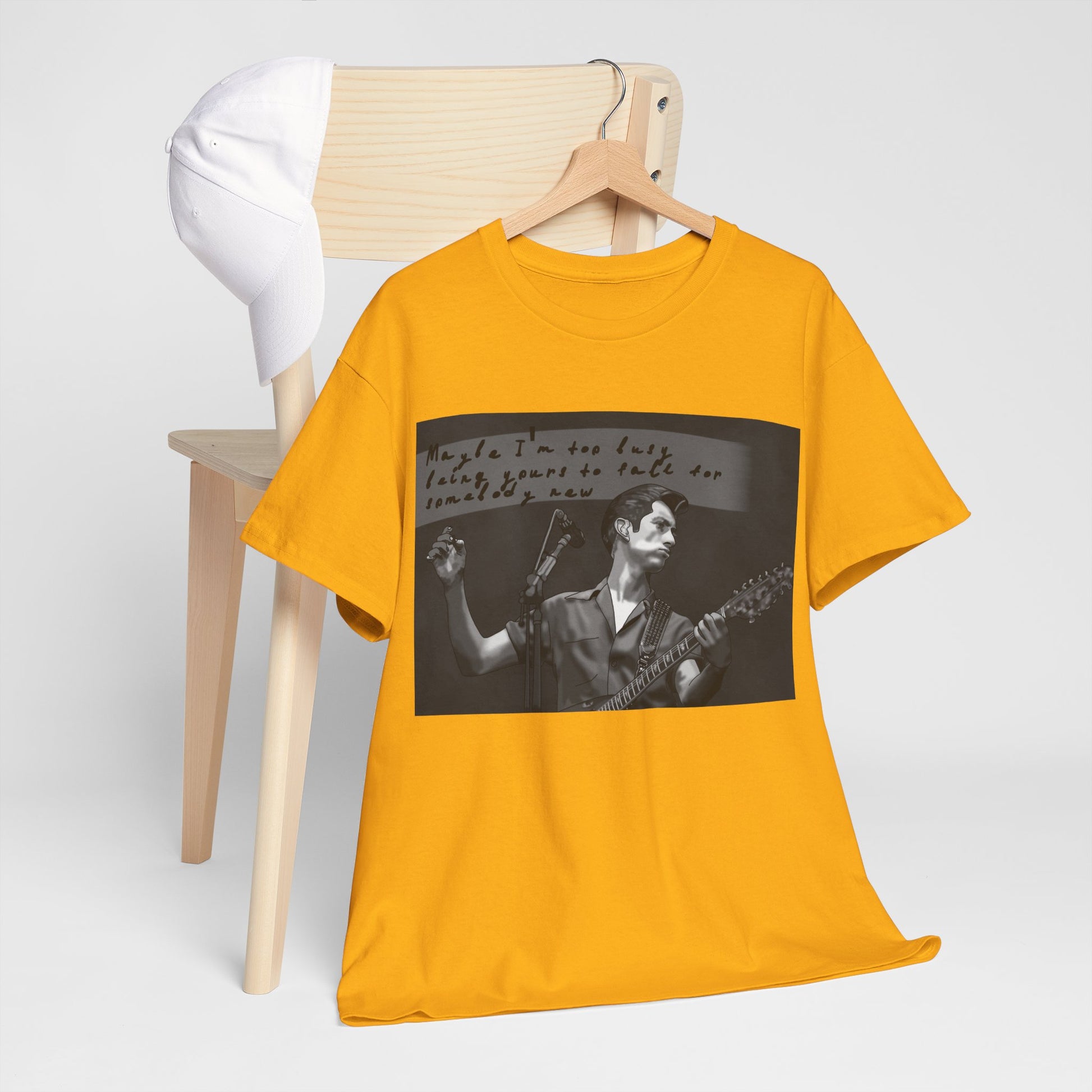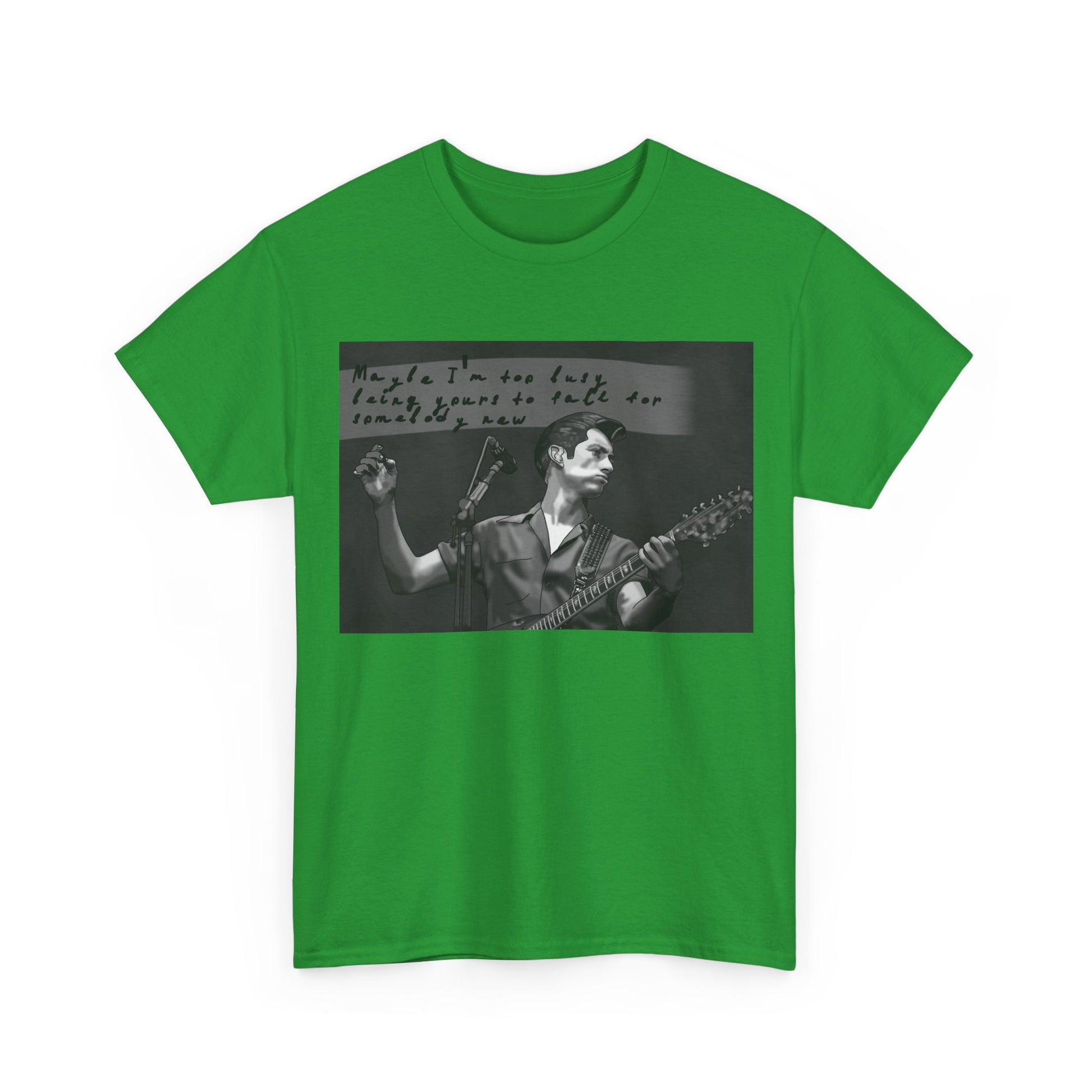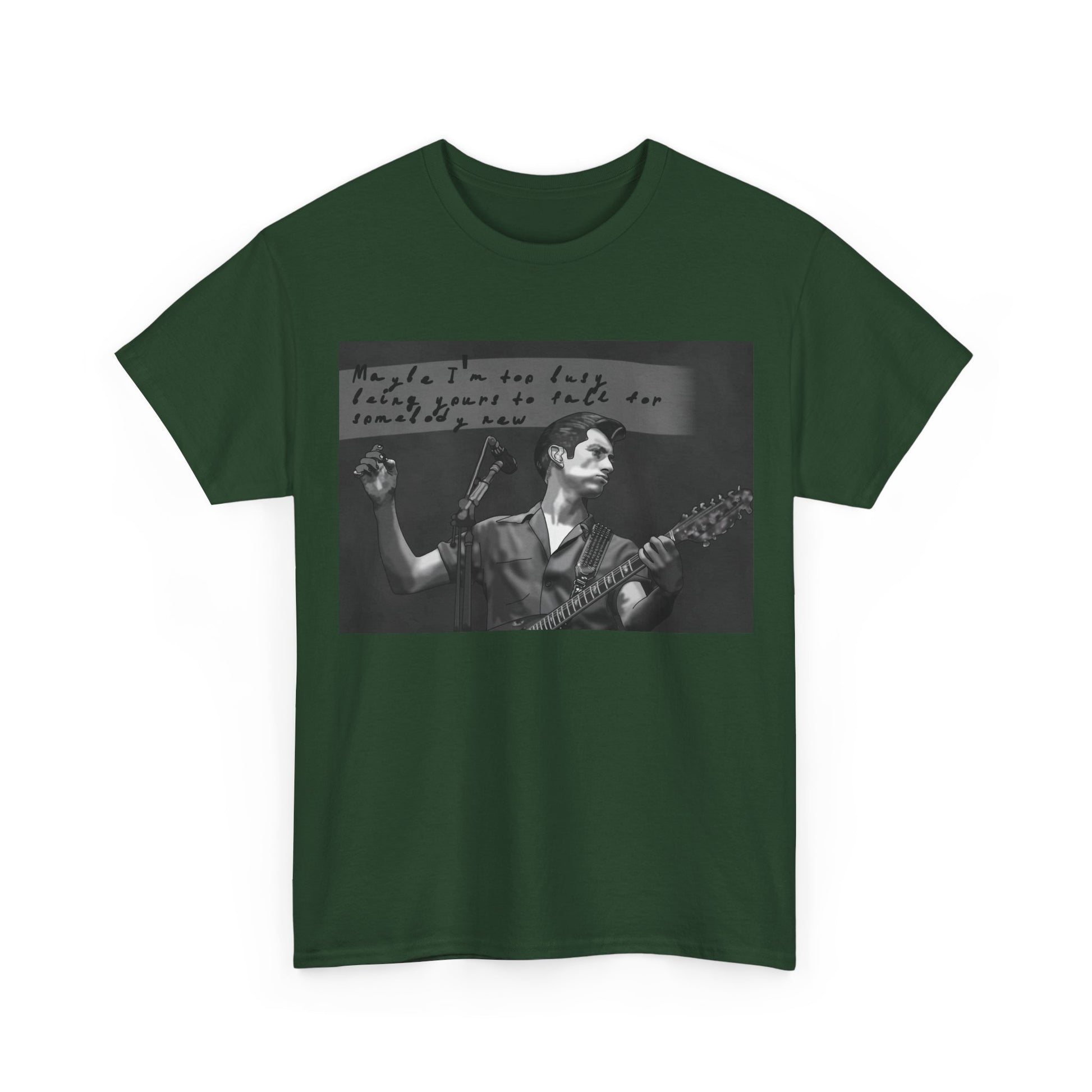A soft, classic cotton tee that feels like a worn-in band shirt from day one. The front features a moody black-and-white photo of a guitarist mid-set with handwritten text above—an intimate snapshot that pulls you into late-night venues, cigarette smoke, and raw, honest performance. Lightweight but sturdy, the shirt sits relaxed on the shoulders and keeps its shape with a ribbed collar and shoulder tape. Wear it to record shops, basement shows, or when you want to carry that underground, nostalgic energy into everyday life.