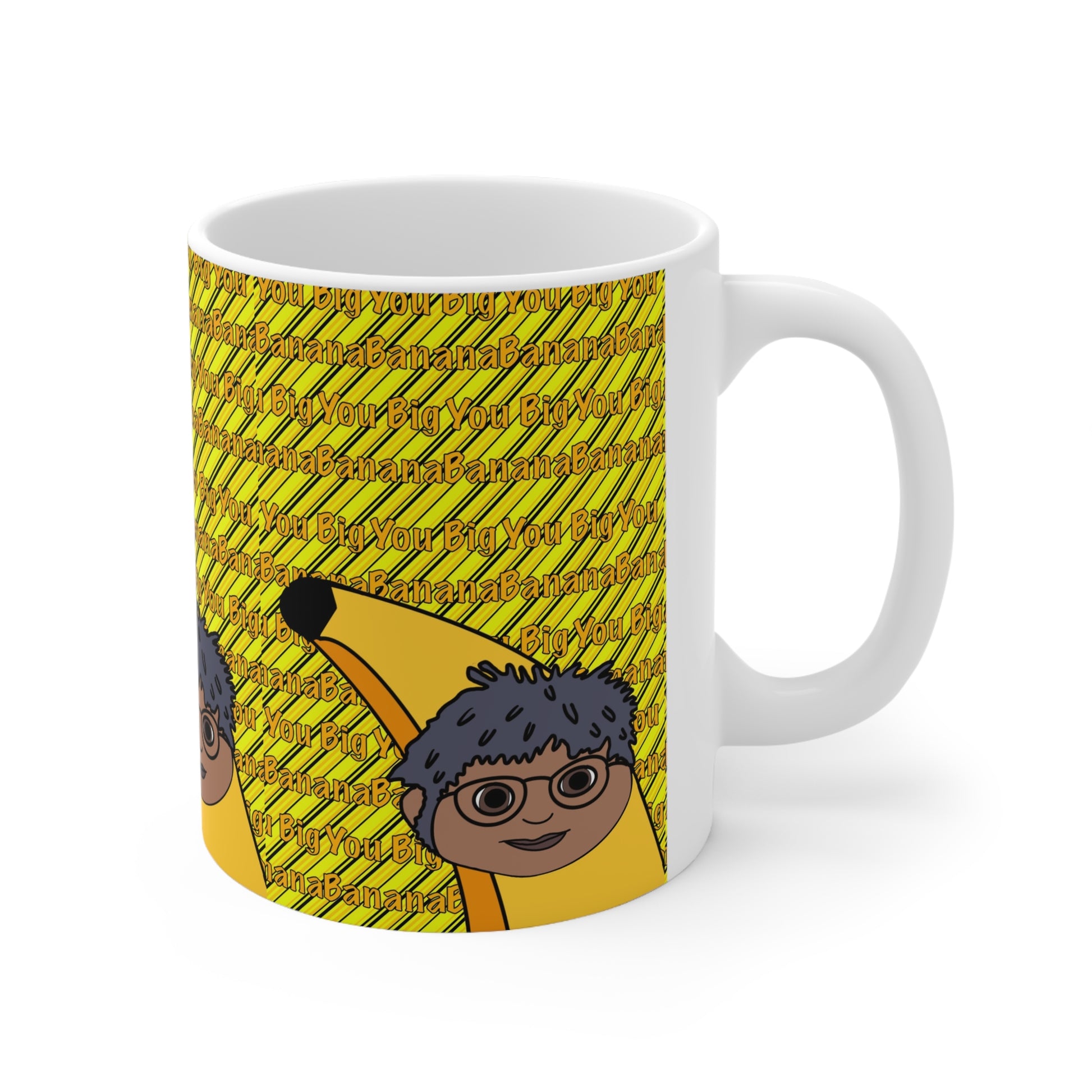 Bright, playful ceramic mug wrapped in a banana-saturated pattern and a smiling character in a banana suit. Morning coffee becomes a moment of joy — the cheerful yellow background and repeat motif bring a lighthearted, whimsical energy to the countertop. Solid glossy ceramic gives the colors a lively pop while the easy C-shaped handle and balanced weight make reaching for a second cup effortless. Use it on slow weekend mornings, during creative desk sessions, or as a cheerful companion through busy workdays — this mug turns an everyday ritual into something that feels a little more fun.