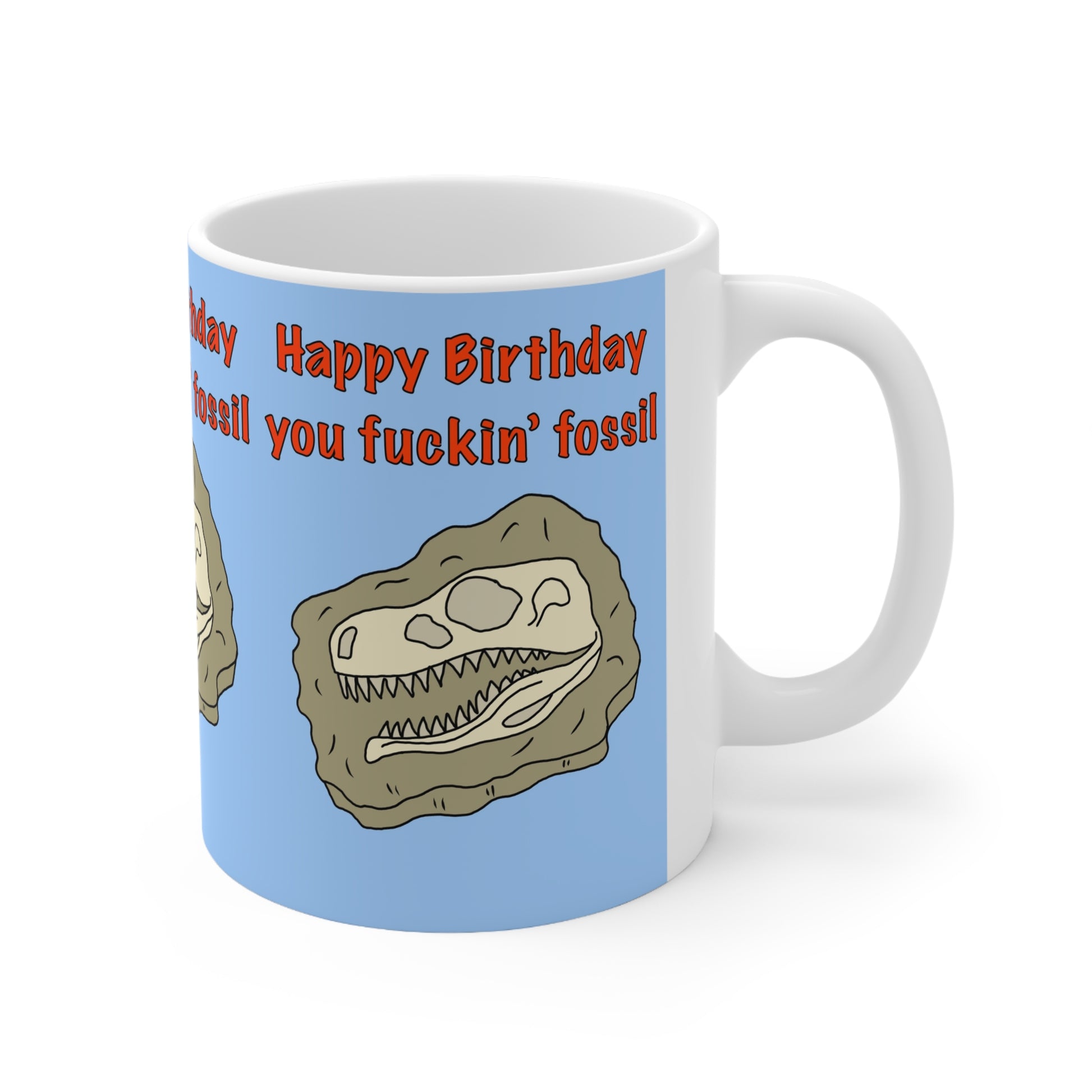 Birthday Mug — “Happy Birthday you fuckin’ fossil you” Funny Dinosaur Fossil Coffee Cup