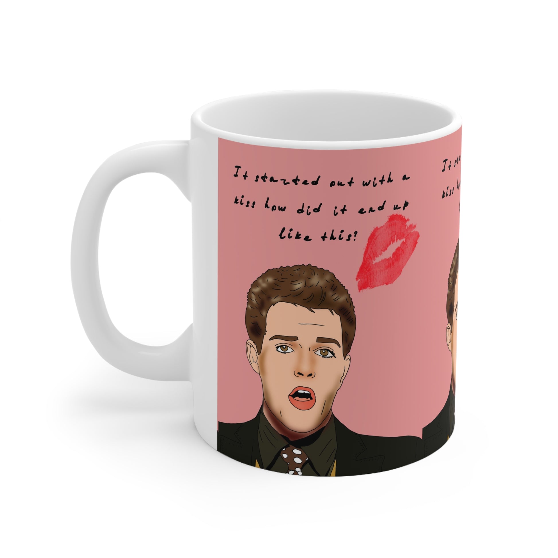 This glossy ceramic mug brings playful nostalgia and modern pop-art charm to slow mornings and late-night TV marathons. The wraparound design features an expressive illustrated face against a warm pink background, accented with lipstick kiss marks and handwritten-style text for a cheeky, conversational vibe. Comfortable to hold with a C-shaped handle, the mug is available in two sizes to match your coffee ritual — a compact 11oz for concentrated sips or a roomy 15oz when you need an extra pour. Durable ORCA coating and vibrant printing keep the colors crisp over time, while microwave and dishwasher safety make it easy to live with. It suits fans of quirky, character-driven art and anyone who likes their drinkware to spark a smile and start a conversation.