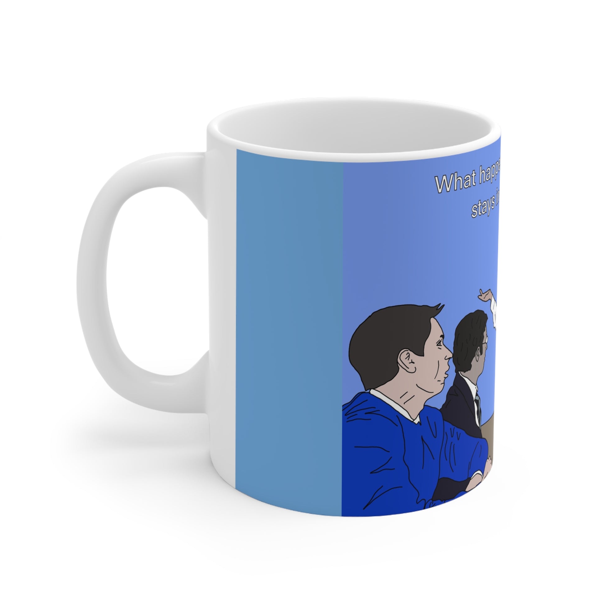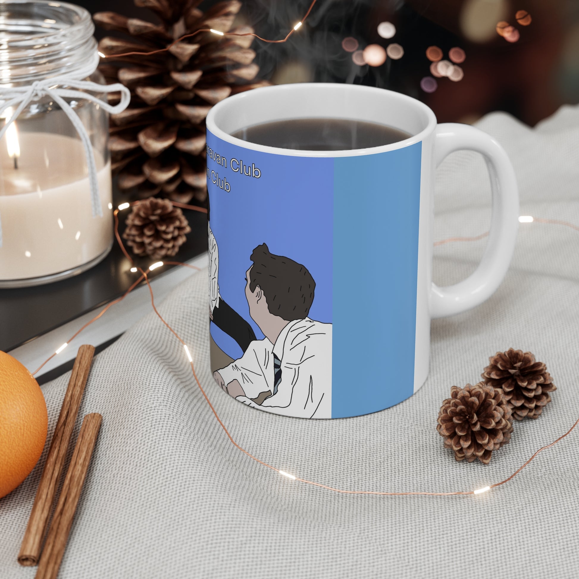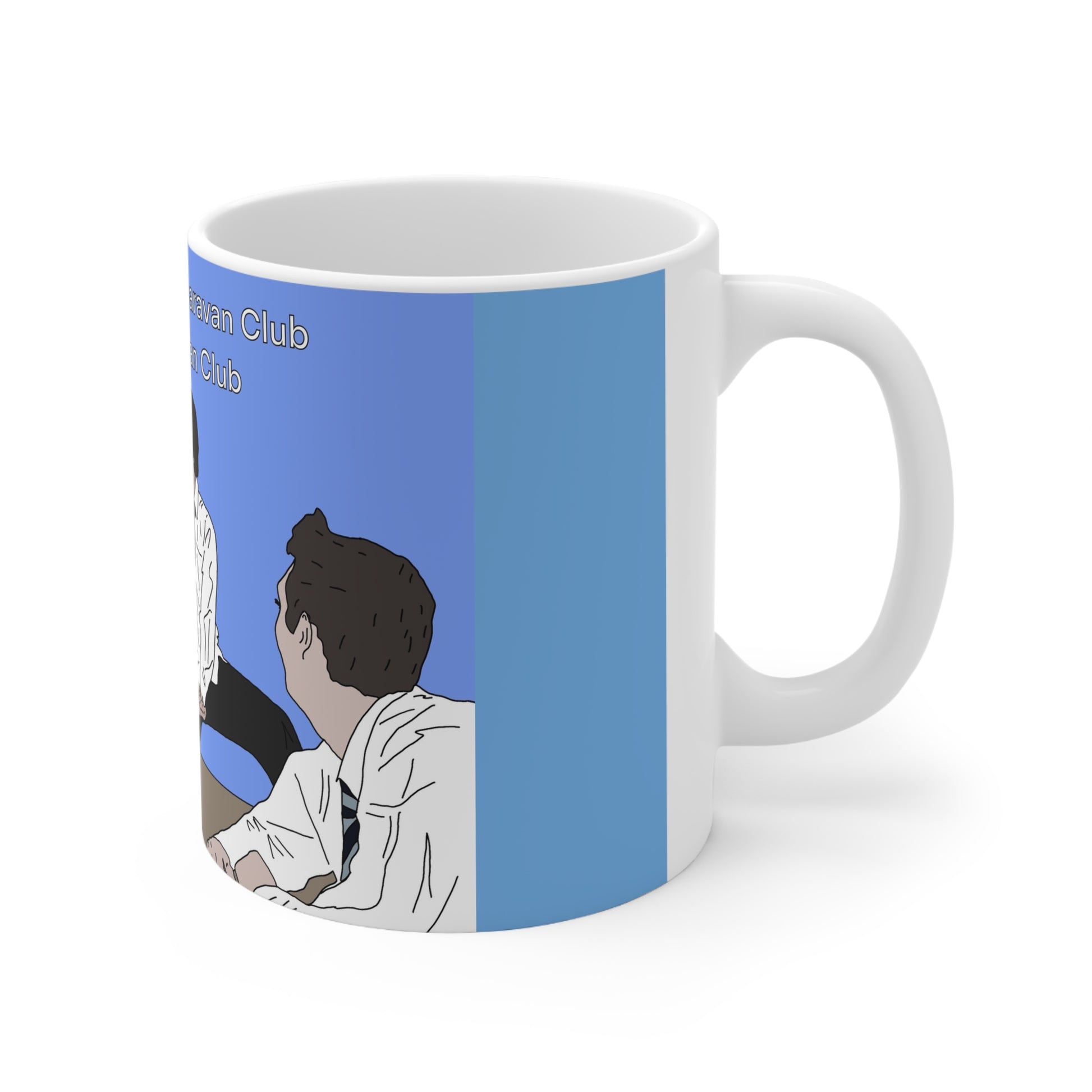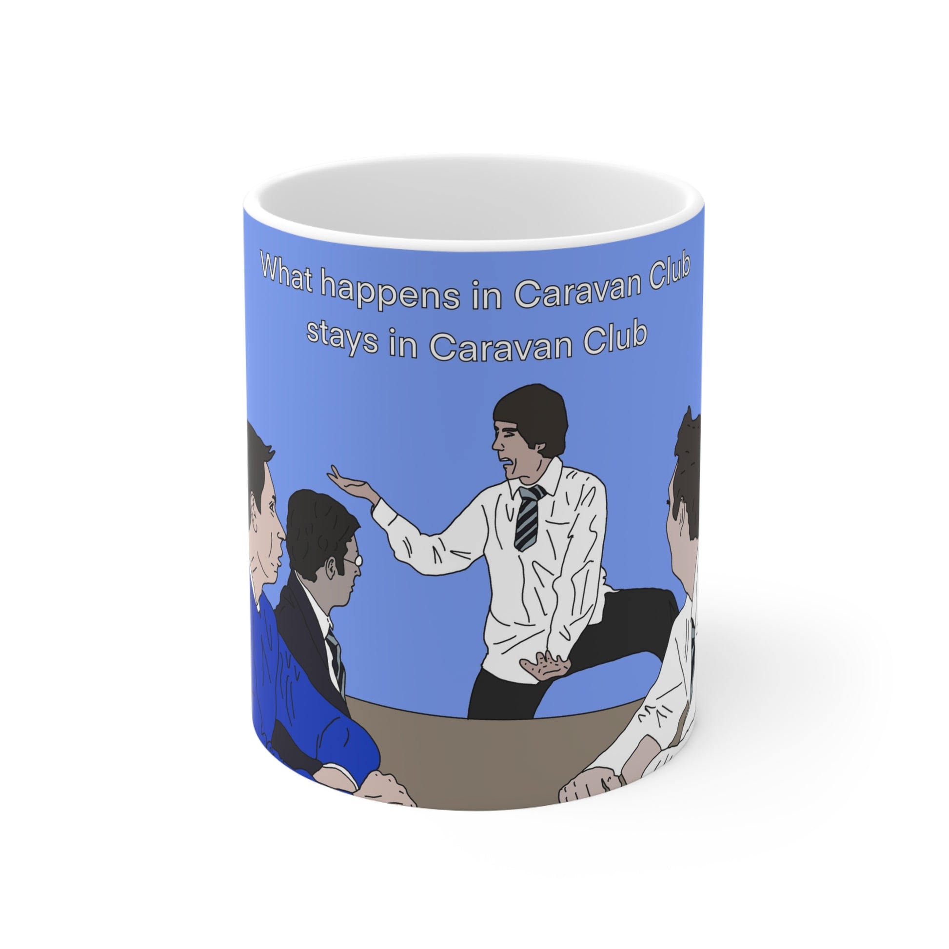 Bright white ceramic mug featuring a playful illustrated scene of people gathered around a table and the cheeky line, “What happens in Caravan Club stays in Caravan Club.” The glossy ORCA-coated print gives the colors a crisp, saturated look that holds up to microwave and dishwasher use. The C-shaped handle feels steady in hand while the 11oz or 15oz capacity holds a generous pour of coffee, tea, or late-night brew. This mug brings a lighthearted, conversational energy to your morning routine or to shared moments at the office — a small, durable piece that sparks smiles and inside jokes.
