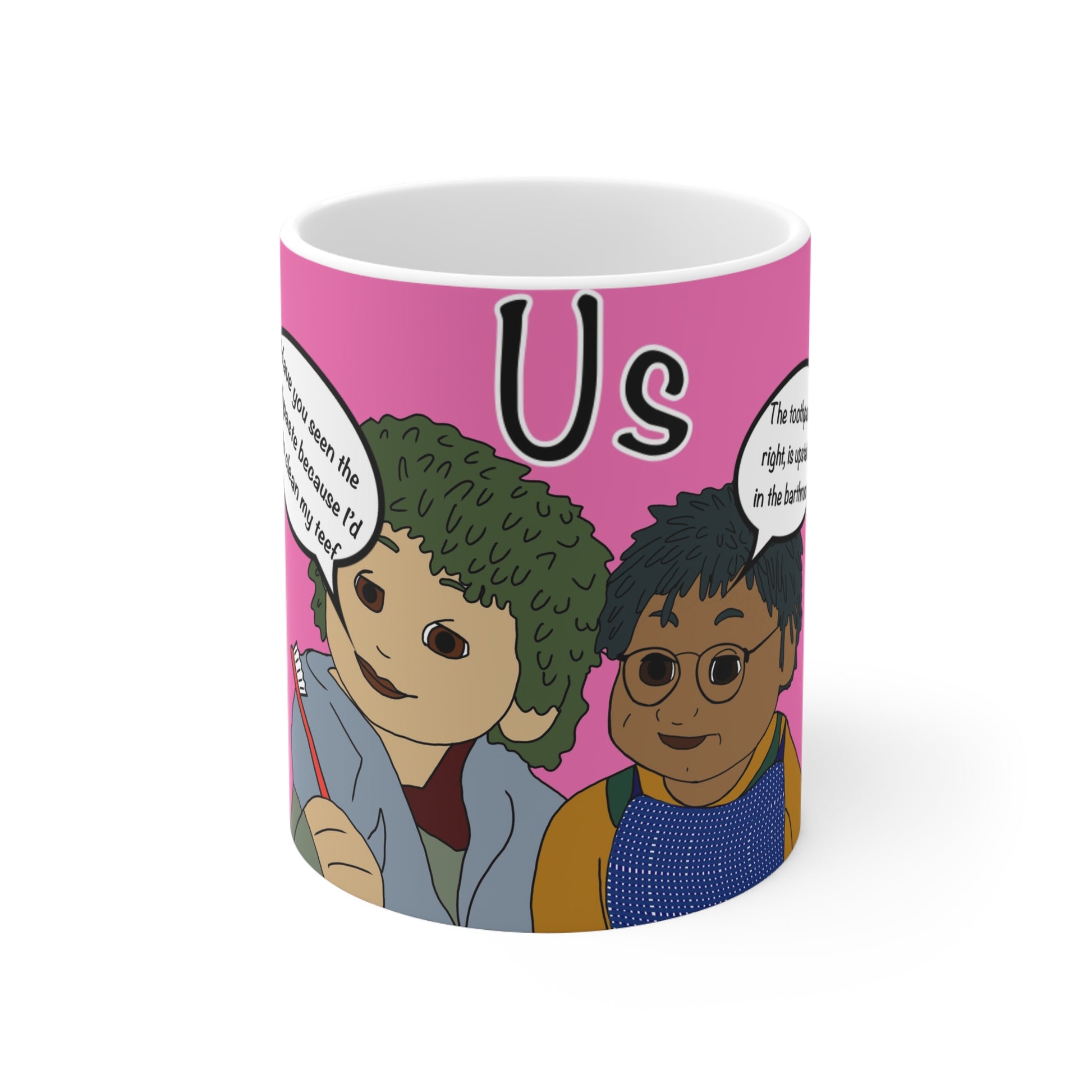Bright, glossy ceramic mug that brings a little comic-book warmth to everyday mornings. The wraparound artwork shows two friendly characters chatting on a bold pink background — a small, humorous speech bubble adds personality and a sense of shared moments. Lightweight but sturdy, the mug’s smooth ORCA-coated surface keeps colors vivid wash after wash. Sip coffee, tea, or cocoa while enjoying a private smile or sharing a laugh with friends; this cup feels like a tiny, cheerful conversation starter on your counter or desk.