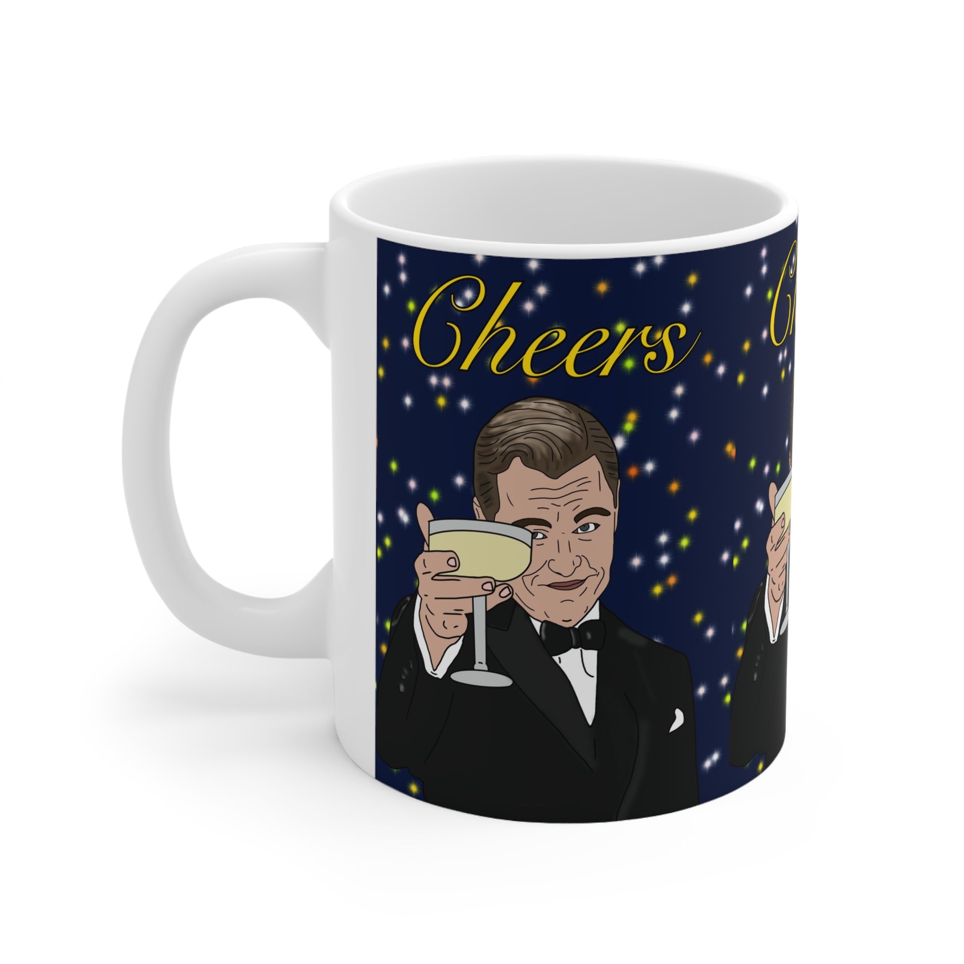 A glossy ceramic mug that brings a little evening sparkle to quieter moments. The wraparound illustration shows a dapper figure raising a glass against a confetti-like starfield, with the word “Cheers” in warm script. Hold it in a C-shaped handle as steam curls from a fresh brew or hot chocolate. The vivid print pops against the deep navy background and stays bright after regular use. It’s made for slow mornings, cheeky toasts, and those easy, celebratory pauses between busy days.