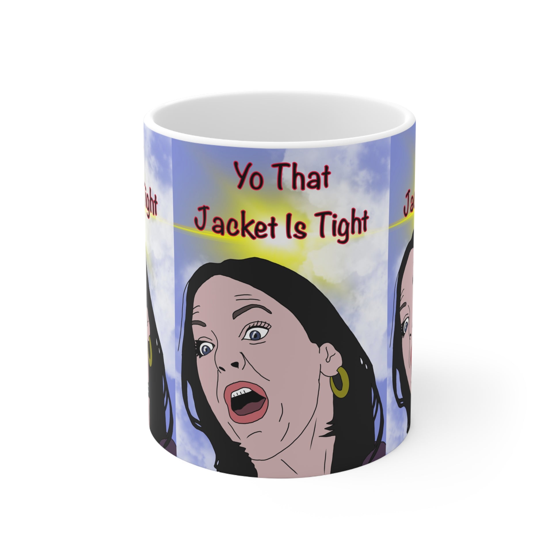 This glossy ceramic mug brings bold humor and bright color to your morning routine. A stylized, expressive face and the playful phrase “Yo That Jacket Is Tight” wrap around the mug against a soft cloud-like background, making every sip feel like shared laughter with a friend. The vivid print stays sharp thanks to ORCA coating, and the comfortable C-shaped handle makes it easy to hold while you enjoy coffee, tea, or whatever fuels your day. It’s crafted for everyday use — microwave and dishwasher safe, lead- and BPA-free — so the design can be part of your table for years of mornings and casual get-togethers.