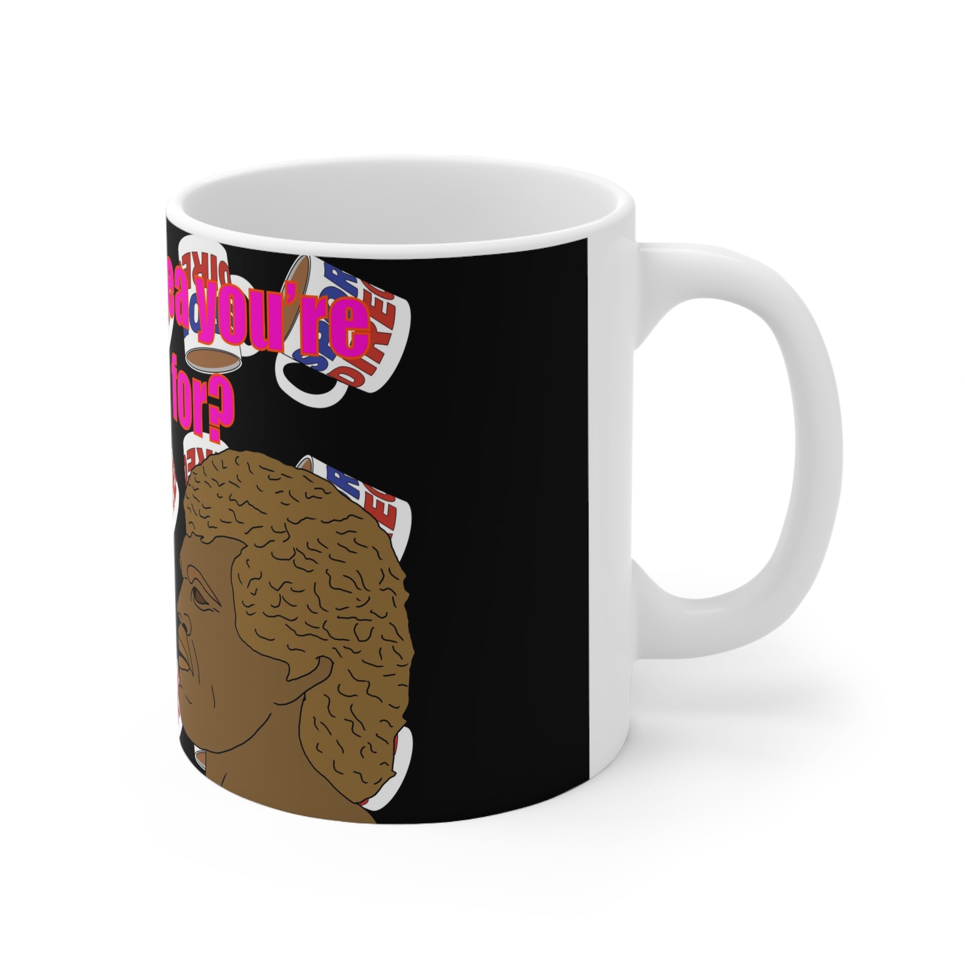 This glossy white ceramic mug brings playful nostalgia and bold personality to your morning routine. Illustrated faces and floating coffee cups wrap the surface in vibrant, high-contrast color—accented by bright pink text that pops against the black background. It feels like a lively conversation over a fresh pour: cheeky, confident, and a little irreverent. The comfortable C-shaped handle and smooth rim make every sip easy, while the durable ORCA coating keeps the printed art vivid through daily use. Choose 11oz for a standard cup or 15oz when you need an extra pour; both sizes are microwave- and dishwasher-safe and made from lead- and BPA-free ceramic.