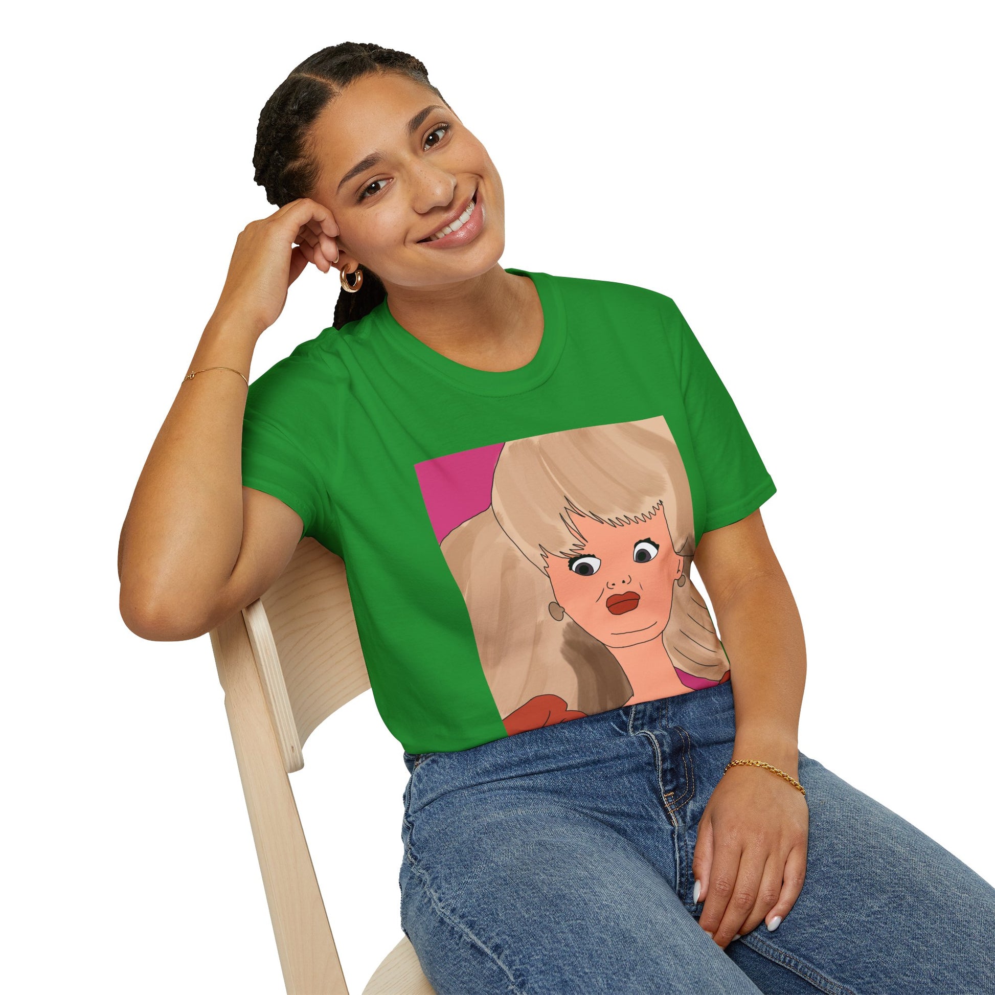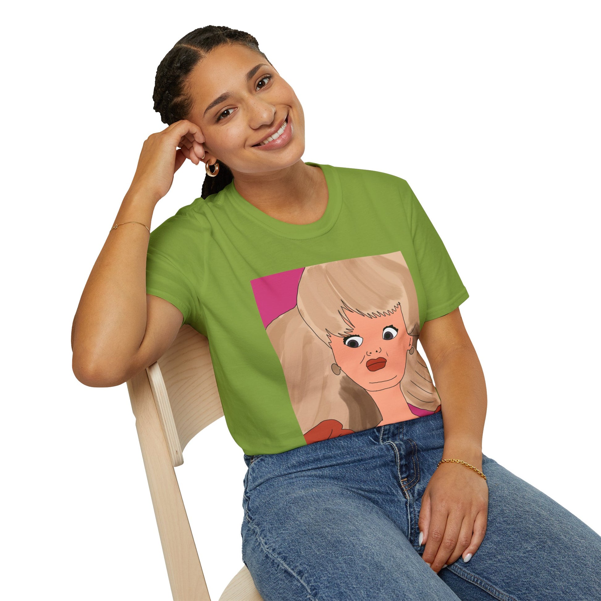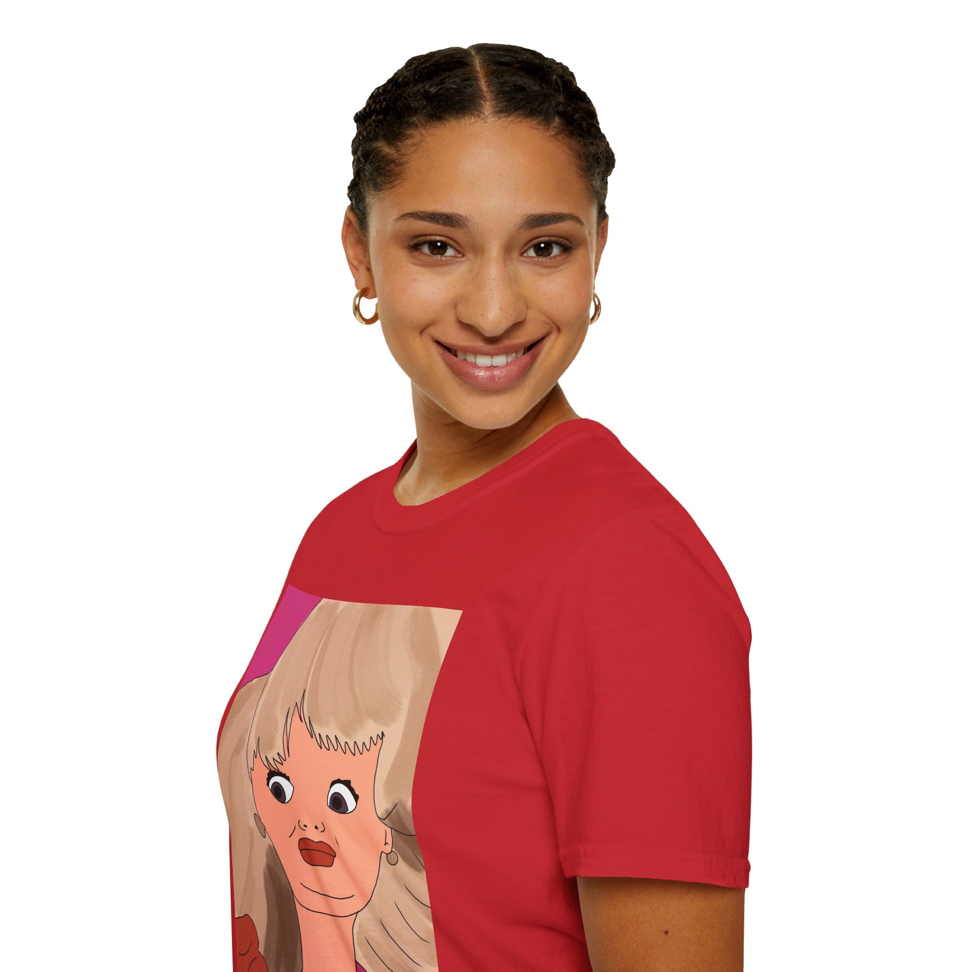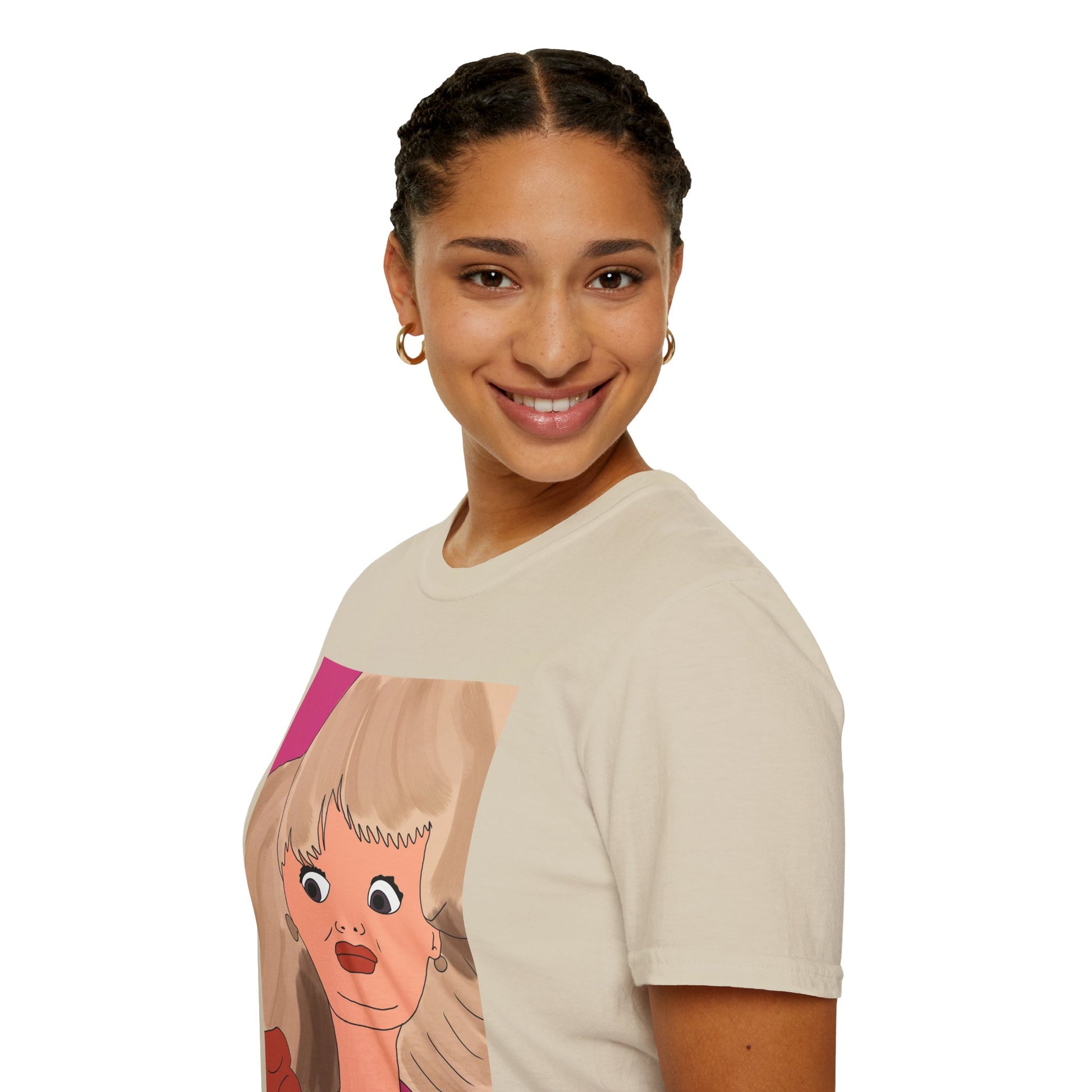 This lightweight cotton tee features a bold, retro-inspired portrait print in warm coral and rose tones. The oversized illustration across the chest channels playful vintage glam—big hair, dramatic lashes, and a confident stare—that reads like a pop-art daydream. Wear it to add an instant statement to simple jeans, under a blazer for an artsy edge, or layered for weekend strolls. The soft, breathable fabric and classic crew silhouette keep the focus on the art while staying comfortable all day.