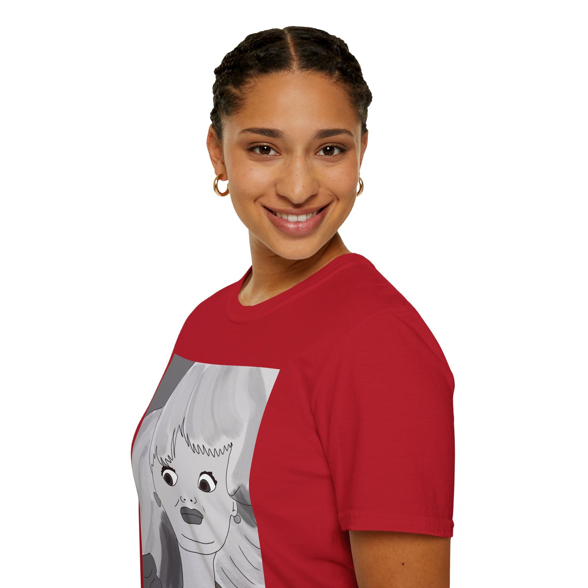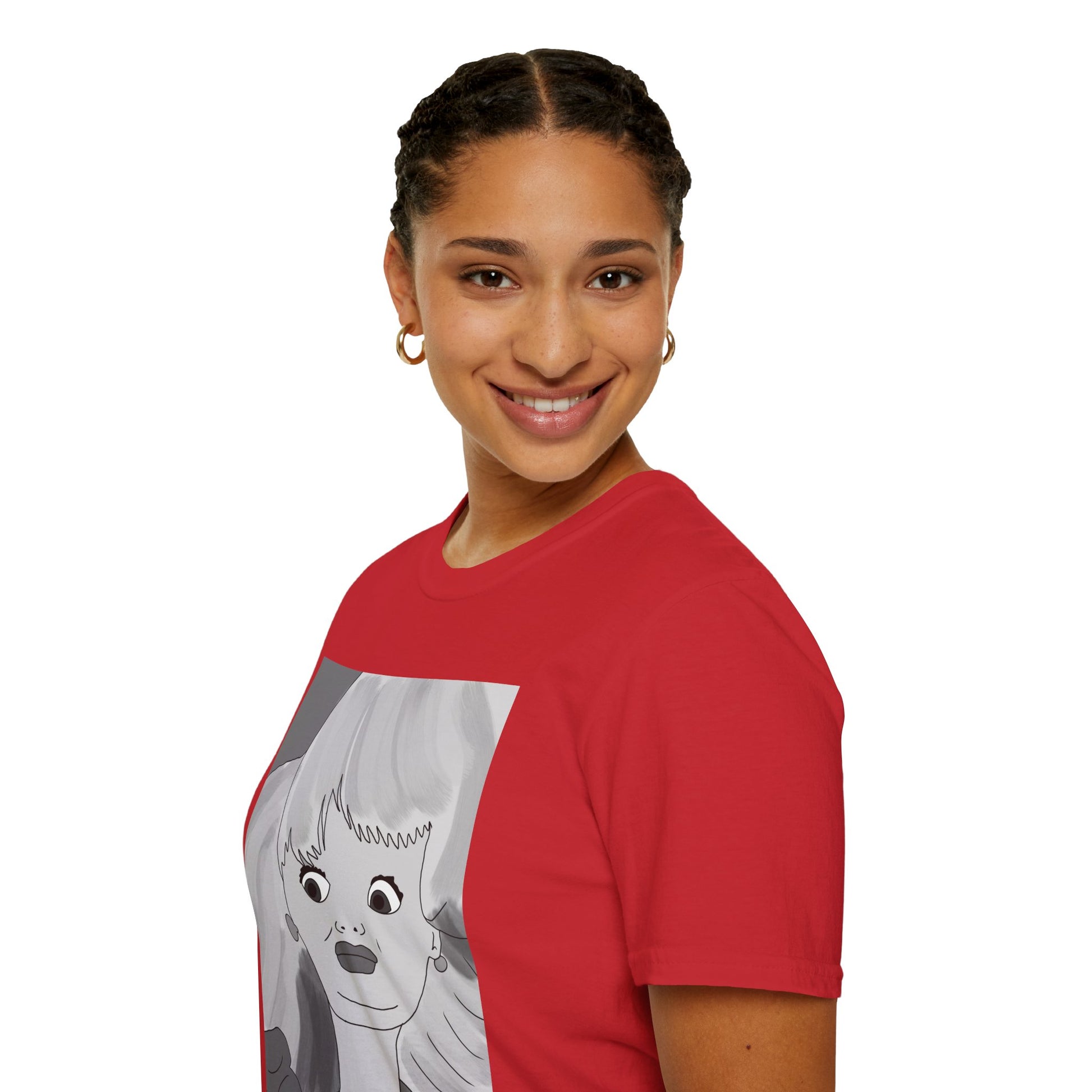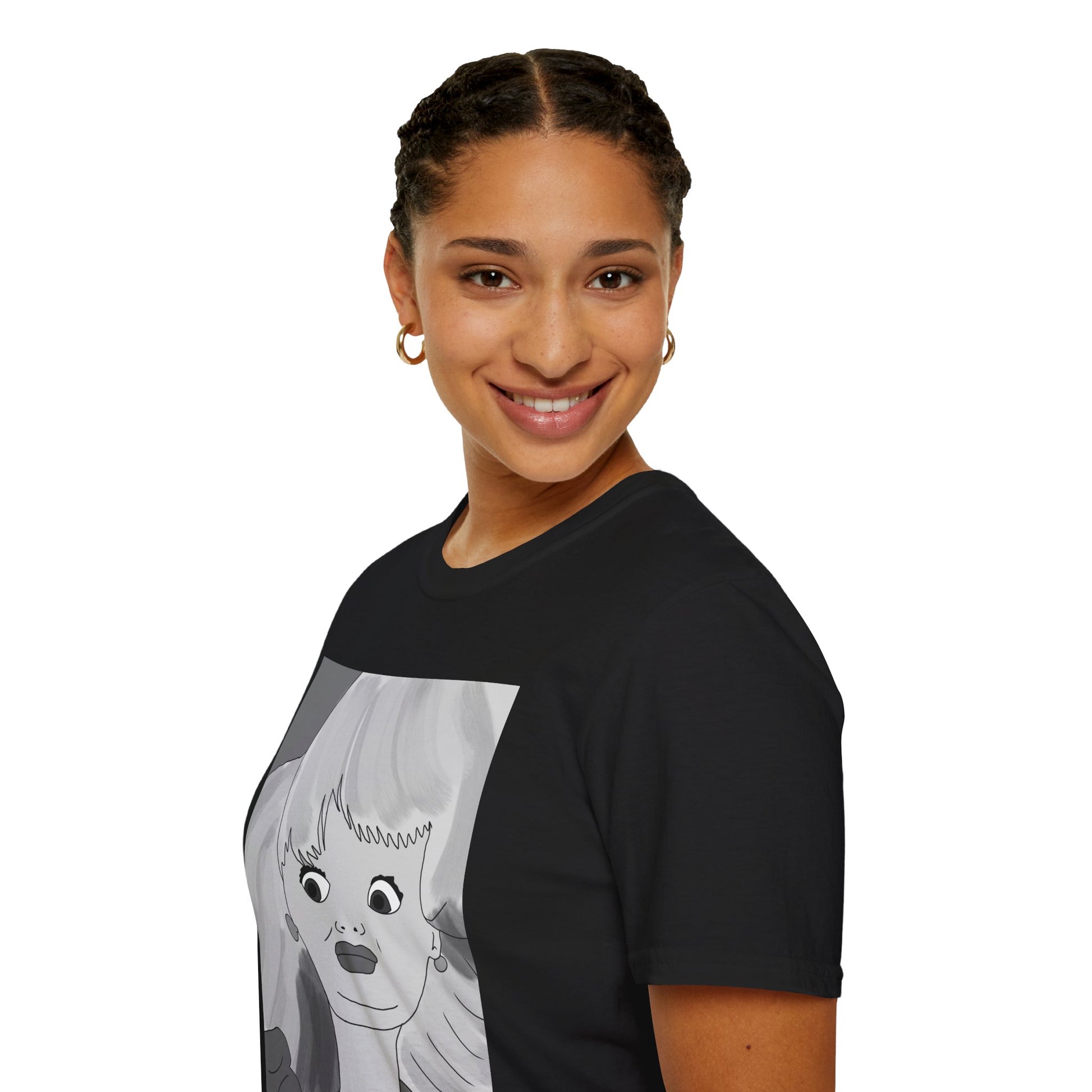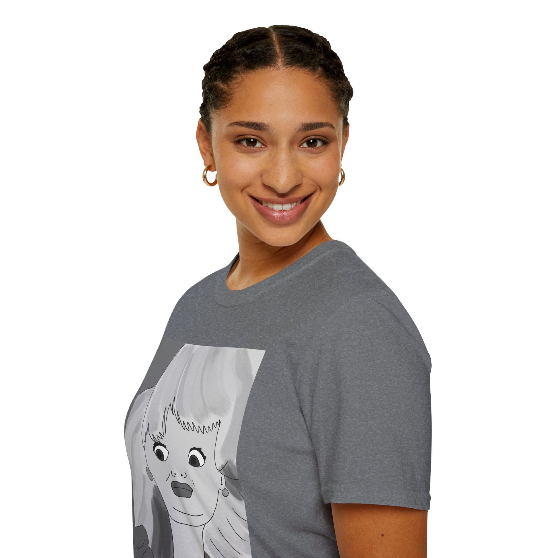 This lightweight cotton tee carries a bold, illustrated portrait that reads like a page from an indie comic — wide-eyed, stylish, and slightly uncanny. The clean crew neckline and classic fit let the artwork take center stage while the soft ring-spun cotton keeps it easy to wear all day. Wear it when you want your outfit to feel like a statement: casual gallery nights, relaxed coffee shop afternoons, or wandering city streets with friends. The graphic’s monochrome palette pairs well with layered jackets, high-waisted jeans, or a minimalist tote. It’s for people who collect visual stories and want their clothing to start a conversation without shouting.