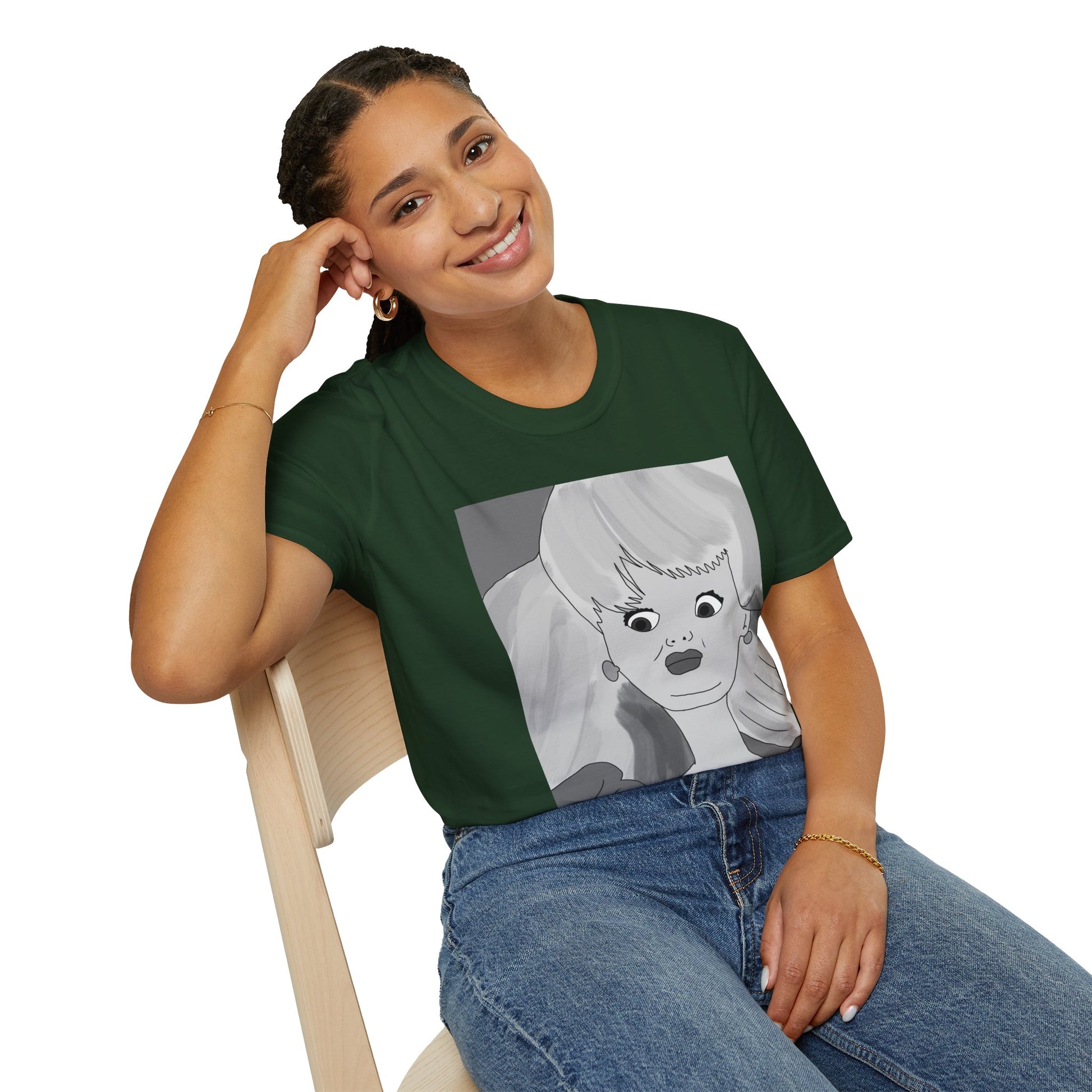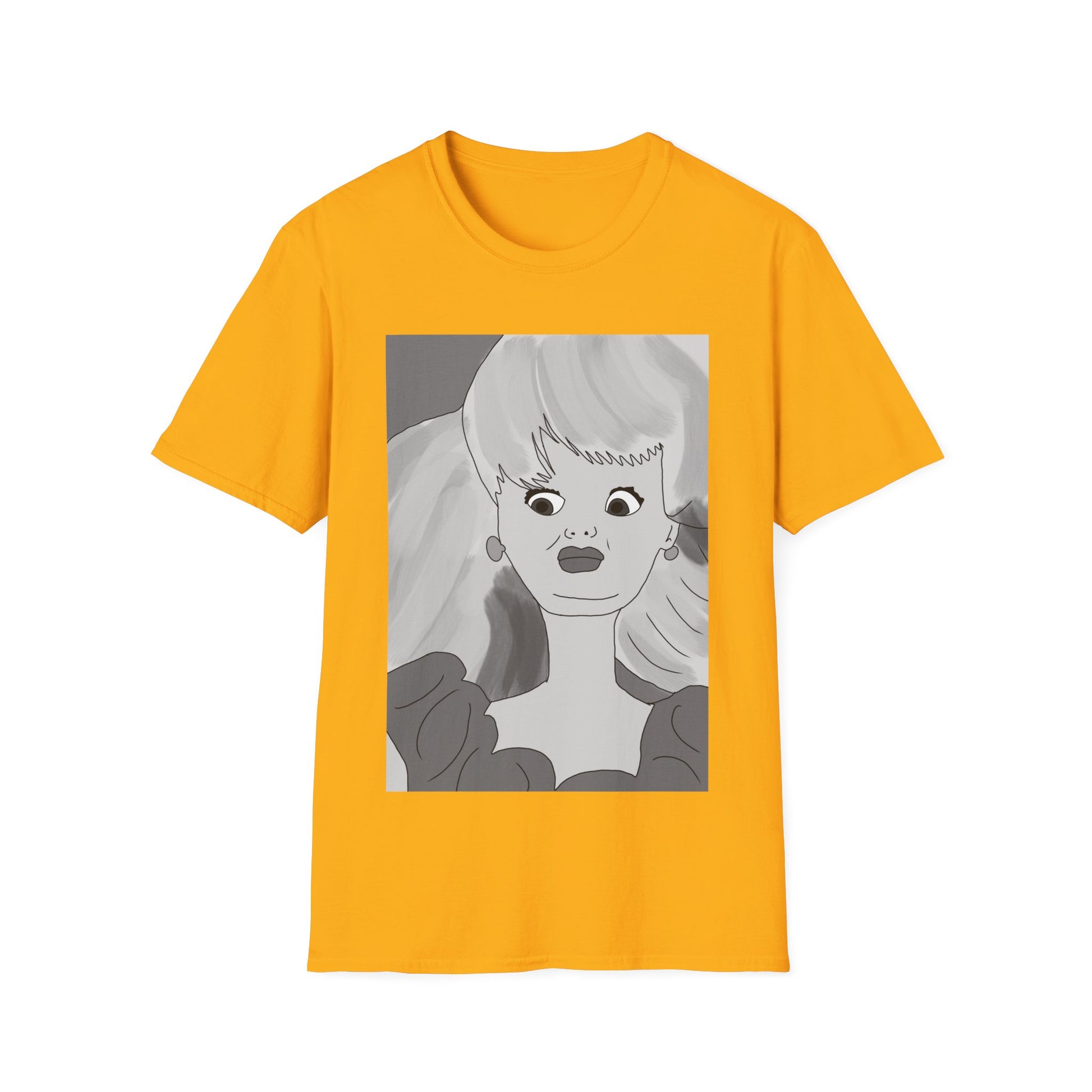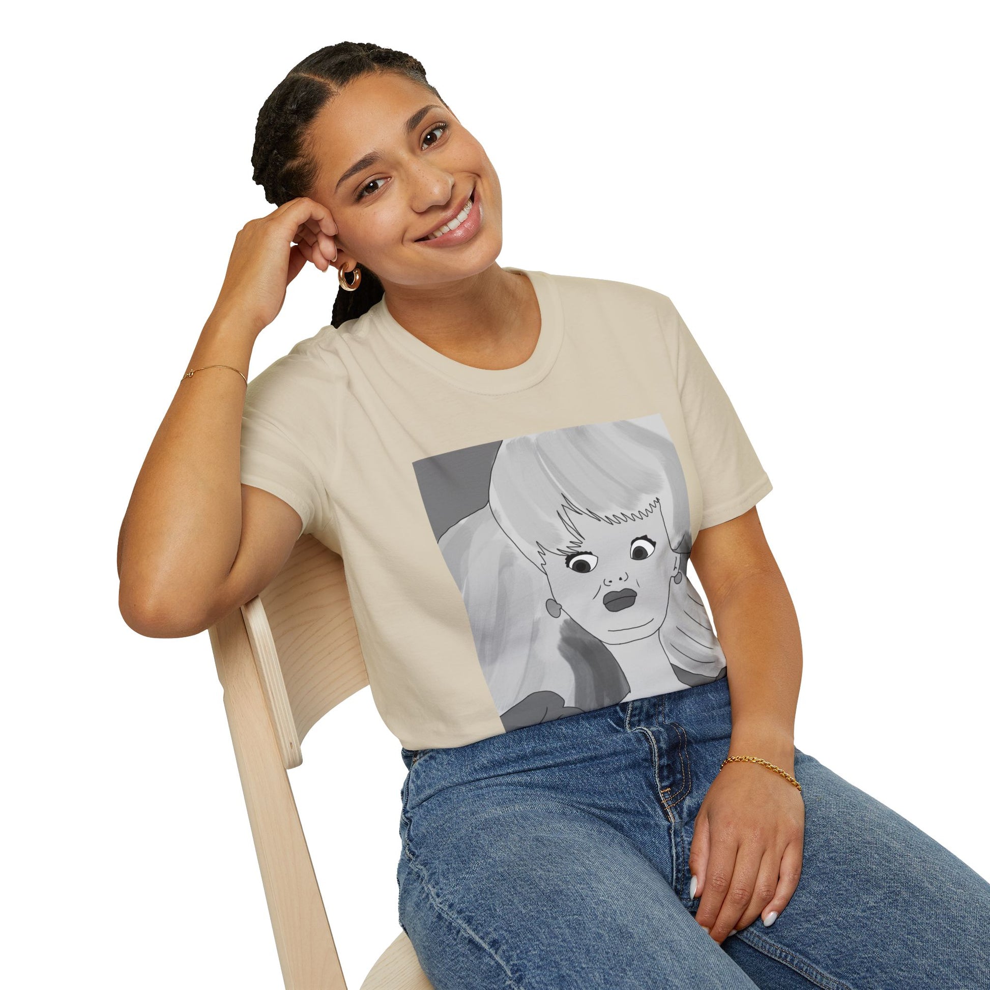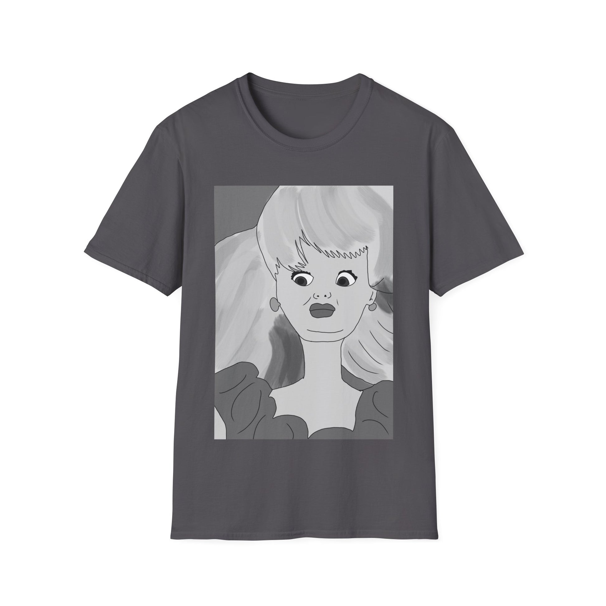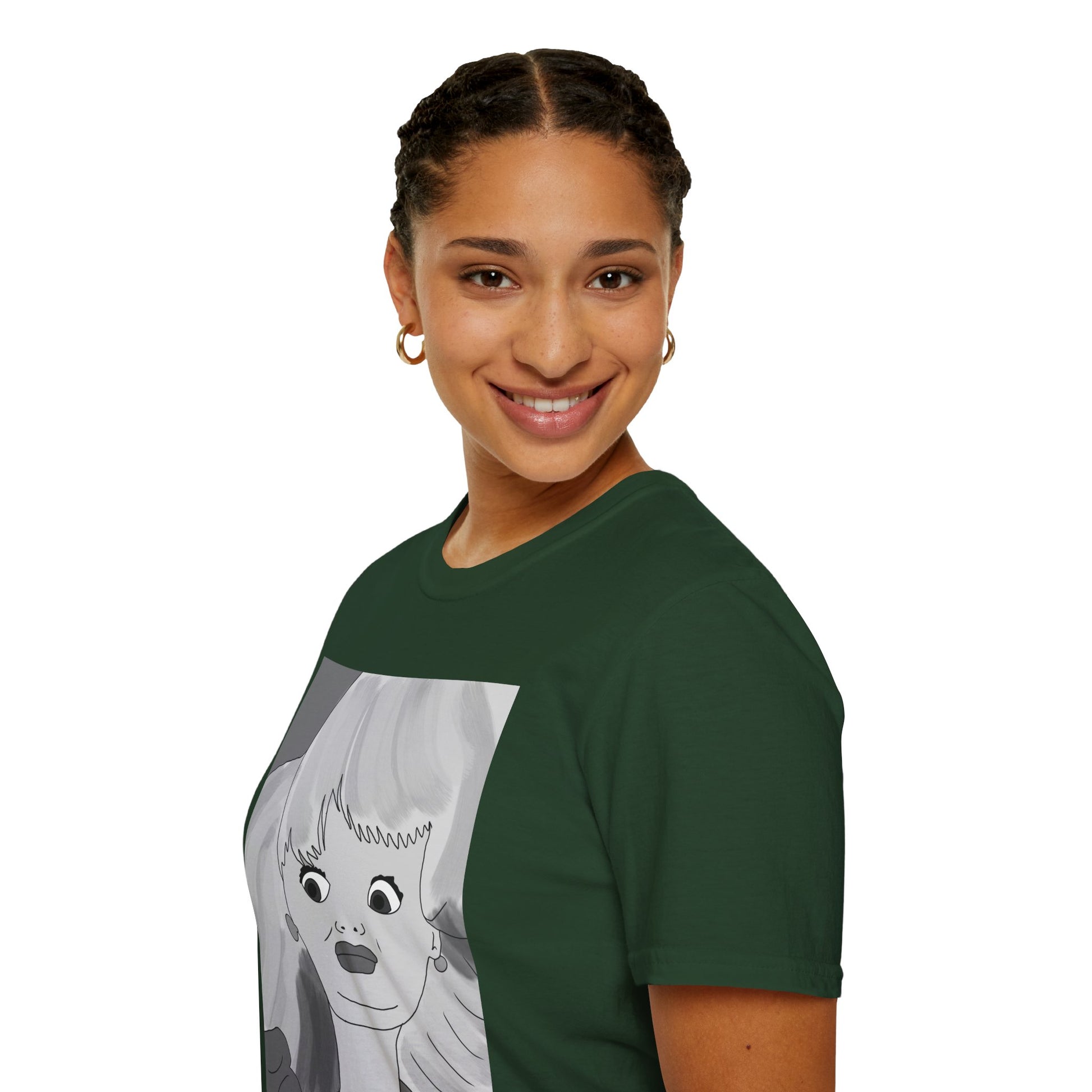 This lightweight cotton tee carries a bold, illustrated portrait that reads like a page from an indie comic — wide-eyed, stylish, and slightly uncanny. The clean crew neckline and classic fit let the artwork take center stage while the soft ring-spun cotton keeps it easy to wear all day. Wear it when you want your outfit to feel like a statement: casual gallery nights, relaxed coffee shop afternoons, or wandering city streets with friends. The graphic’s monochrome palette pairs well with layered jackets, high-waisted jeans, or a minimalist tote. It’s for people who collect visual stories and want their clothing to start a conversation without shouting.