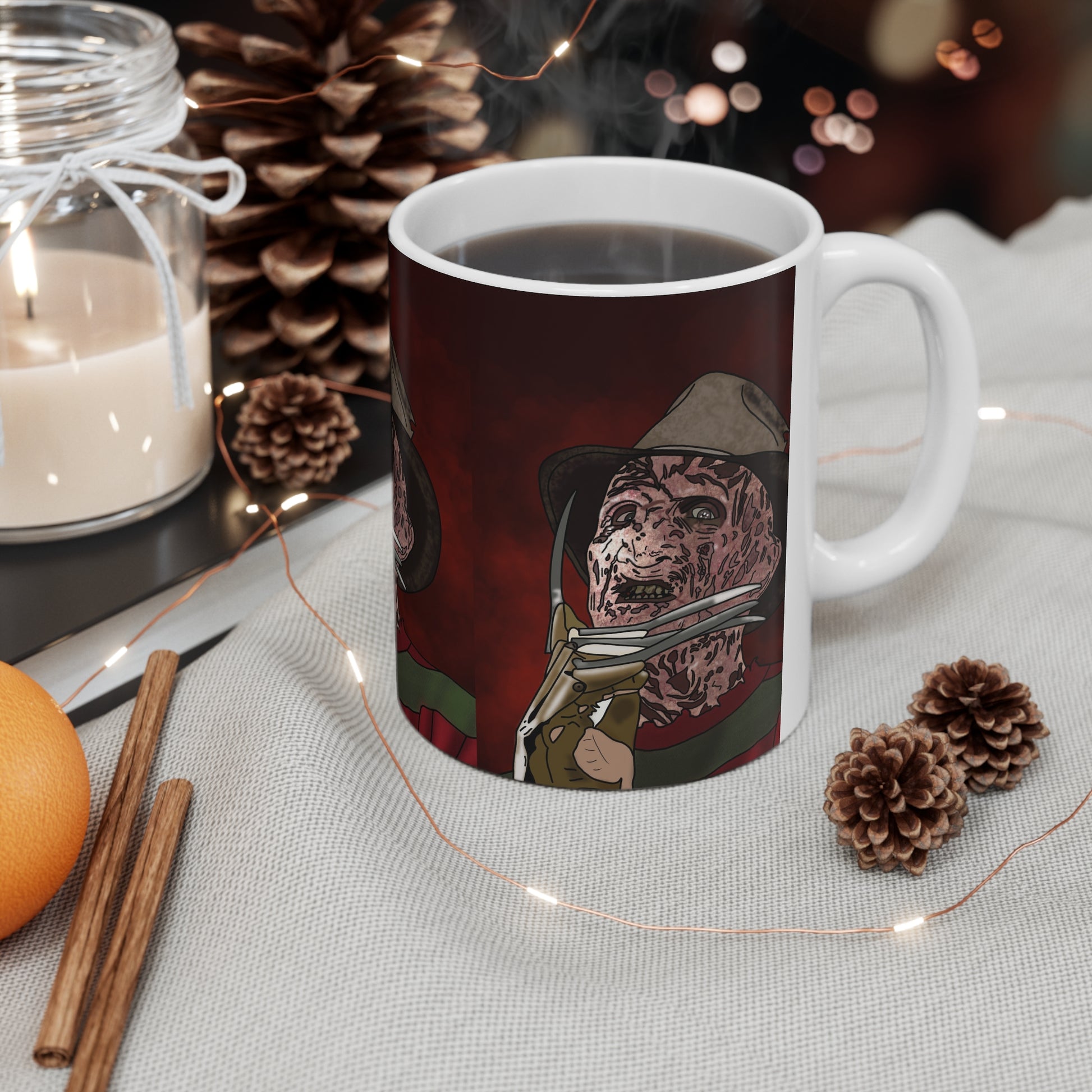 This glossy ceramic mug brings a dark, cinematic energy to morning coffee and late-night sips alike. The wraparound illustration—moody crimson background and a scarred, hat-wearing figure holding a bladed glove—creates a slow-burn, horror-movie vibe that lingers with every drink. It feels like a collectible prop from a favorite fright-night marathon; set it on your desk while writing fan theories, use it during midnight movie nights, or let it sit on a shelf as part of a horror display. The heavy contrast and rich colors stand out against the white ceramic, so the imagery reads clearly whether you choose the smaller 11oz or the bolder 15oz size. Comfortable to hold and easy to clean, this mug integrates into the routines of horror fans who enjoy a little atmospheric flair with their beverages.