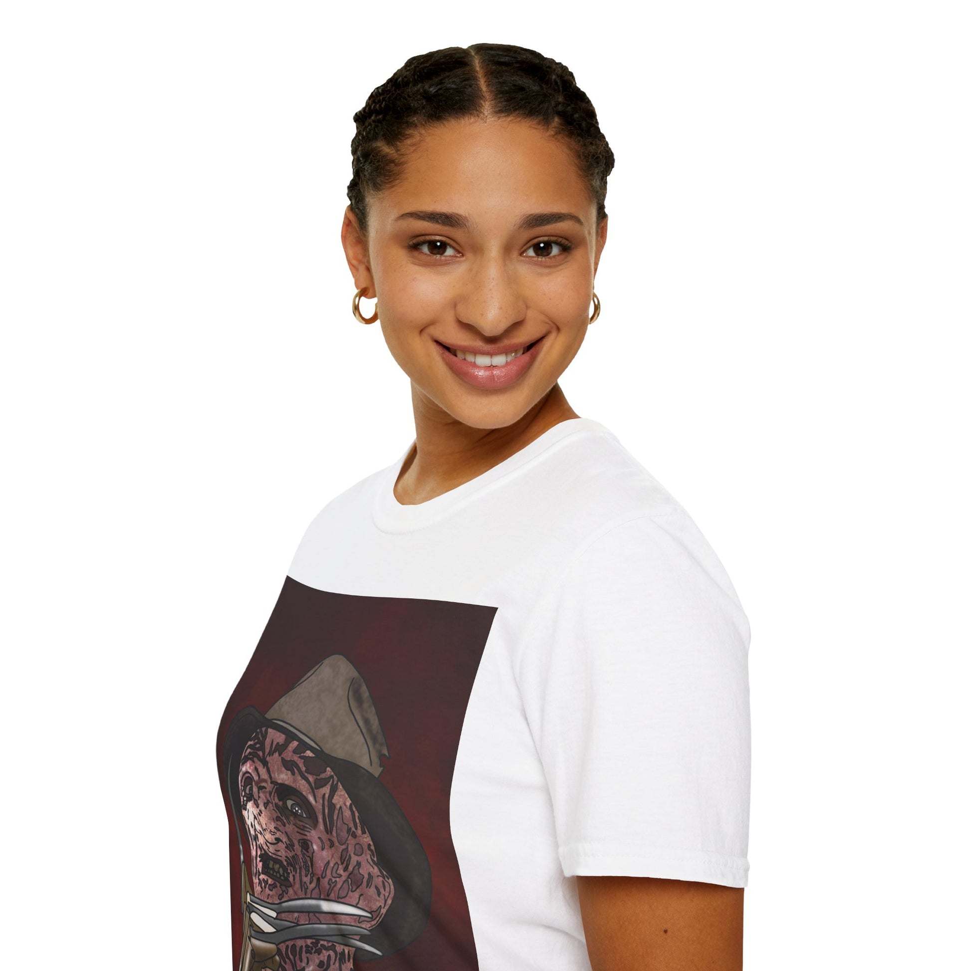 This soft, breathable tee carries a bold, gritty horror illustration across the chest — a worn fedora, scarred skin, and a cold, menacing stare rendered in deep reds and shadowed greens. It feels like a midnight movie poster you can wear: heavy atmosphere, unsettling detail, and a vintage horror vibe that lingers. Lightweight and smooth against the skin, the shirt sits comfortably through late-night film marathons, niche conventions, or when you want to let a darker aesthetic speak for itself. The classic crew silhouette layers easily under a jacket or stands alone as a statement piece for fans of cult horror and retro slasher art.