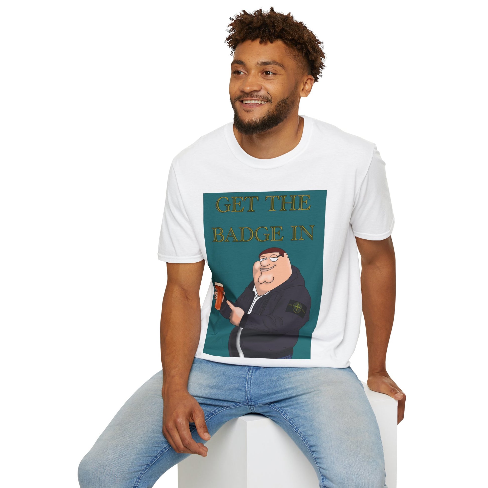 Funny Cartoon Stone Island Badge Meme T‑Shirt – “Get The Badge In” Beer Pub Tee