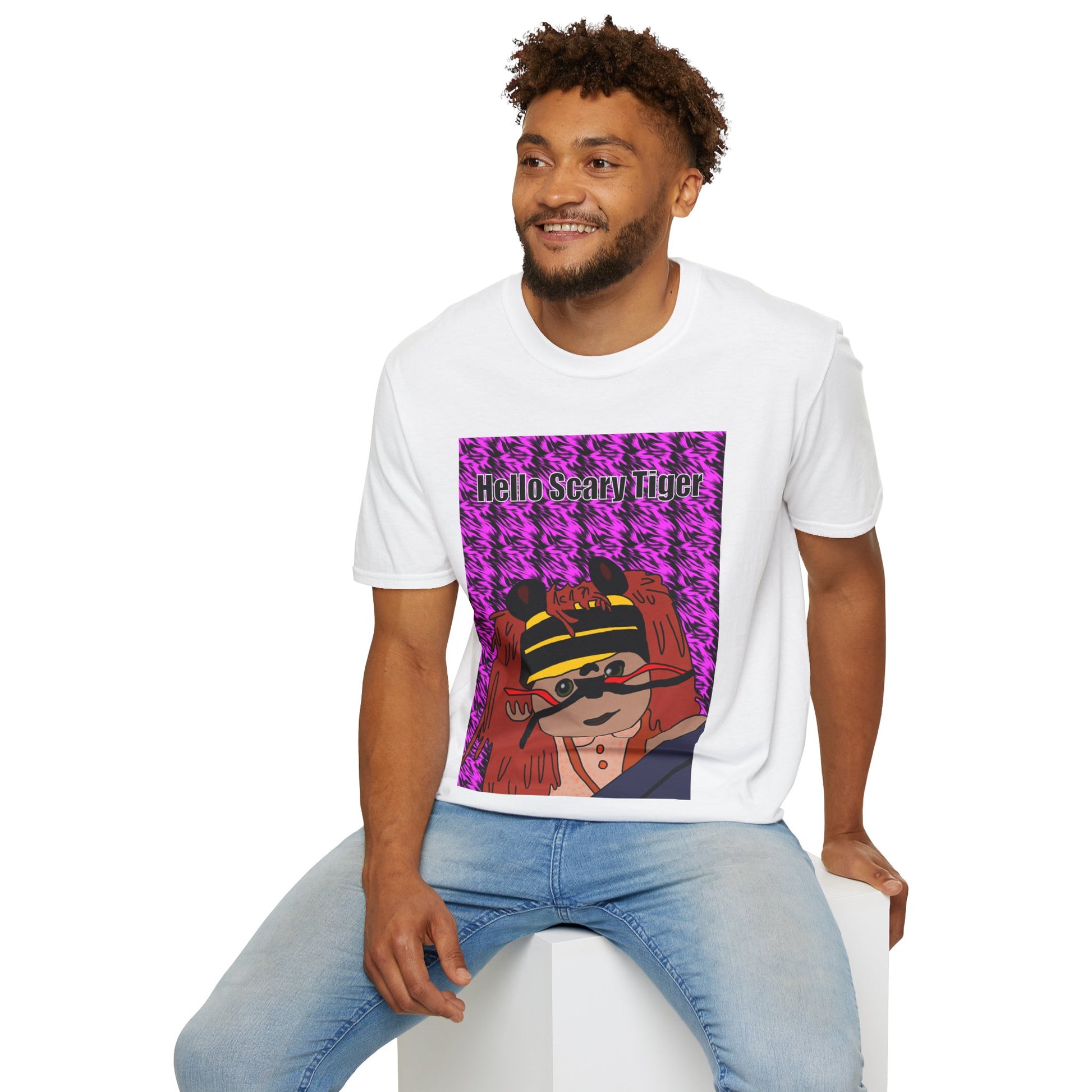 This lightweight cotton tee carries a playful, slightly surreal energy. A bold, hand-drawn character stares out from a high-contrast purple houndstooth background; text above reads “Hello Scary Tiger.” The image feels like a late-night zine page brought to life — quirky, slightly mischievous, and strangely comforting. Wear it when you want your outfit to start a conversation: layered under a worn denim jacket for a city stroll, or paired with relaxed jeans at an art opening. The fabric is soft against skin and holds print detail clearly, so the illustration’s textures and tones stay vivid through regular wear. Thoughtful construction—shoulder tape, ribbed collar, tear-away label—keeps it comfortable and durable for everyday use.