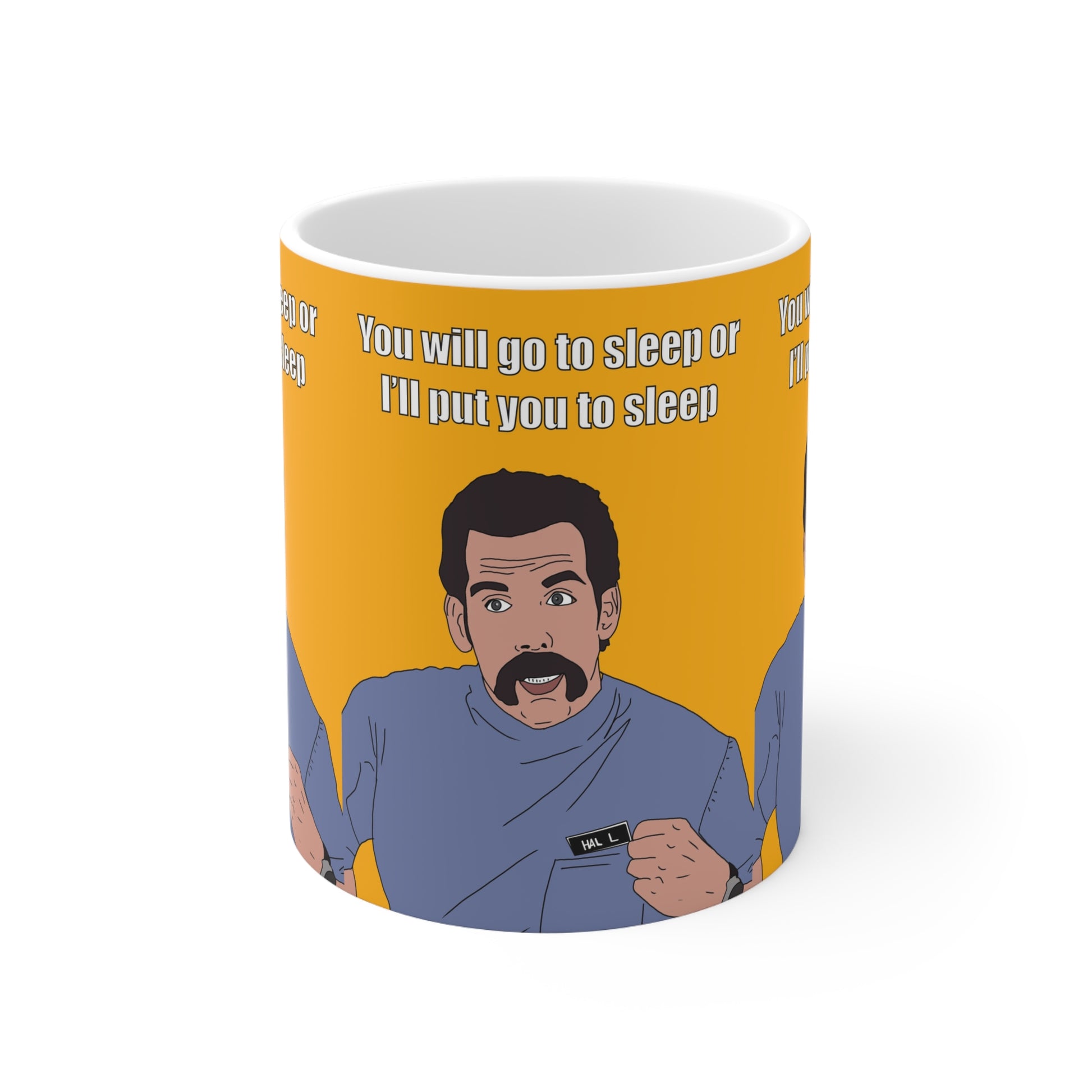 Bright, glossy ceramic mug with bold, irreverent artwork that brings a grin to morning routines. The illustration wraps around the cup on a warm golden background, featuring a mustachioed character delivering a cheeky, deadpan line. Thick, crisp printing keeps colors vivid wash after wash, and the comfortable C-shaped handle sits naturally in hand for a steady morning pour. Warm beverages feel along for the joke — whether it’s slow coffee on the commute or a late-night tea — this mug adds personality to everyday moments and sparks smiles across the kitchen table or office desk.