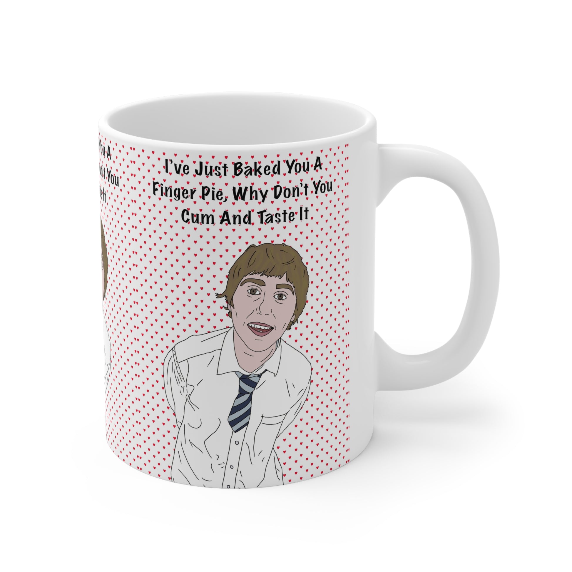 A glossy white ceramic mug that brings offbeat humor to your morning routine. The illustration-style design features a playful, slightly awkward character and a cheeky line rendered over a soft dotted background — the kind of irreverent, nerdy joke that sparks a laugh between friends. Comfortable to hold with a C-shaped handle, this mug feels familiar in hand while the bright, ORCA-enhanced print keeps the artwork crisp and colorful through daily use. Durable, lead- and BPA-free, and safe for microwave and dishwasher, it’s built for real routines and spontaneous coffee-break moments where a silly line can flip your mood.