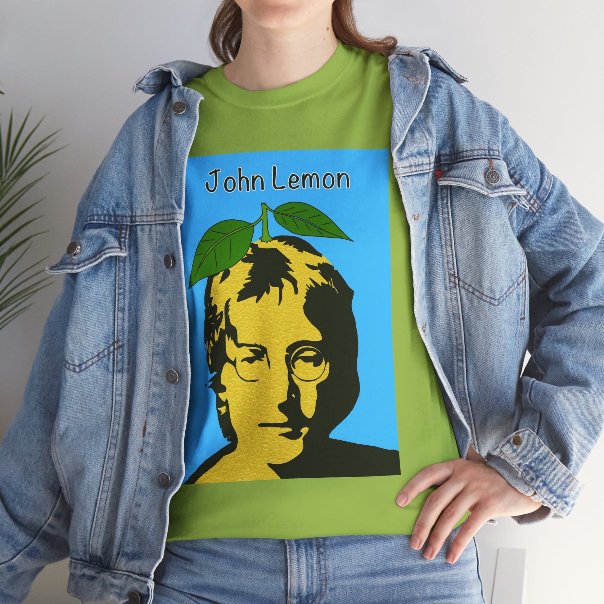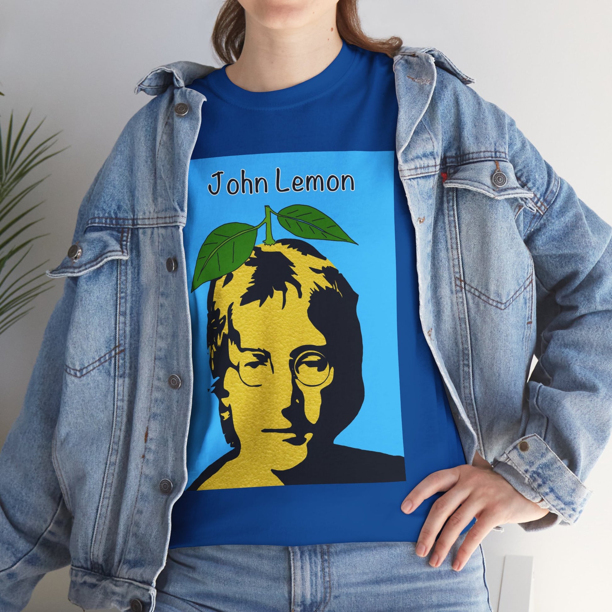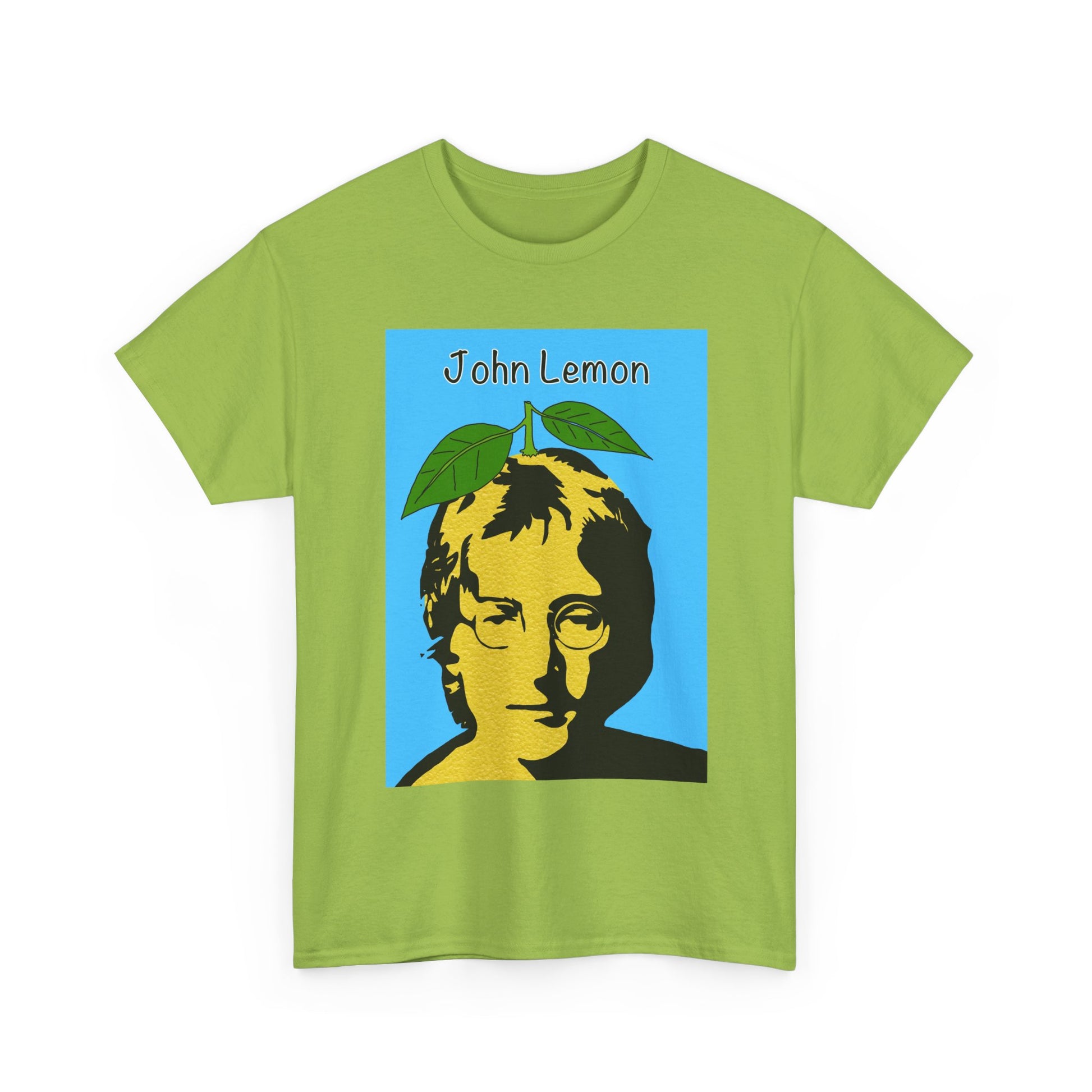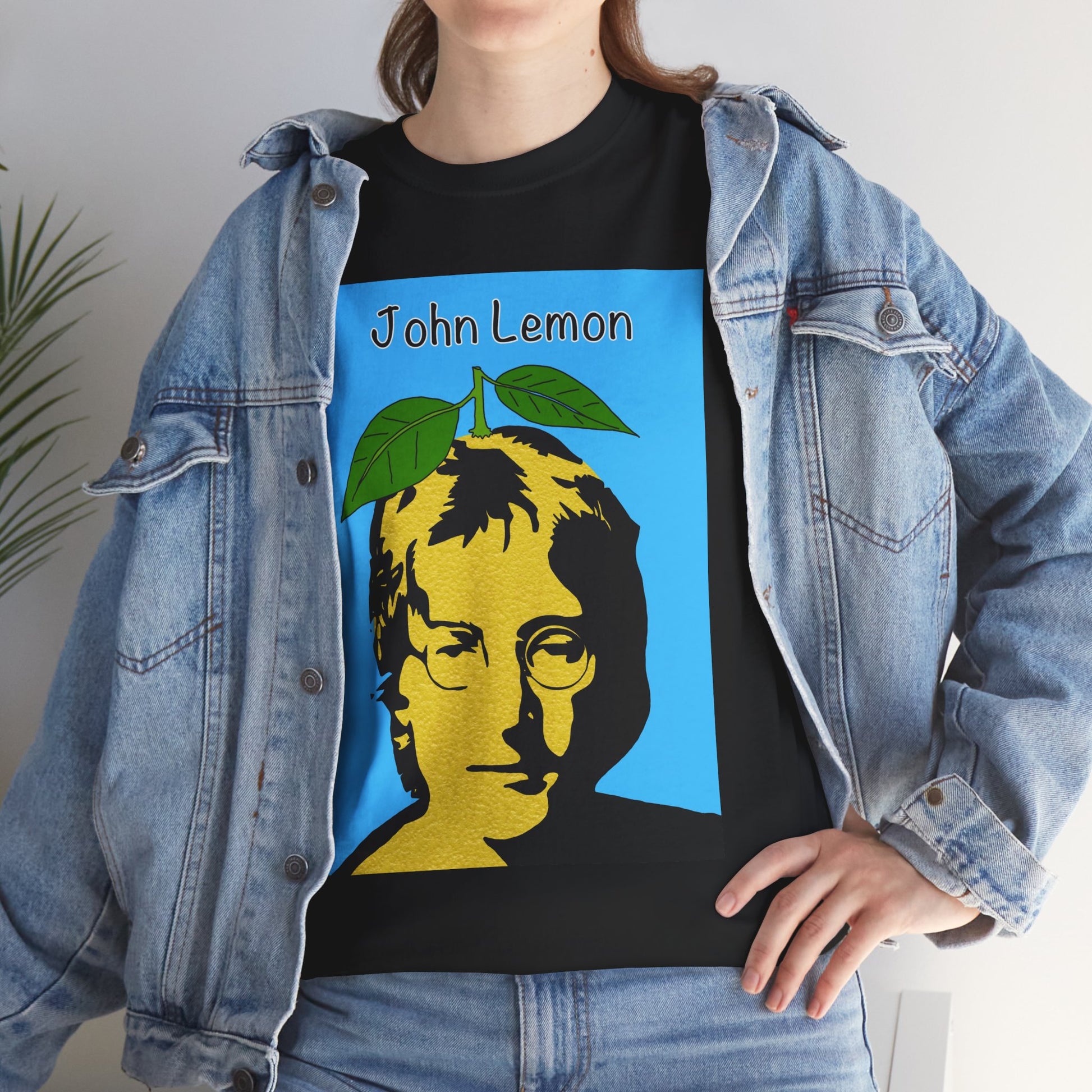Wear a wink of music and a splash of pop-art with this soft, sturdy tee. The front features a bright, poster-style portrait titled “John Lemon” — a playful riff on classic rock imagery with bold yellow and black halftone tones, leafy accents, and a sky-blue backdrop. The shirt’s relaxed crew cut and medium-weight cotton feel familiar and lived-in from the first wear, while the smooth print methods keep the artwork crisp and vibrant. Layer it under a denim jacket, throw it on for open-mic nights, or let it lead your weekend vintage-market look. It’s an easy way to add humor and personality to everyday outfits while keeping comfort front and center.