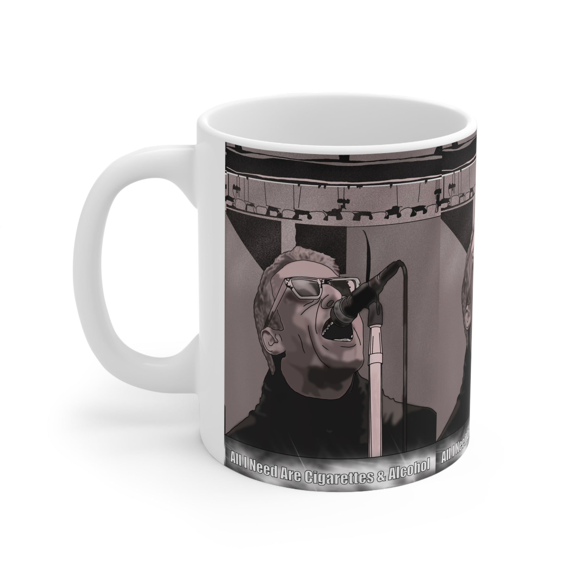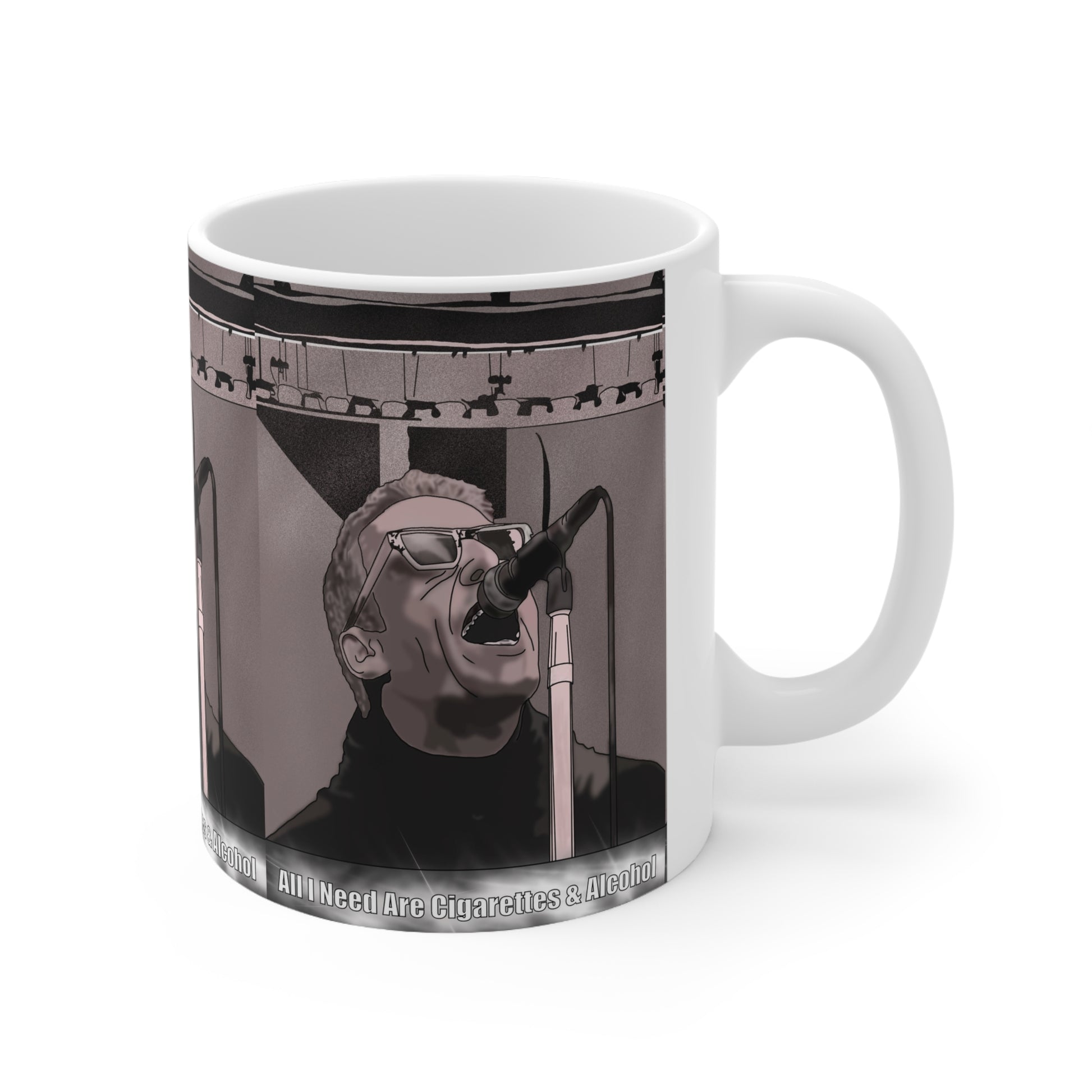 This ceramic coffee cup brings a concert-night energy to your morning routine. The monochrome live-performance illustration wraps around the mug, capturing the raw intensity of a singer mid-verse and the stage lights just beyond. Hold it in hand and feel like you’re back at the front row — the bold, high-contrast artwork pairs with glossy white ceramic for a striking, modern look. Whether you reach for espresso before a busy day or sip tea while queuing up a playlist, this mug adds a little backstage attitude to everyday moments.