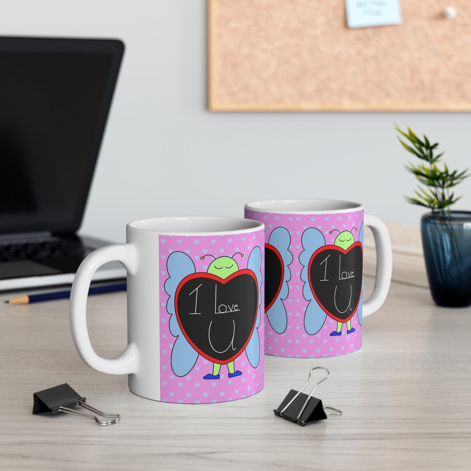 Bright, cheerful ceramic mugs that bring a playful, hand-drawn charm to morning coffee or evening cocoa. Each mug features a repeating illustration of a smiling green bug holding a heart-shaped chalkboard that reads “I love U,” set against a soft pink background dotted with tiny hearts. The glossy white ceramic finish makes colors pop and the C-shaped handle is comfy for everyday sipping. These mugs fit into routines where whimsy matters — thoughtful schoolroom snack breaks, cozy chats at home, or making a loved one’s day with a small, sincere gesture.