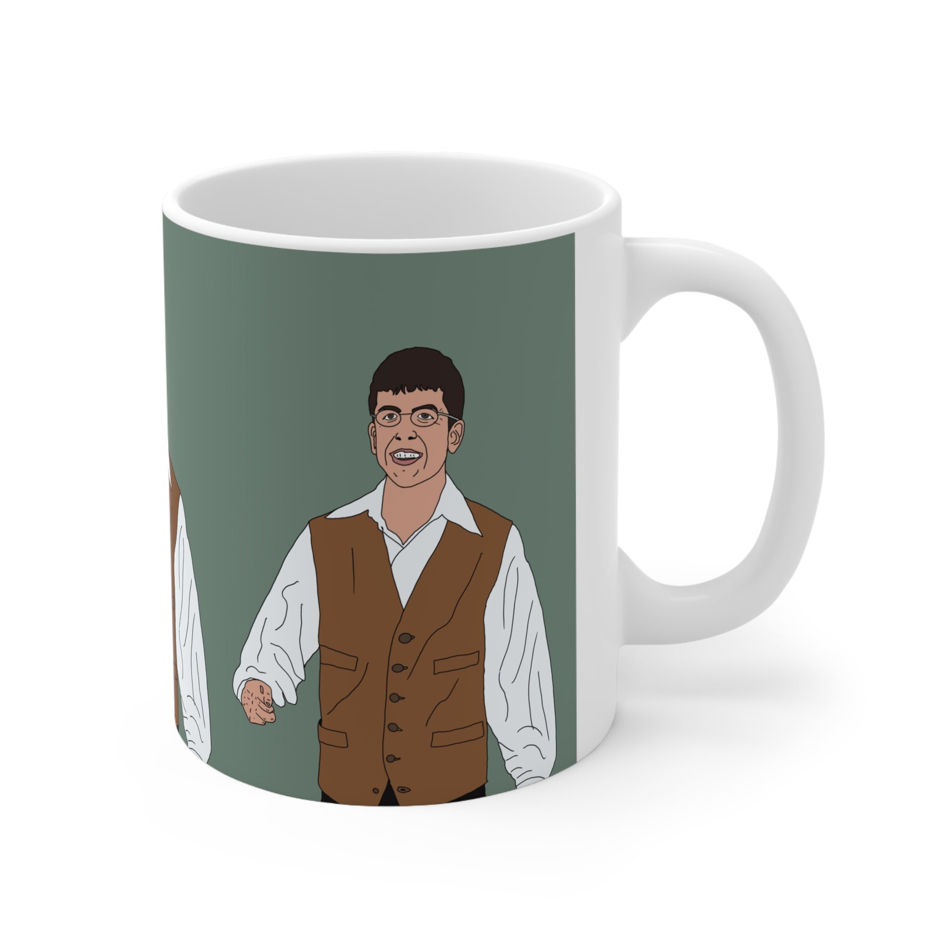 A glossy ceramic mug that brings a touch of dry humor and everyday warmth to your morning routine. The artwork wraps around the cup against a muted green backdrop, featuring a stylized figure in vintage-inspired clothing — a little oddball, a little earnest — that starts conversations and sparks knowing smiles. The comfortable C-shaped handle and smooth rim make each sip slow and satisfying. Built for regular use, the bright, long-lasting print resists fading, and the mug stands up to microwave and dishwasher cycles so it stays part of your daily ritual without extra fuss.
