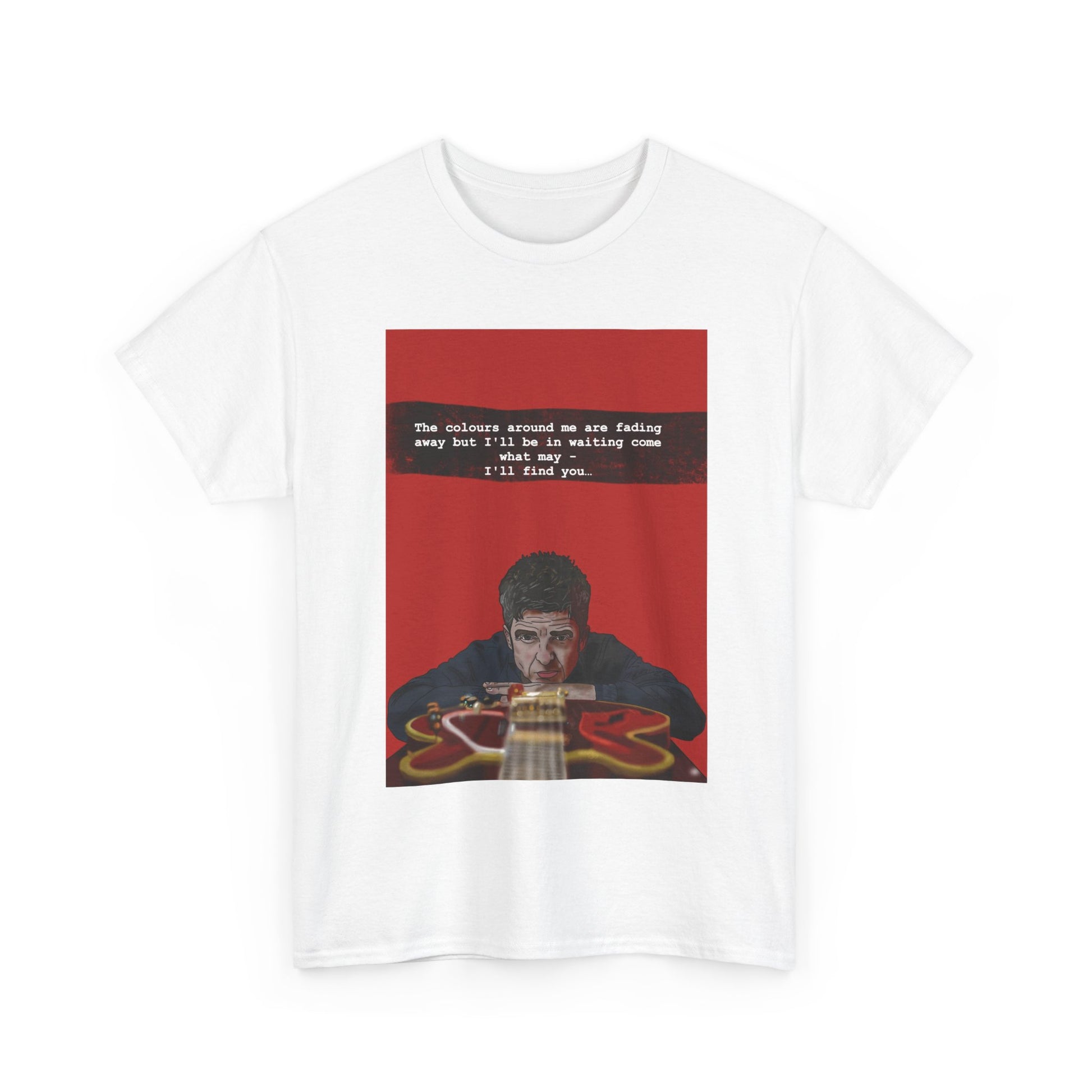 This classic cotton tee carries a low-lit, cinematic vibe — a moody portrait printed on a clean white canvas. The image centers on a pensive figure leaning over a guitar, set against a deep red field with a small, typewriter-style caption above. Wear it when you want your outfit to feel like a scene from an indie film: quiet, intense, and slightly mysterious. The medium-weight fabric drapes naturally and holds the print’s rich colors without feeling stiff. It layers easily under a jacket or stands alone with jeans for evenings at small shows, late-night coffee runs, or when you want to wear something that hints at stories beneath the surface.