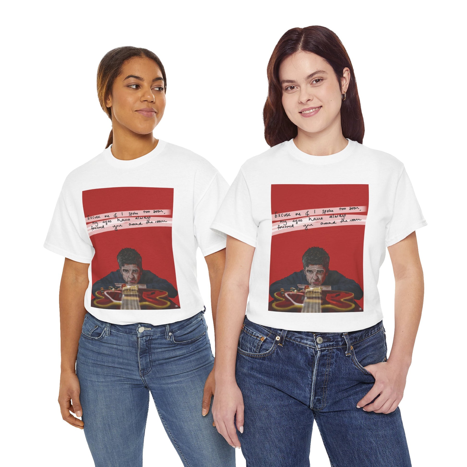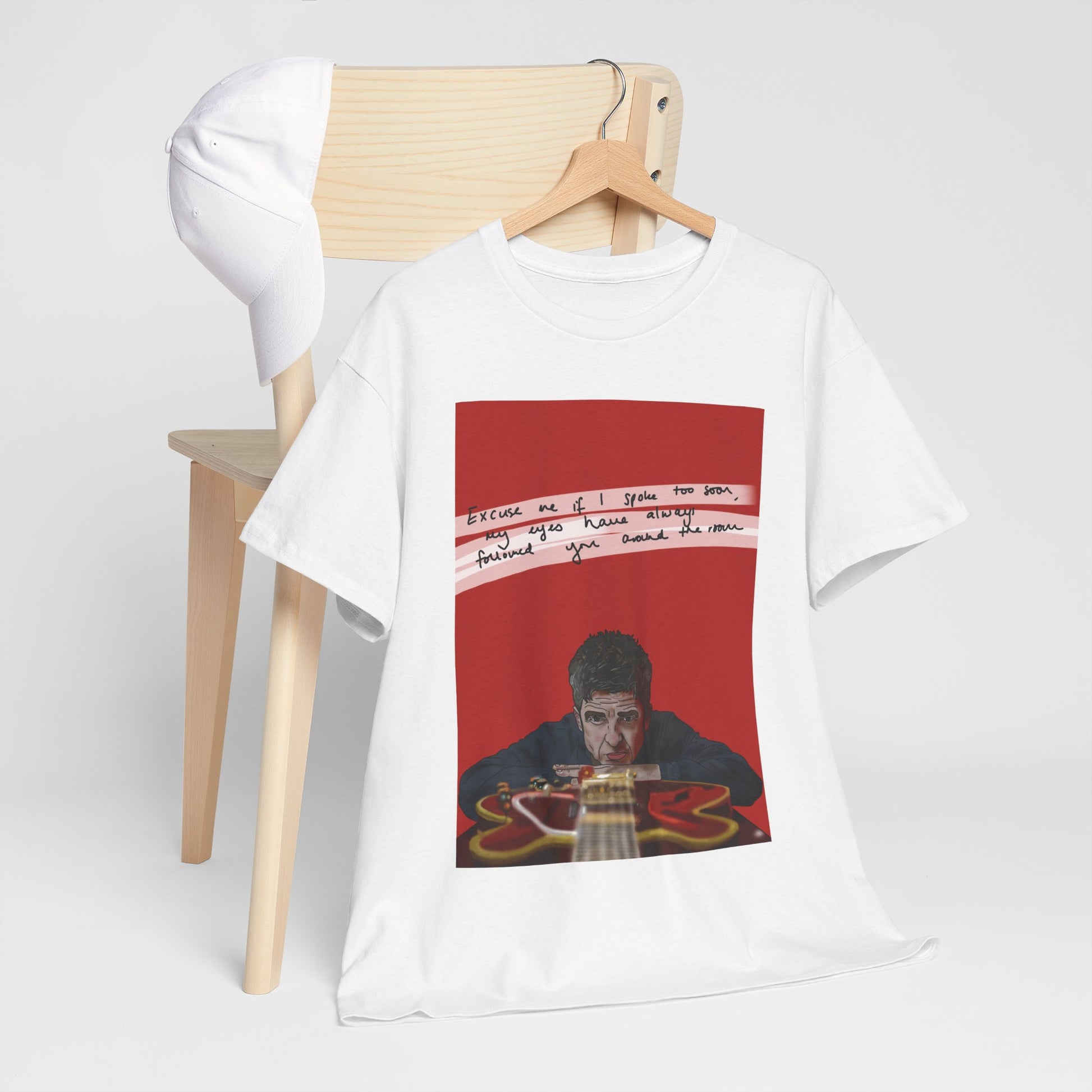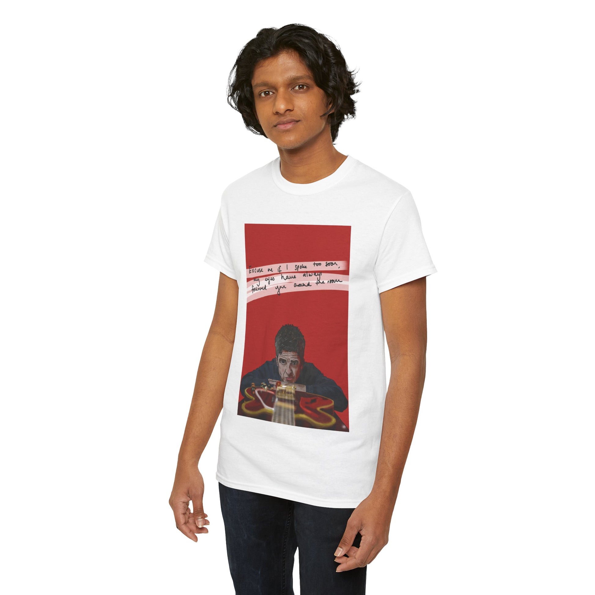 This tee carries a raw, late-night energy — a lone figure hunched over a guitar against a bold red field, with handwritten lyric strips drifting above. It feels like a snapshot from an underground practice room or a dusty roadhouse: contemplative, slightly bruised, and stubbornly alive. Wear it when you want your outfit to hum with story — when you’re heading to a small venue, nursing a late coffee, or layering for a creative night out. The classic crew and relaxed fit let the art speak while keeping you comfortable through long sets and late conversations. Subtle print techniques keep details crisp so the face, guitar inlay, and handwritten lines stay expressive wash after wash.