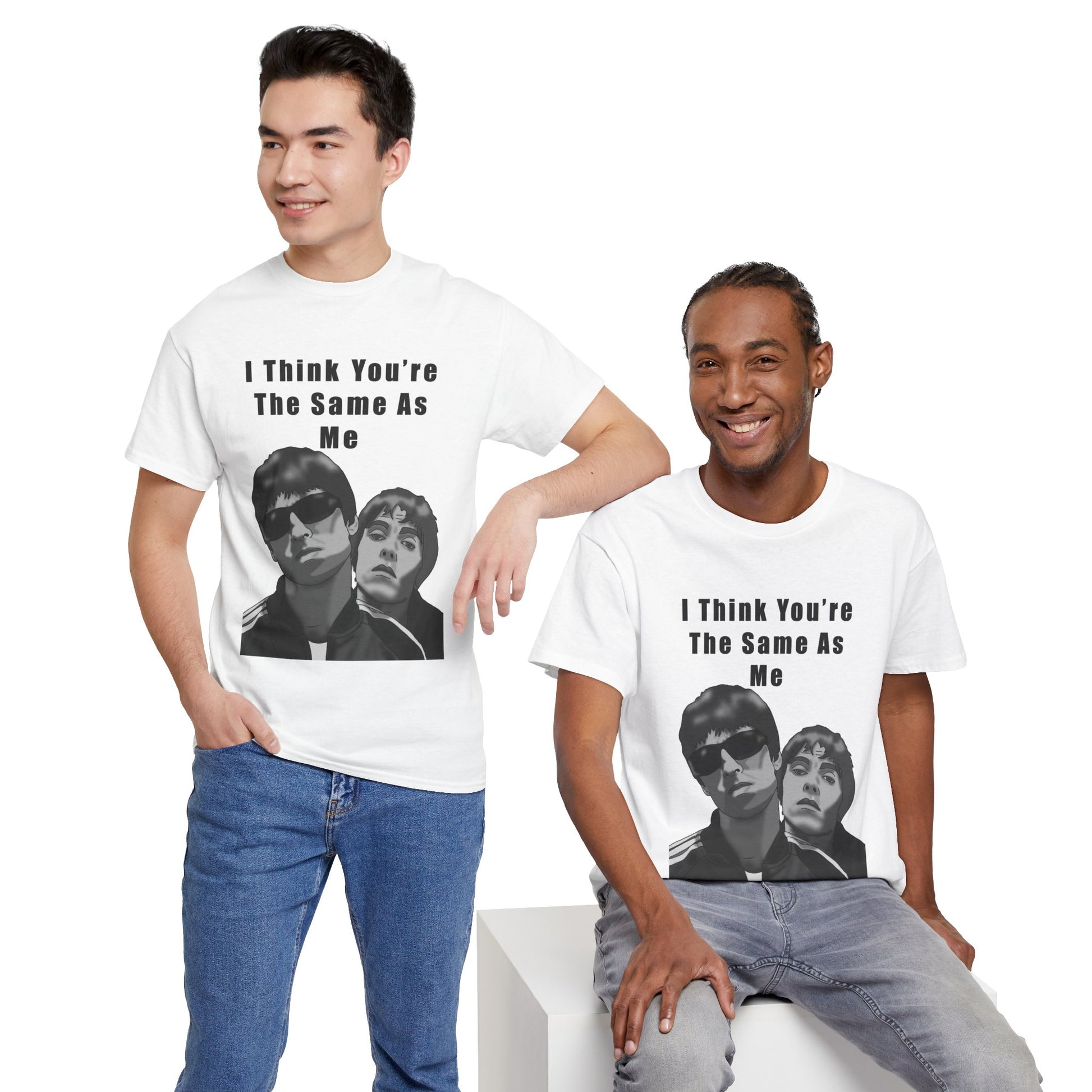 A laid-back, music-leaning tee that feels like a conversation with an old friend. The clean, monochrome print shows two familiar faces in a slightly cheeky pose under the line “I Think You’re The Same As Me,” giving this shirt a wry, indie attitude. Wear it to small-venue shows, late-night hangs, or while swapping records over coffee. The medium-weight cotton holds shape and print detail, so the image keeps its crisp edge through repeated wears. It layers easily under a denim jacket or over a long-sleeve when the night cools, and the relaxed crewneck fit keeps things comfortable without looking sloppy. For anyone who collects moments as much as music, this tee reads like a quiet inside joke — low-key, confident, and unmistakably personal.