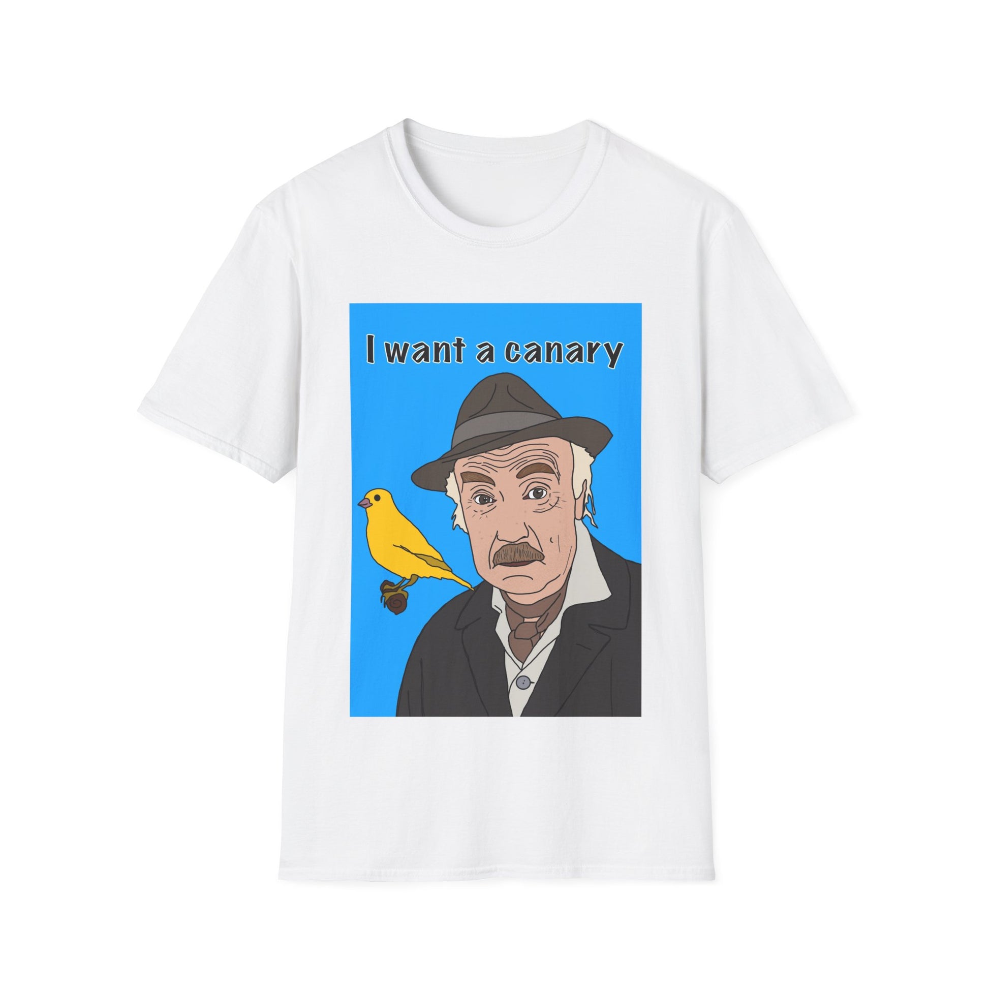 This lightweight tee carries a quiet, surprising charm: a gentle portrait of an elderly man with a small yellow canary perched beside him and the phrase “I want a canary.” The bright, pop-art blue backdrop makes the illustration sing against the white fabric, while the soft ring‑spun cotton feels smooth and lived‑in from the first wear. It reads like a little story you’ll wear — nostalgic, slightly offbeat, and warm-hearted. Layer it under a jacket for neighborhood walks, wear it to community gatherings, or keep it as your go-to when you want clothing that sparks conversation without shouting. The tear‑away label and stable ribbed collar keep comfort steady, wash after wash.