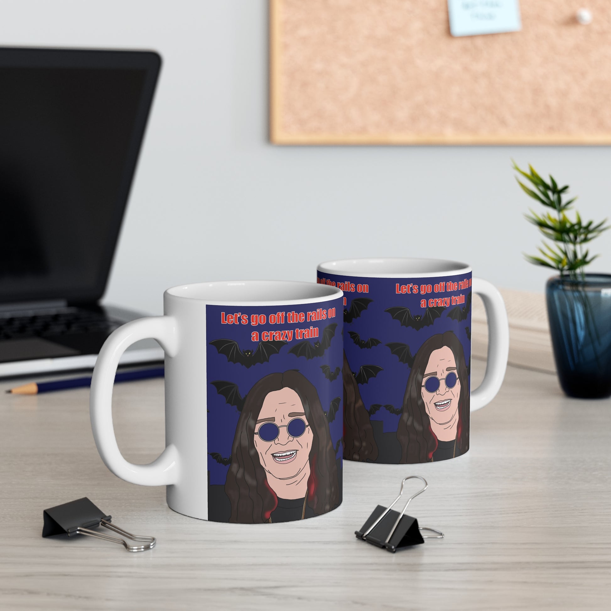Ozzy Osbourne Cartoon Mug — "Let's Go Off the Rails on a Crazy Train" Ceramic Coffee Cup