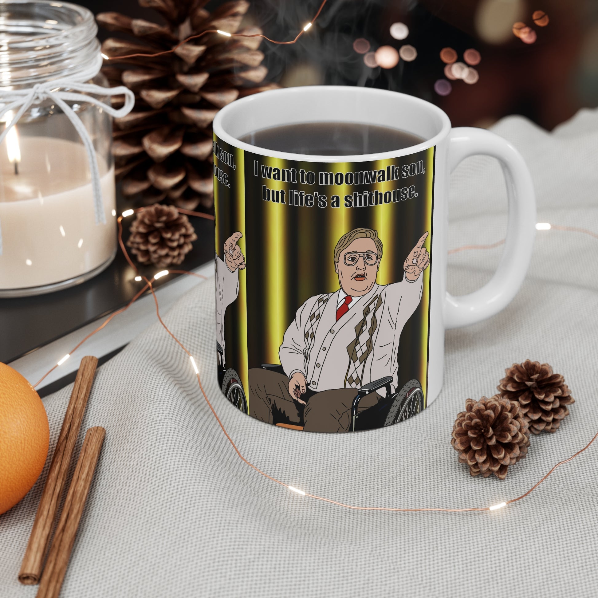 Sip slow and laugh loud with this glossy ceramic mug that brings quirky character to every coffee break. The illustrated elder with a pointed finger and bold stage curtains creates a playful, slightly absurd scene that invites smiles and double-takes. Bright, durable printing holds up through daily use, keeping the image crisp and the colors vibrant. The comfortable C-shaped handle and two size options mean this cup feels familiar in hand while giving you room for an ample pour. It’s a small, cheerful piece that slips easily into mornings, late-night chats, and any moment that needs a little offbeat humor.