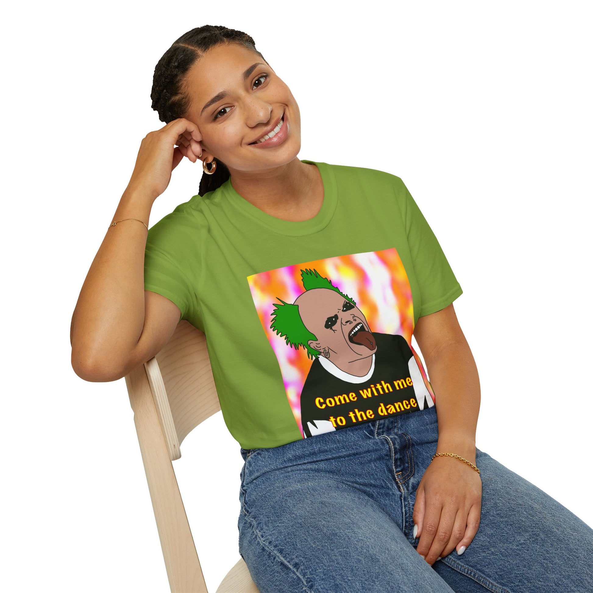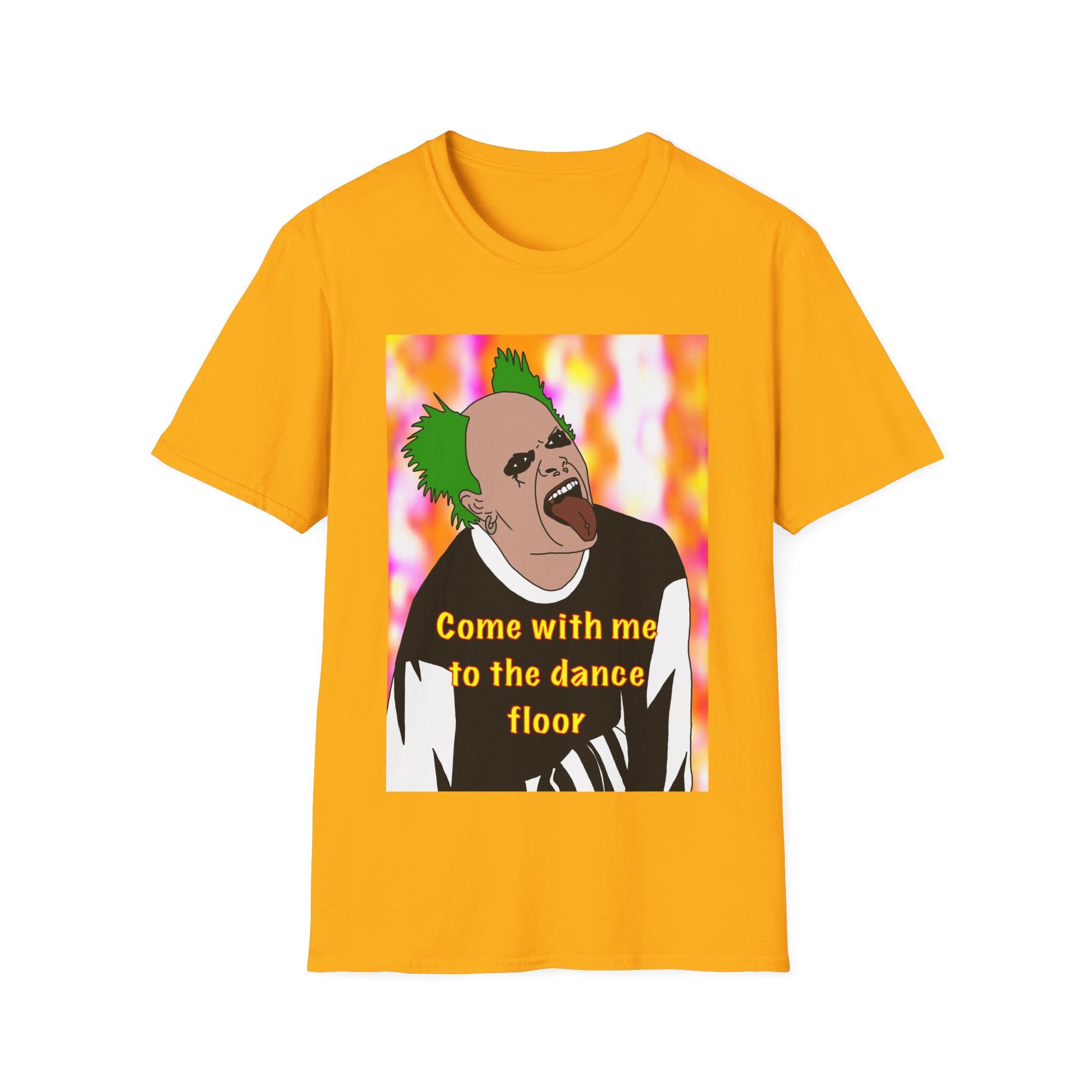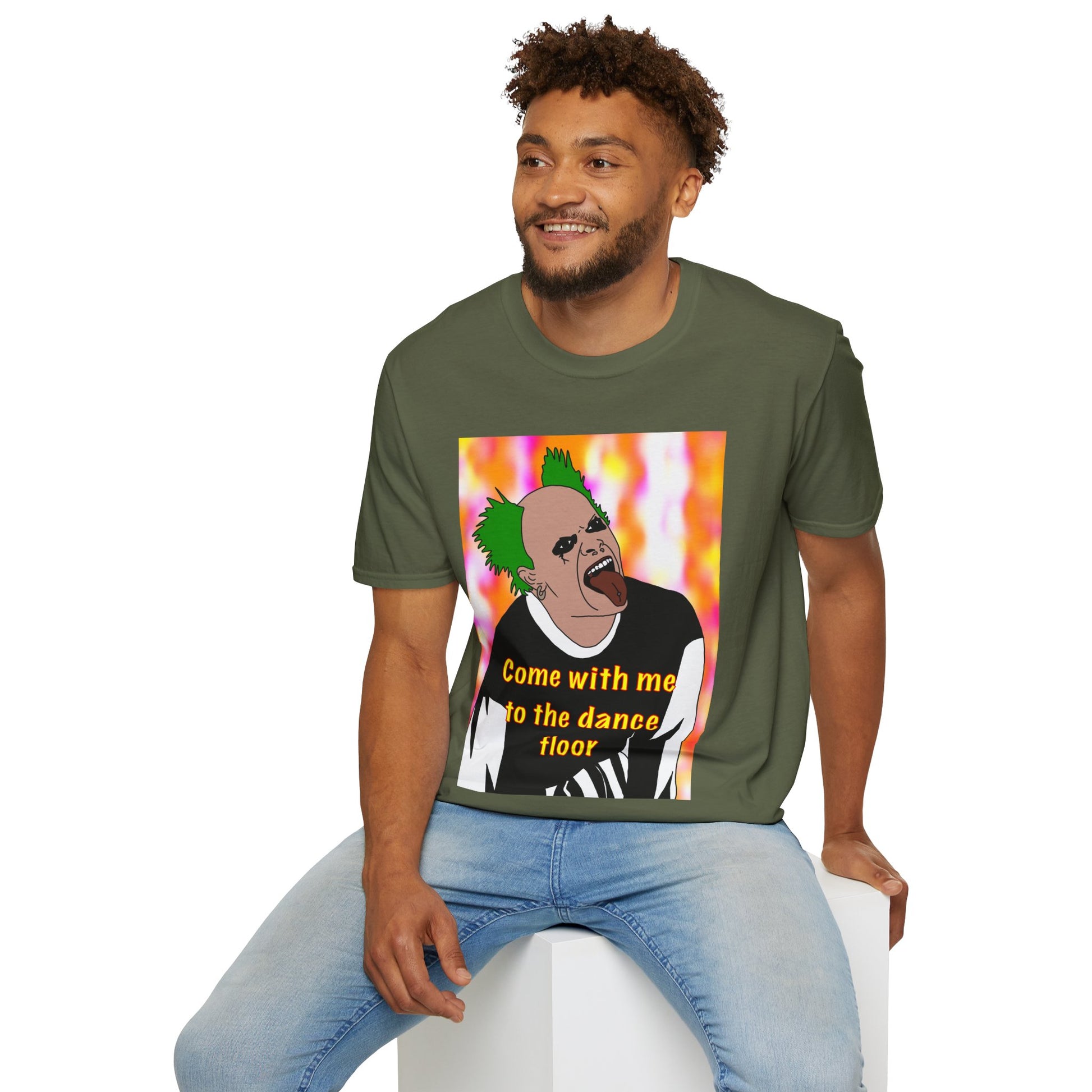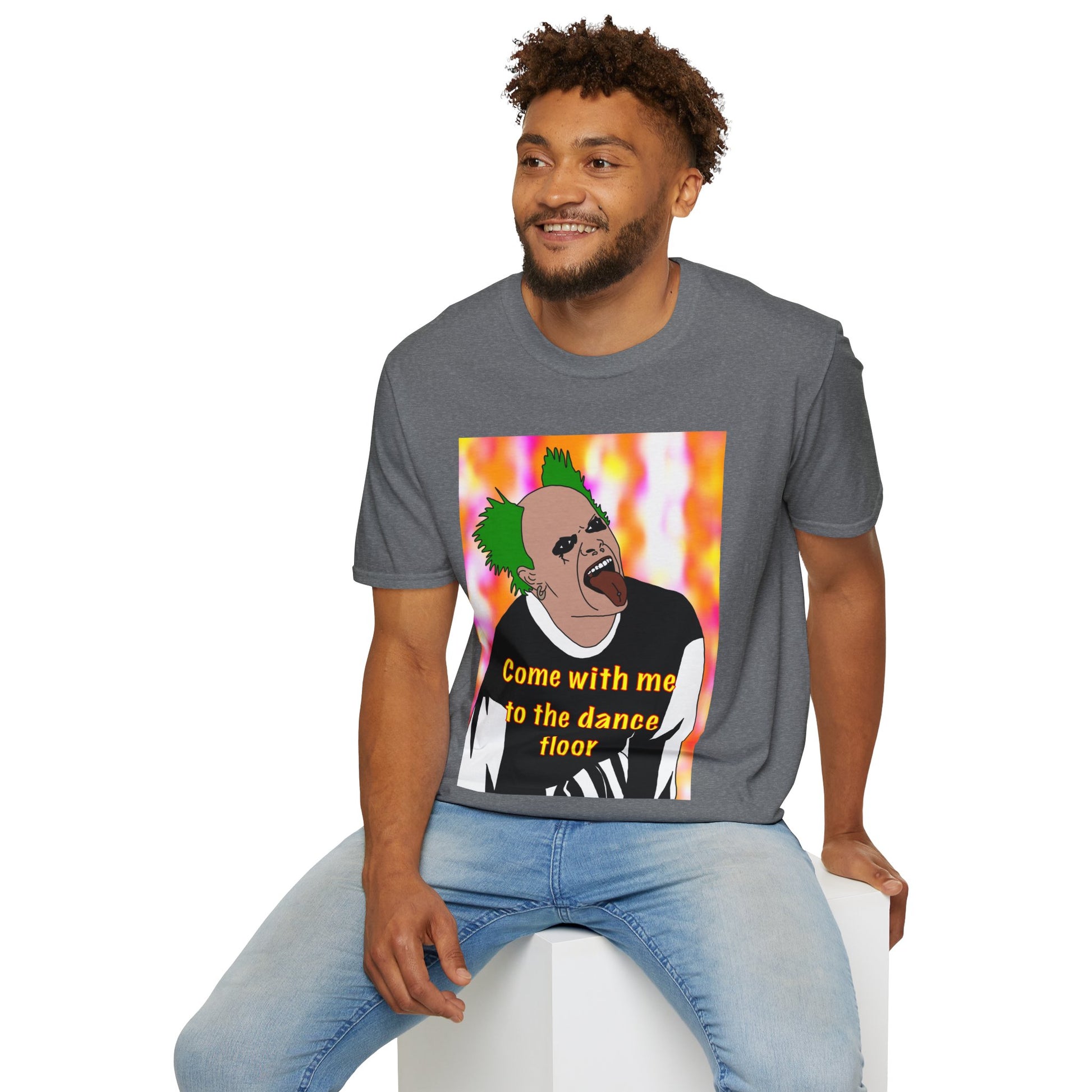 This lightweight, ring-spun cotton tee carries an irreverent punk energy straight into everyday wear. The front print shows a wild-haired, shouting figure against a molten, colorful backdrop with the bold line “Come with me to the dance floor.” It reads like an invitation to break routine — to crash small-room shows, launch late-night adventures, or own the moment at a backyard party. The classic crew neckline and clean cut keep the silhouette wearable while the loud graphic does the talking. Wear it with ripped jeans, a leather jacket, or layered under an open flannel; it’s built to move from gig nights to afterparty laughs without fuss.