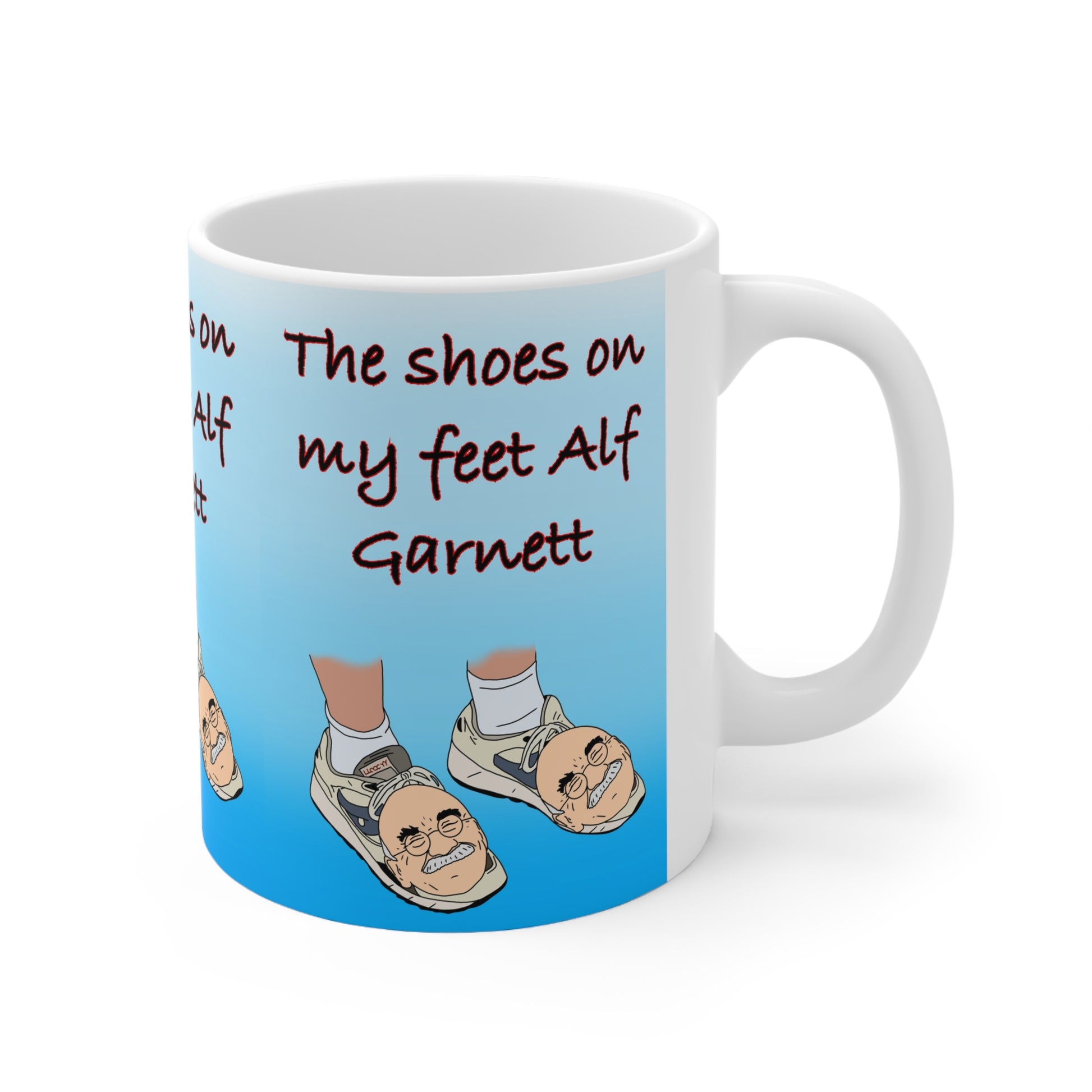 A cheerful, conversation-starting ceramic mug that brings a slice of playful fandom to everyday coffee and tea rituals. The glossy white ceramic showcases a bright blue background with a whimsical illustration of feet wearing novelty sandals featuring a recognizable face — paired with hand-lettered text that reads “The shoes on my feet Alf Garnett.” It feels like a wink to long-time fans, a nostalgic nudge across the kitchen table, and a lighthearted way to begin slow mornings or fuel late-night watching sessions. The sturdy C-handle fits comfortably in your hand, and the two available sizes let you choose a snug morning cup or a generous, linger-longer mug. Dishwasher- and microwave-safe, this mug slides easily into daily routines while holding up to repeated use and vibrant color over time.