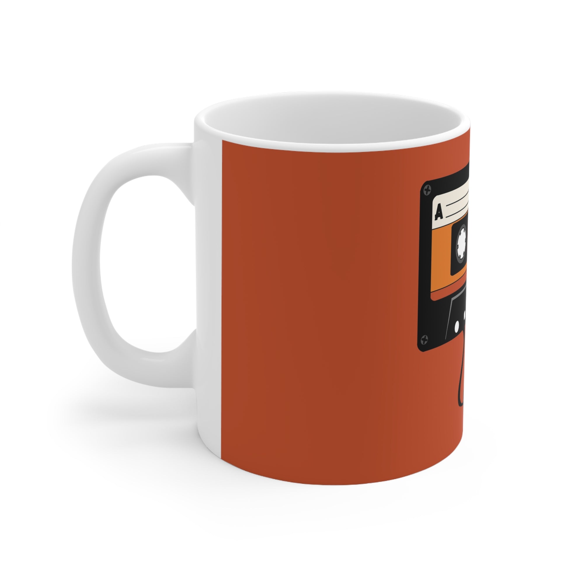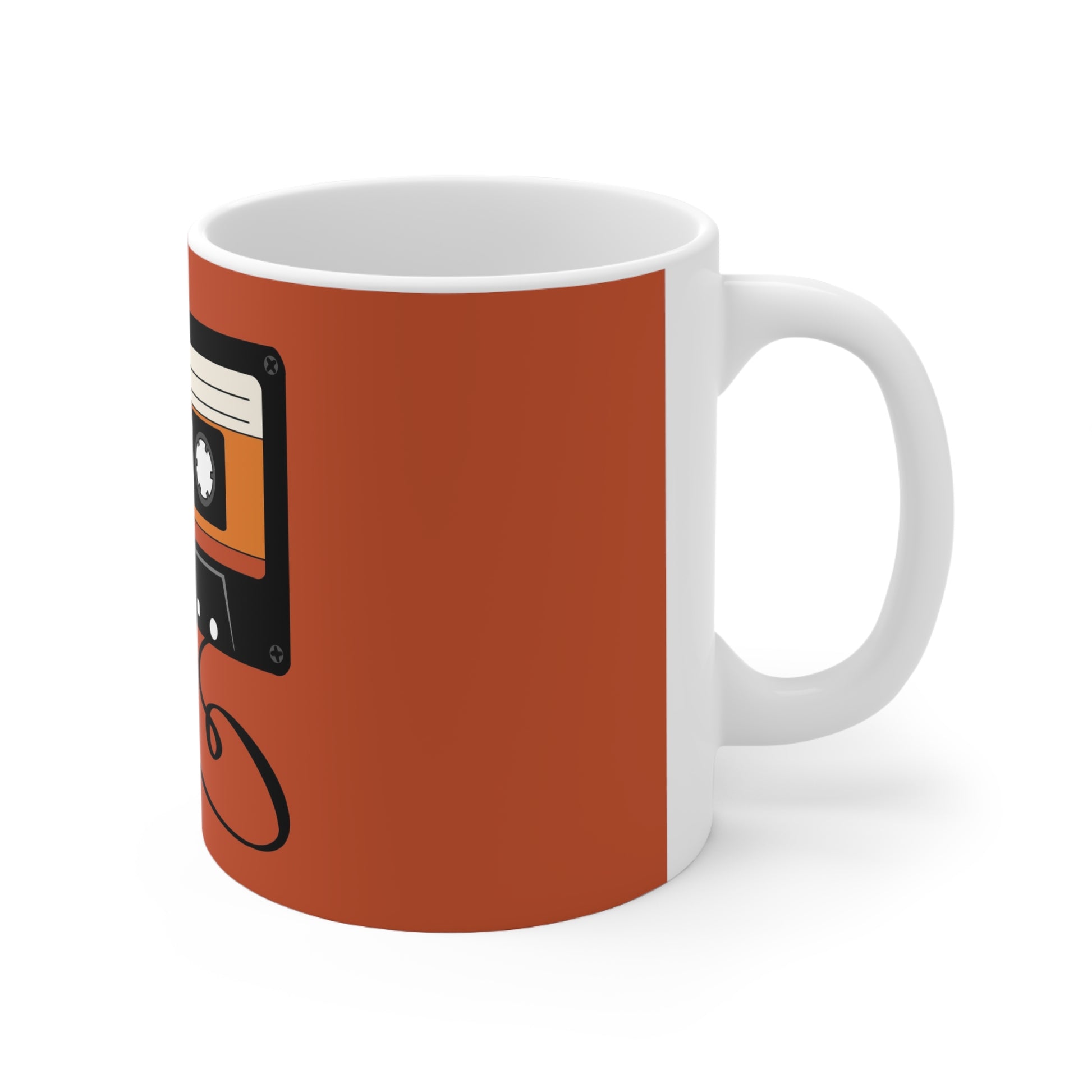Steam rises as you press play on an old mixtape. This ceramic mug brings that warm, retro hum into morning routines — rich terracotta background, bold cassette illustration, and a glossy finish that makes the colors sing. It feels familiar in hand: the C-shaped handle fits snugly, the 11oz or 15oz options hold a just-right pour, and the durable ORCA coating keeps the design bright through regular use. Use it for slow coffee while flipping through vinyl, for desk-side tea during creative bursts, or as part of a cozy kitchen shelf that nods to analog days.