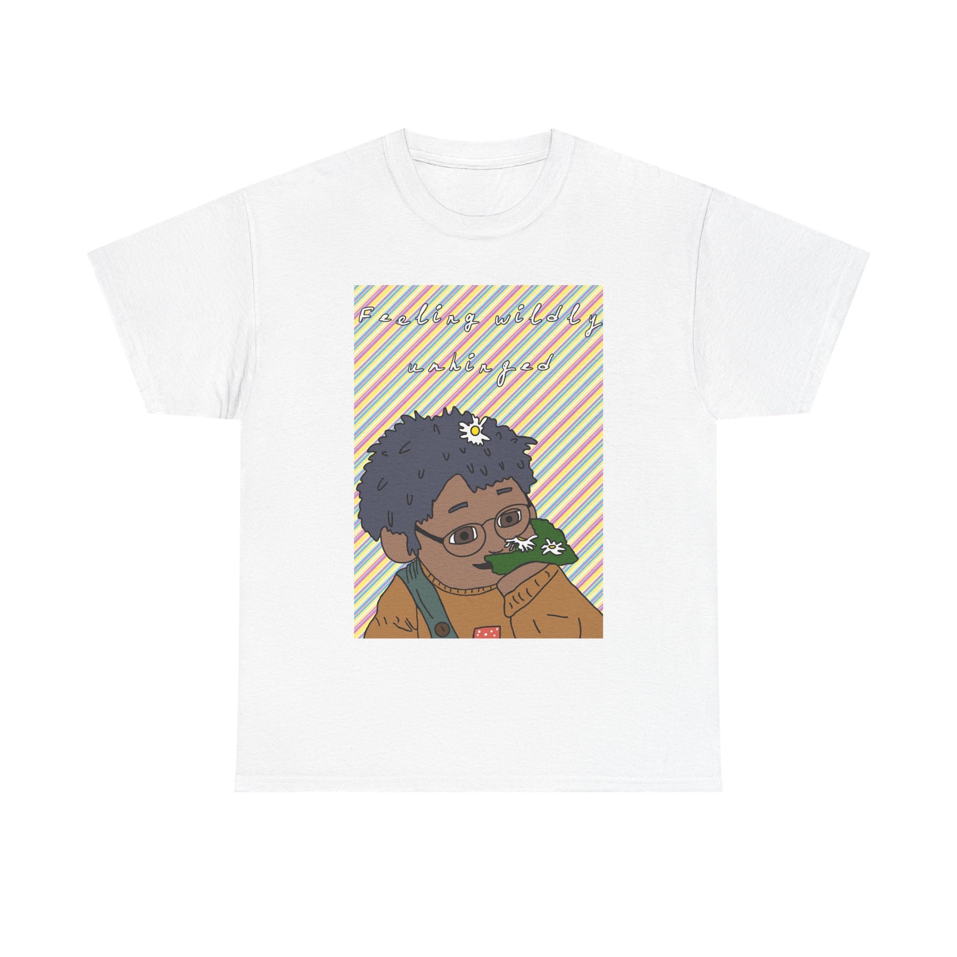 This relaxed cotton tee carries a soft, nostalgic charm — a cozy canvas for a warm illustrated print of a thoughtful character holding a tiny flower. The muted pastel stripes and hand-drawn style give it a gentle, indie vibe that feels like an afternoon spent sketching in a sunlit studio. Lightweight but sturdy, the shirt sits comfortably on the shoulders and keeps its shape, letting the artwork remain the focus as you wear it around the neighborhood, to casual meetups, or when you want to bring a little whimsy to your day. It’s the kind of shirt that invites conversation without shouting — quiet, sincere, and a little bit whimsical.