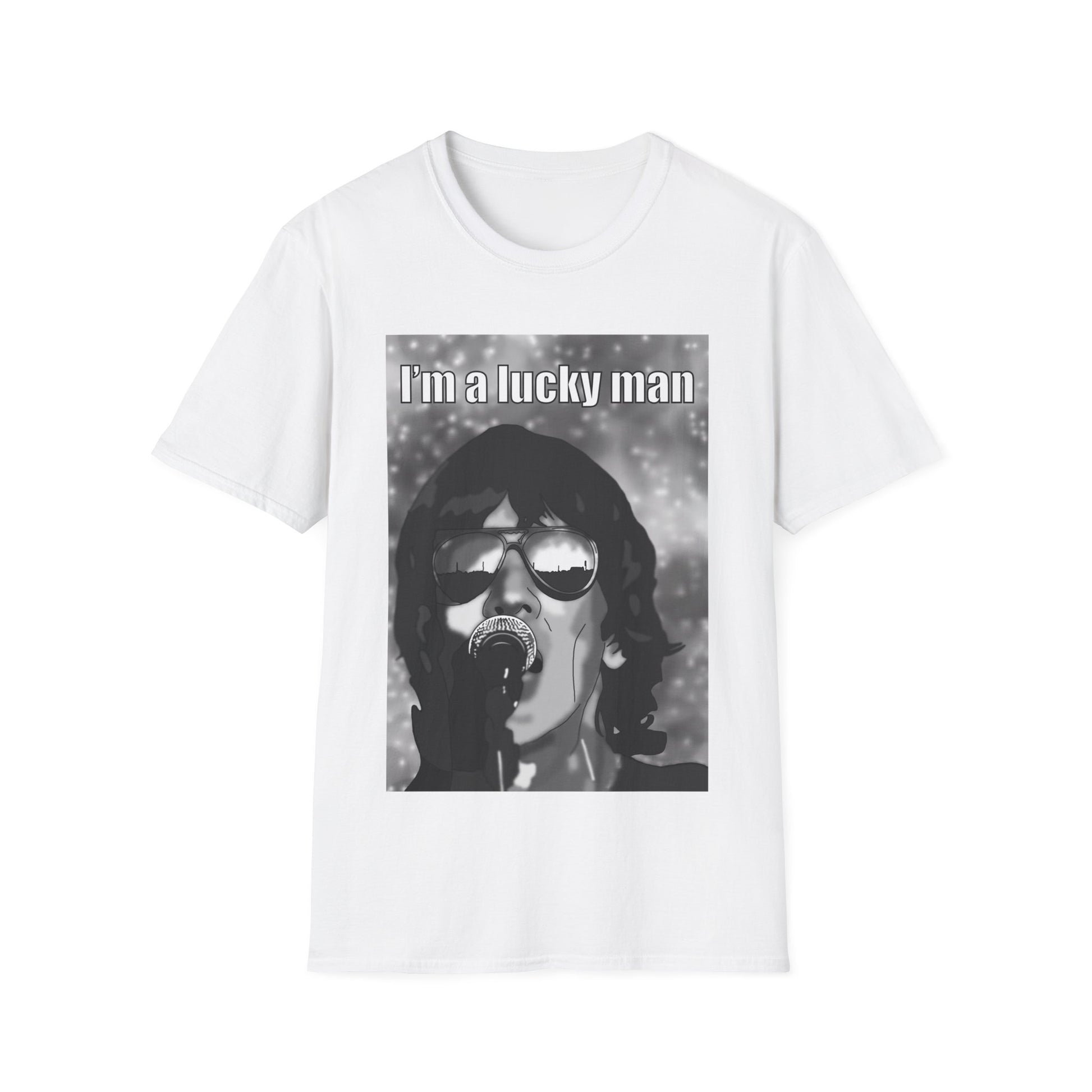 This shirt carries the raw energy of a late-night gig: grainy black-and-white portrait, mirrored shades reflecting stage lights, and the words “I’m a lucky man” printed above. It’s lightweight and breathable so it wears like a memory — easy to layer under a flannel or worn solo while you relive a favorite set. The classic crew neck and clean cut keep the focus on the image, turning the tee into a wearable poster for someone who lives for music, nostalgia, and honest moments under bright lights.