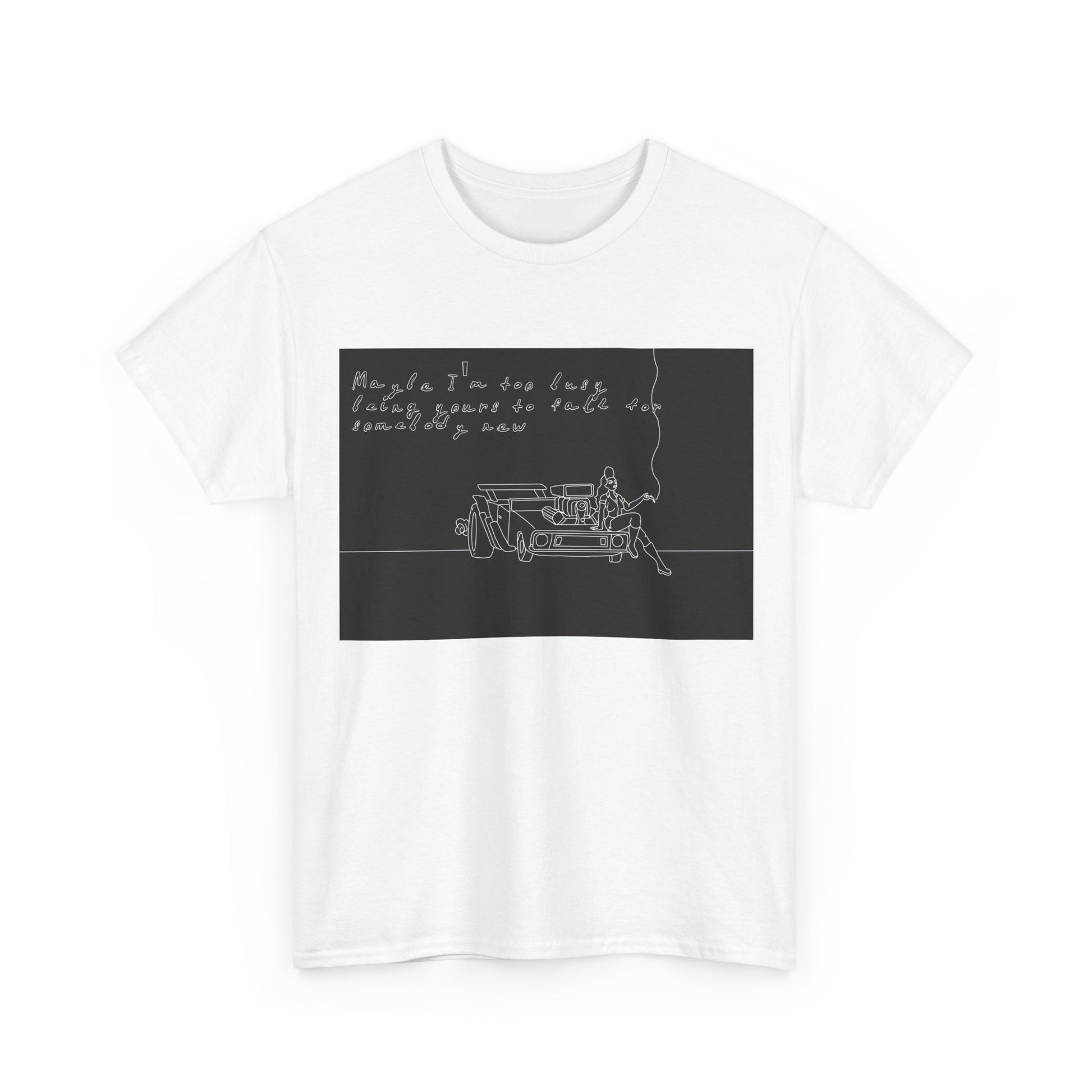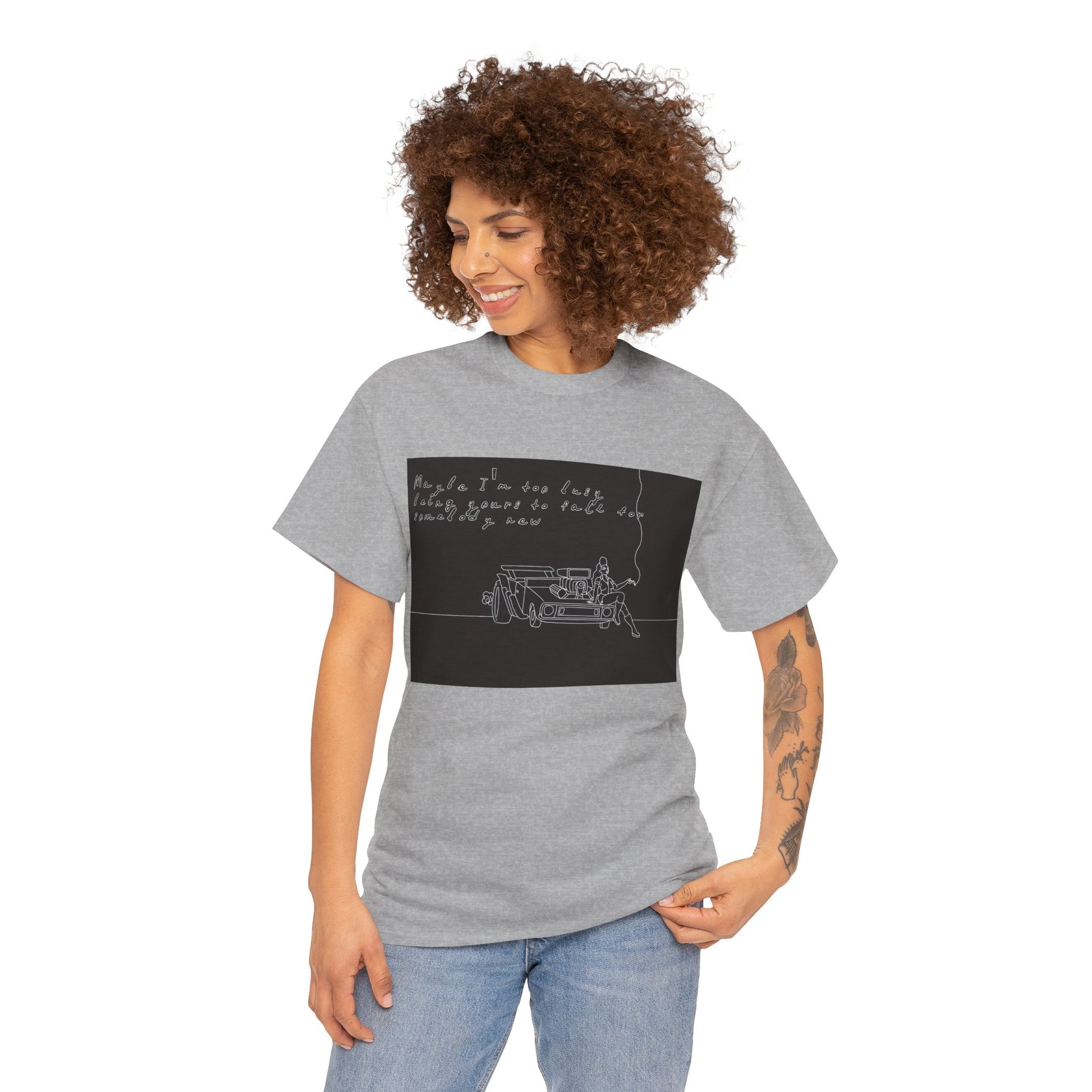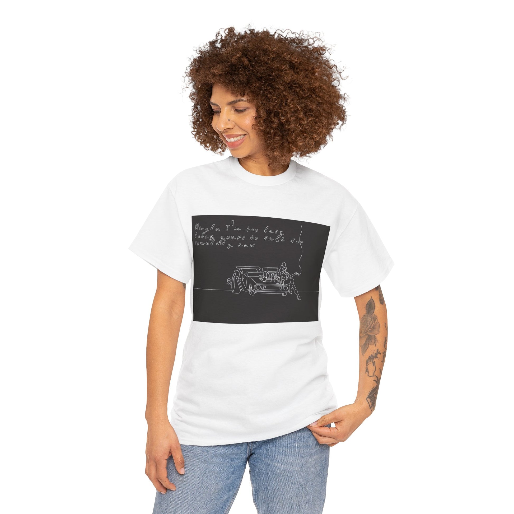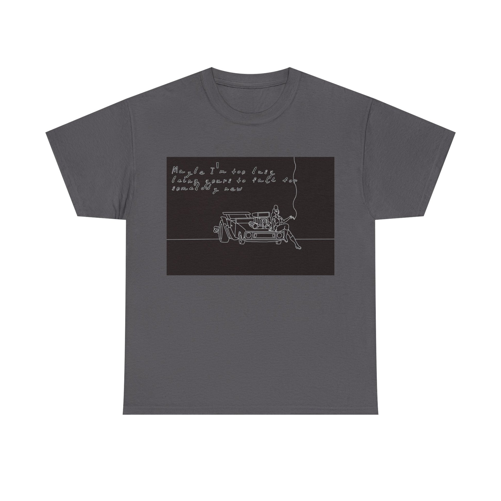 This soft, sturdy tee carries a quiet, introspective vibe — a simple line-drawing of a person leaning against a bench with a trailing cigarette and a few handwritten words floating above. The muted, monochrome print feels like a page from a late-night sketchbook: private, reflective, and slightly raw. Wear it when you want your outfit to read like a mood — easy silhouettes, honest materials, and a design that invites a second look and a slow conversation. It pairs with worn denim, layered jackets, or a beanie for evenings at small venues, walks under streetlights, or coffee shop corners where you scribble ideas into notebooks.