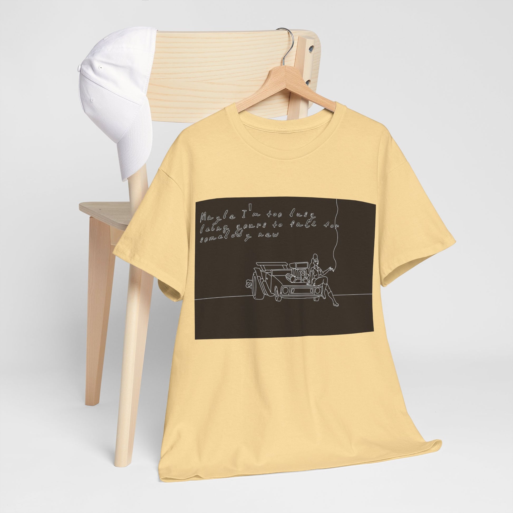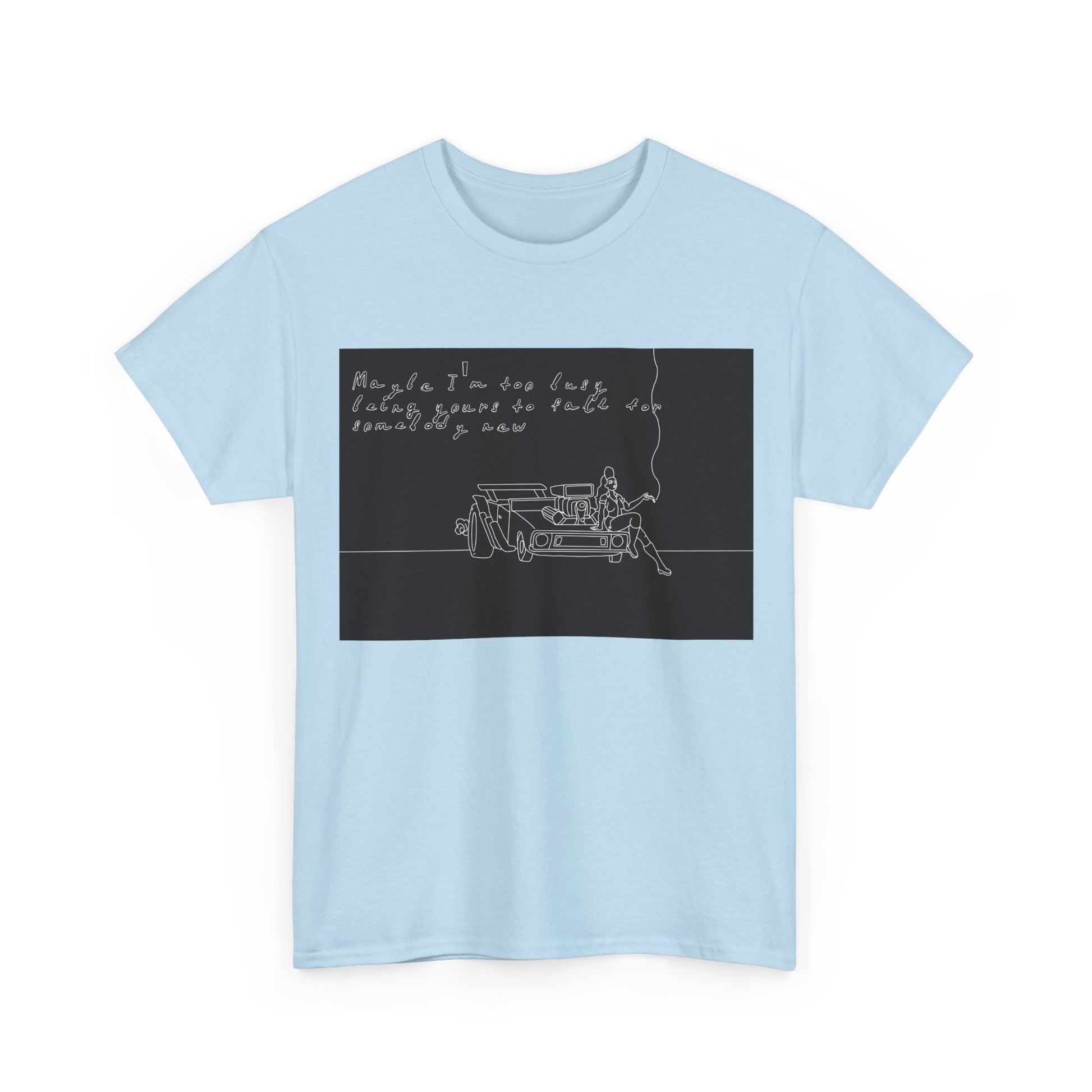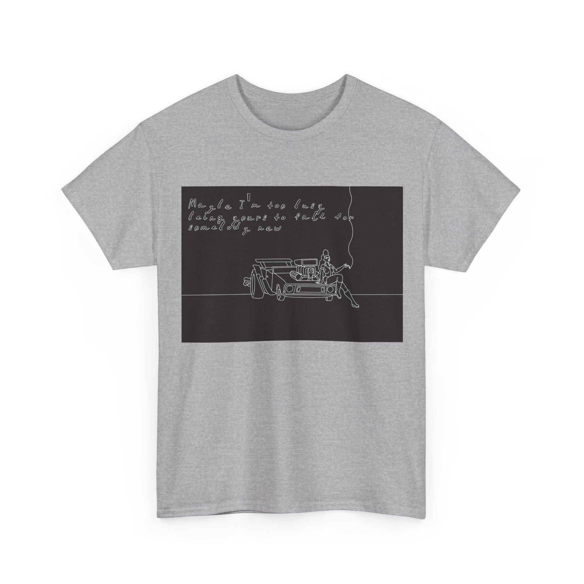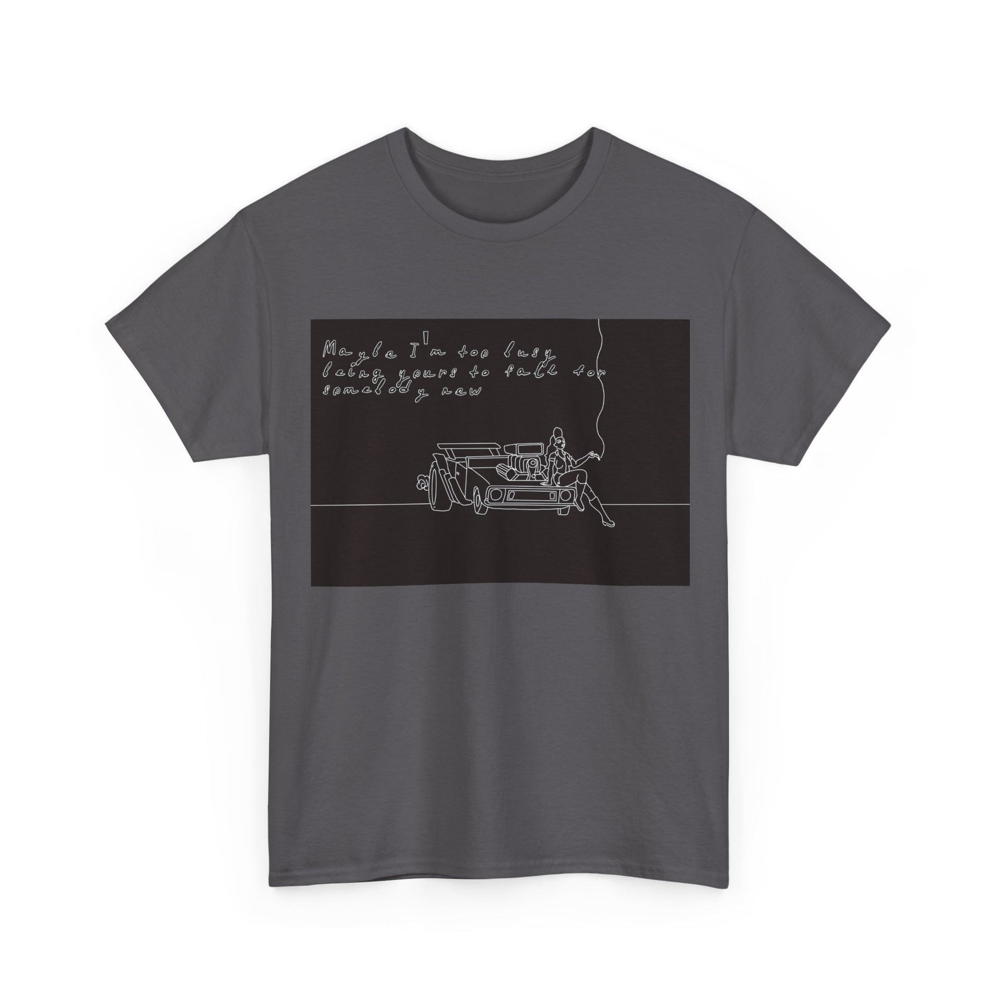 This soft, sturdy tee carries a quiet, introspective vibe — a simple line-drawing of a person leaning against a bench with a trailing cigarette and a few handwritten words floating above. The muted, monochrome print feels like a page from a late-night sketchbook: private, reflective, and slightly raw. Wear it when you want your outfit to read like a mood — easy silhouettes, honest materials, and a design that invites a second look and a slow conversation. It pairs with worn denim, layered jackets, or a beanie for evenings at small venues, walks under streetlights, or coffee shop corners where you scribble ideas into notebooks.