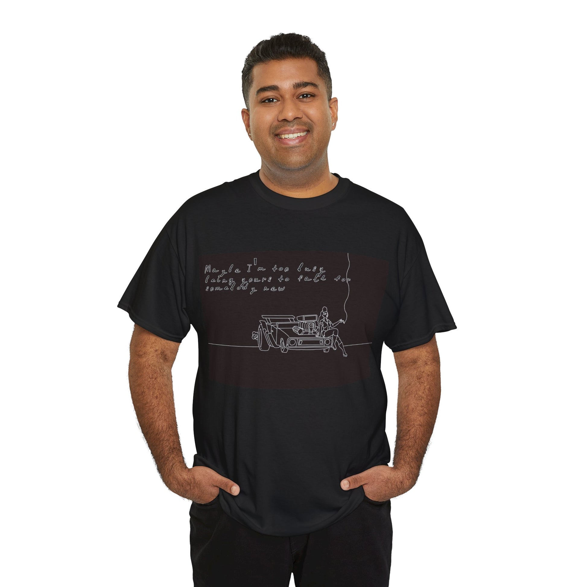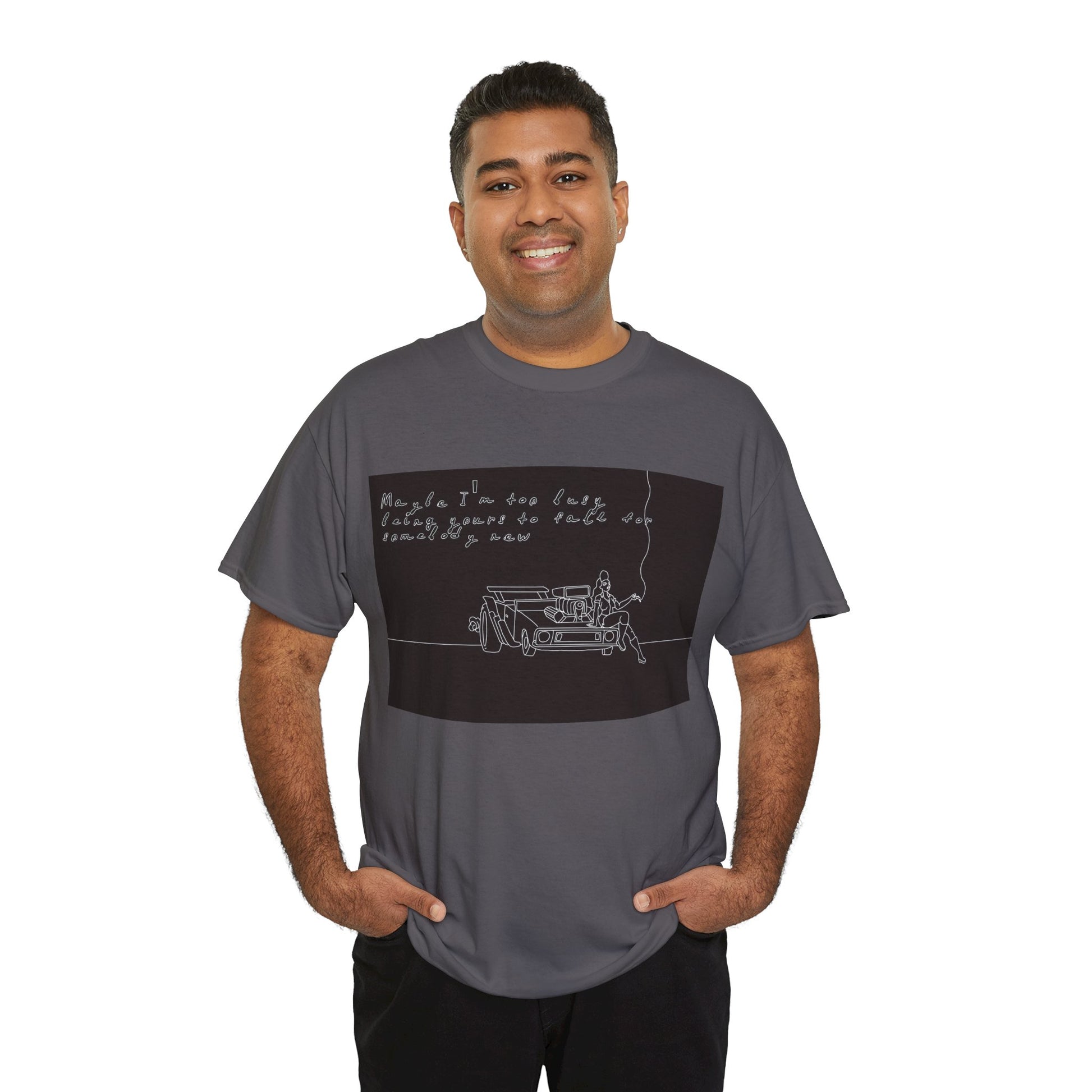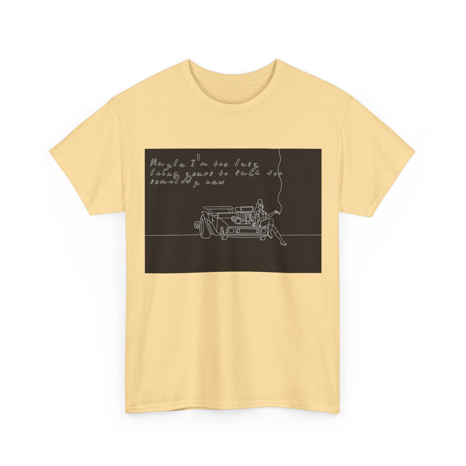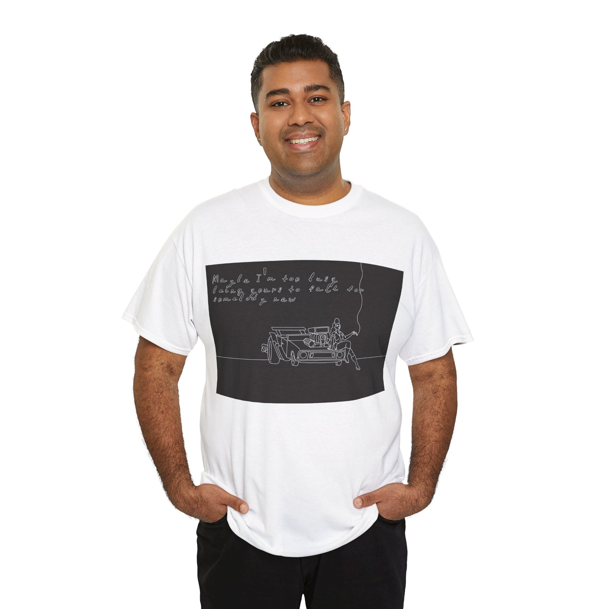 This soft, sturdy tee carries a quiet, introspective vibe — a simple line-drawing of a person leaning against a bench with a trailing cigarette and a few handwritten words floating above. The muted, monochrome print feels like a page from a late-night sketchbook: private, reflective, and slightly raw. Wear it when you want your outfit to read like a mood — easy silhouettes, honest materials, and a design that invites a second look and a slow conversation. It pairs with worn denim, layered jackets, or a beanie for evenings at small venues, walks under streetlights, or coffee shop corners where you scribble ideas into notebooks.