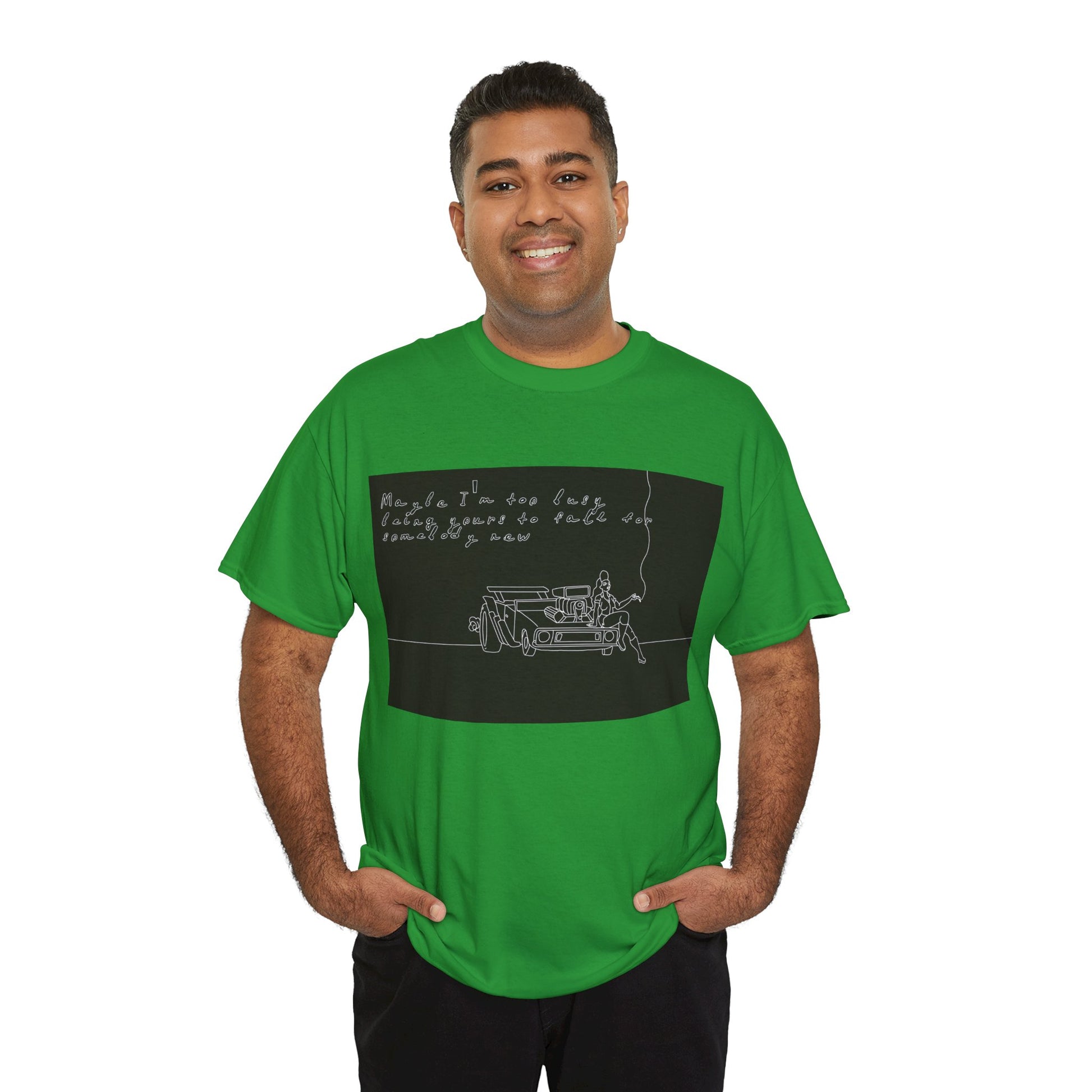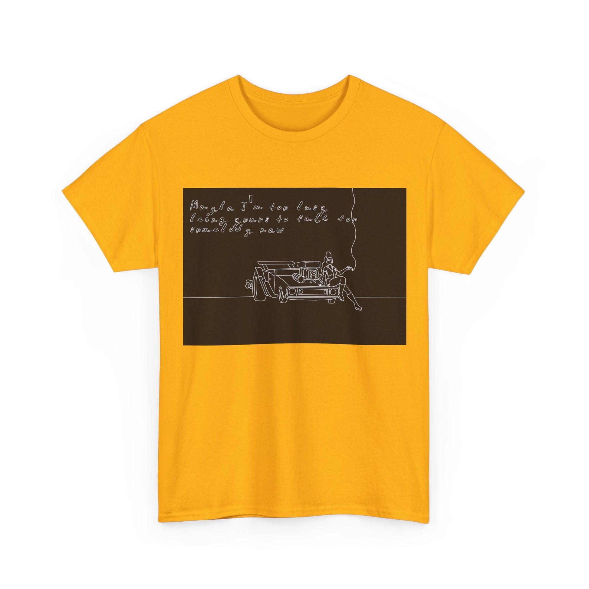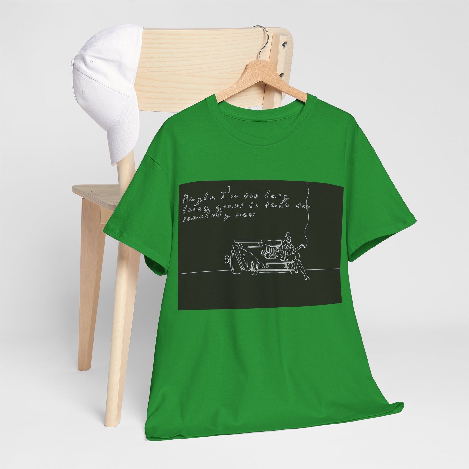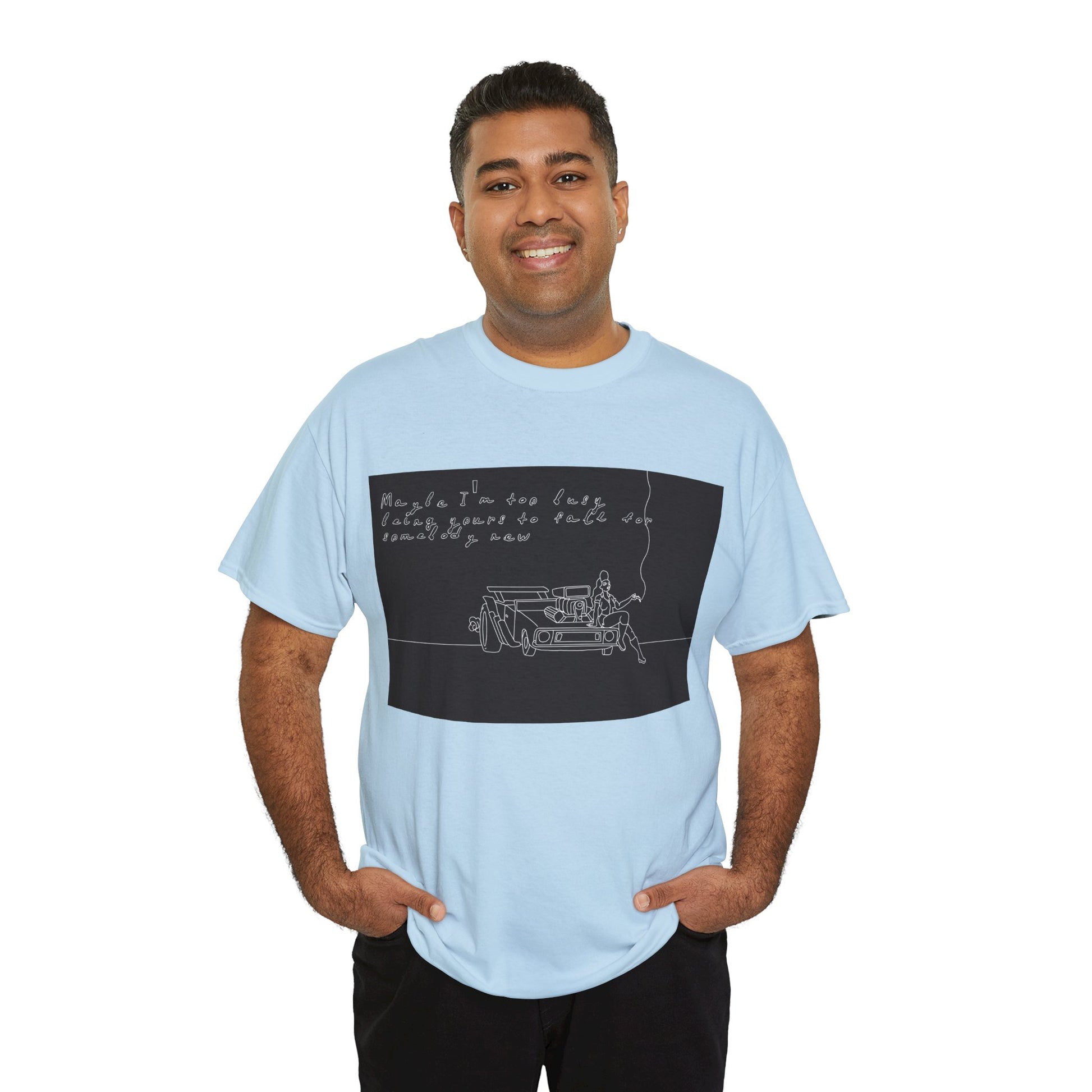 This soft, sturdy tee carries a quiet, introspective vibe — a simple line-drawing of a person leaning against a bench with a trailing cigarette and a few handwritten words floating above. The muted, monochrome print feels like a page from a late-night sketchbook: private, reflective, and slightly raw. Wear it when you want your outfit to read like a mood — easy silhouettes, honest materials, and a design that invites a second look and a slow conversation. It pairs with worn denim, layered jackets, or a beanie for evenings at small venues, walks under streetlights, or coffee shop corners where you scribble ideas into notebooks.