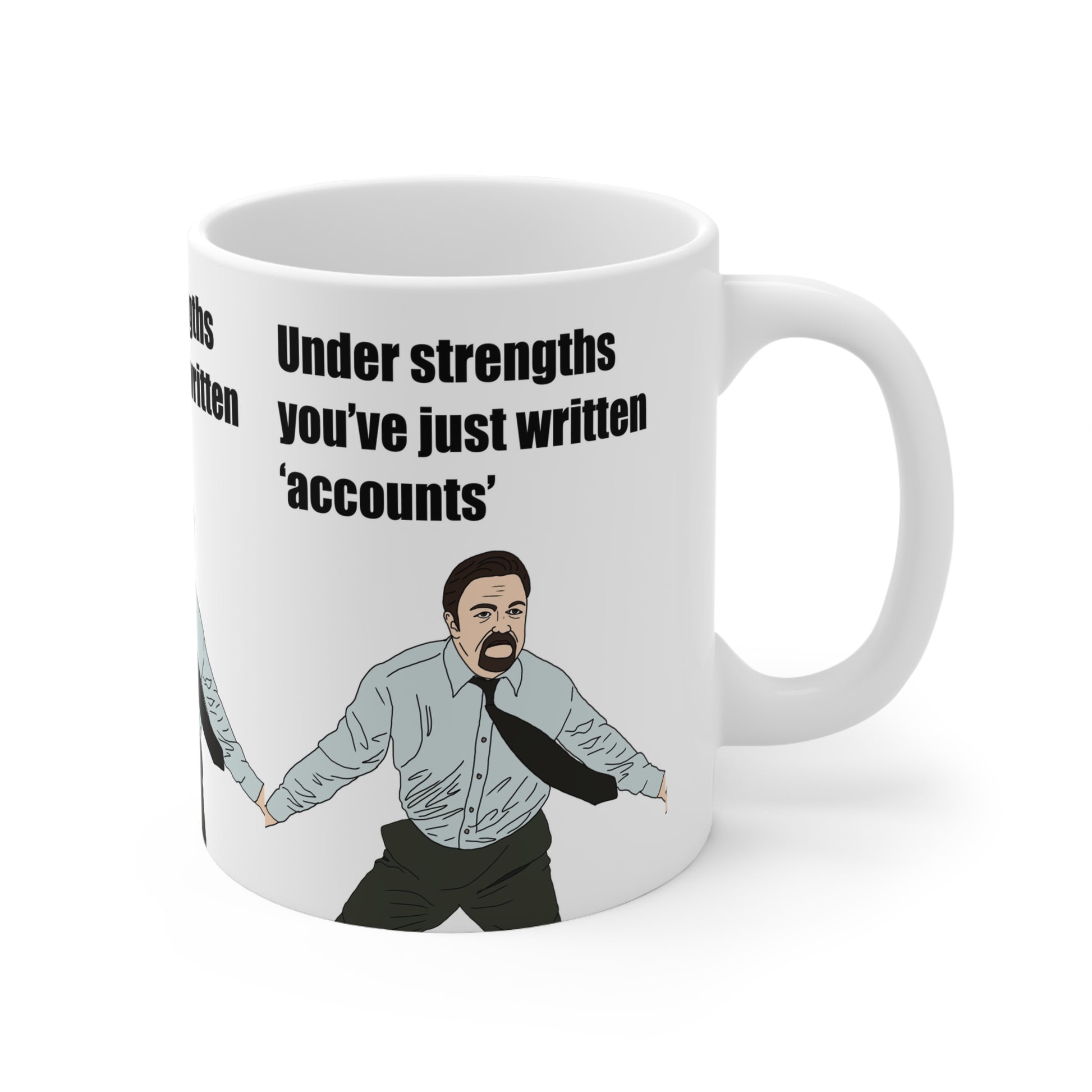The Office David Brent Funny Accounting Mug — “Under strengths you’ve just written ‘accounts’” Ceramic Coffee Cup (11oz/15oz)