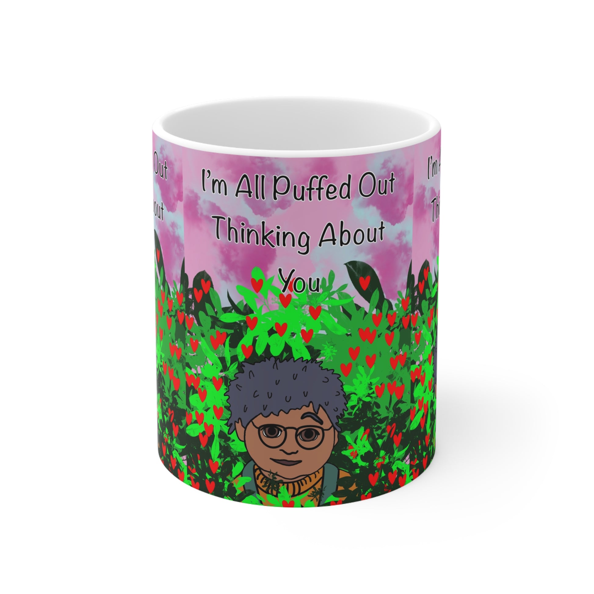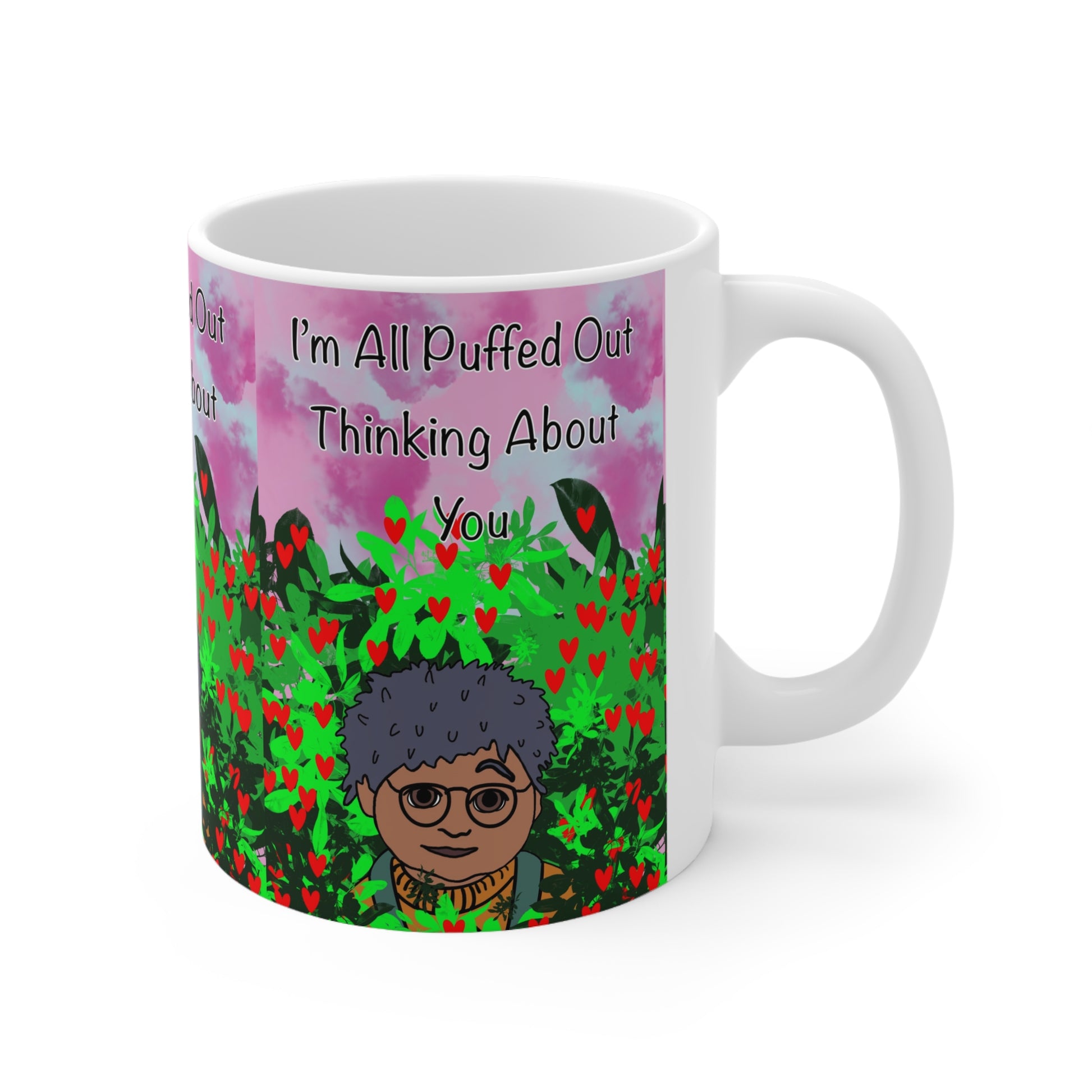 Bright, glossy ceramic mug that brings a playful, cozy mood to everyday sips. The wraparound artwork shows a whimsical character peeking through a field of heart-shaped blooms beneath a watercolor sky, with the sweet phrase “I’m All Puffed Out Thinking About You” floating above. The vibrant print and smooth ORCA finish keep colors lively and details crisp. Holds either 11oz or 15oz of your favorite hot drink and feels comfortable in hand thanks to the C-shaped handle. Microwave- and dishwasher-safe, lead- and BPA-free, and compliant with US ceramicware safety standards, this mug blends cheerful design with dependable everyday performance.