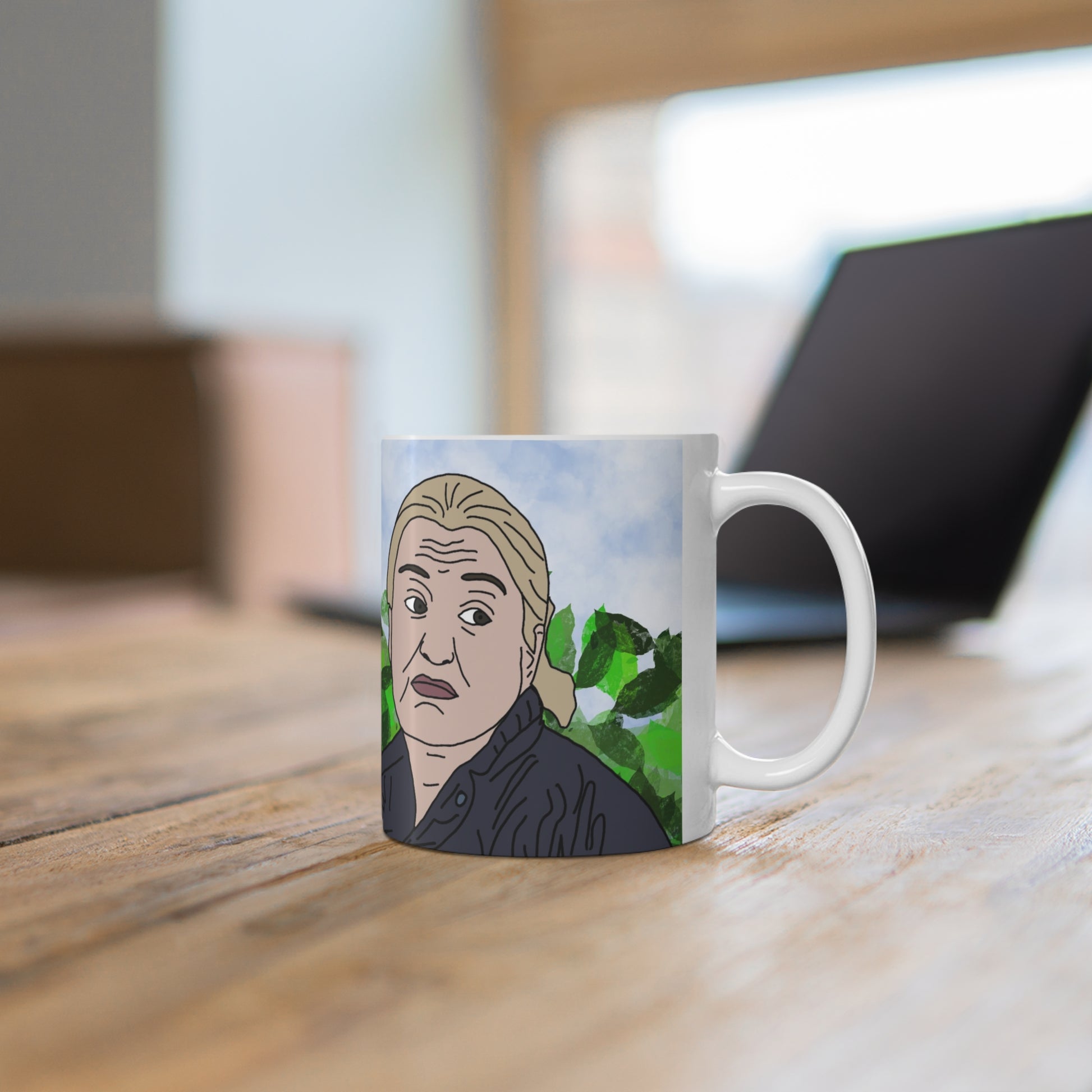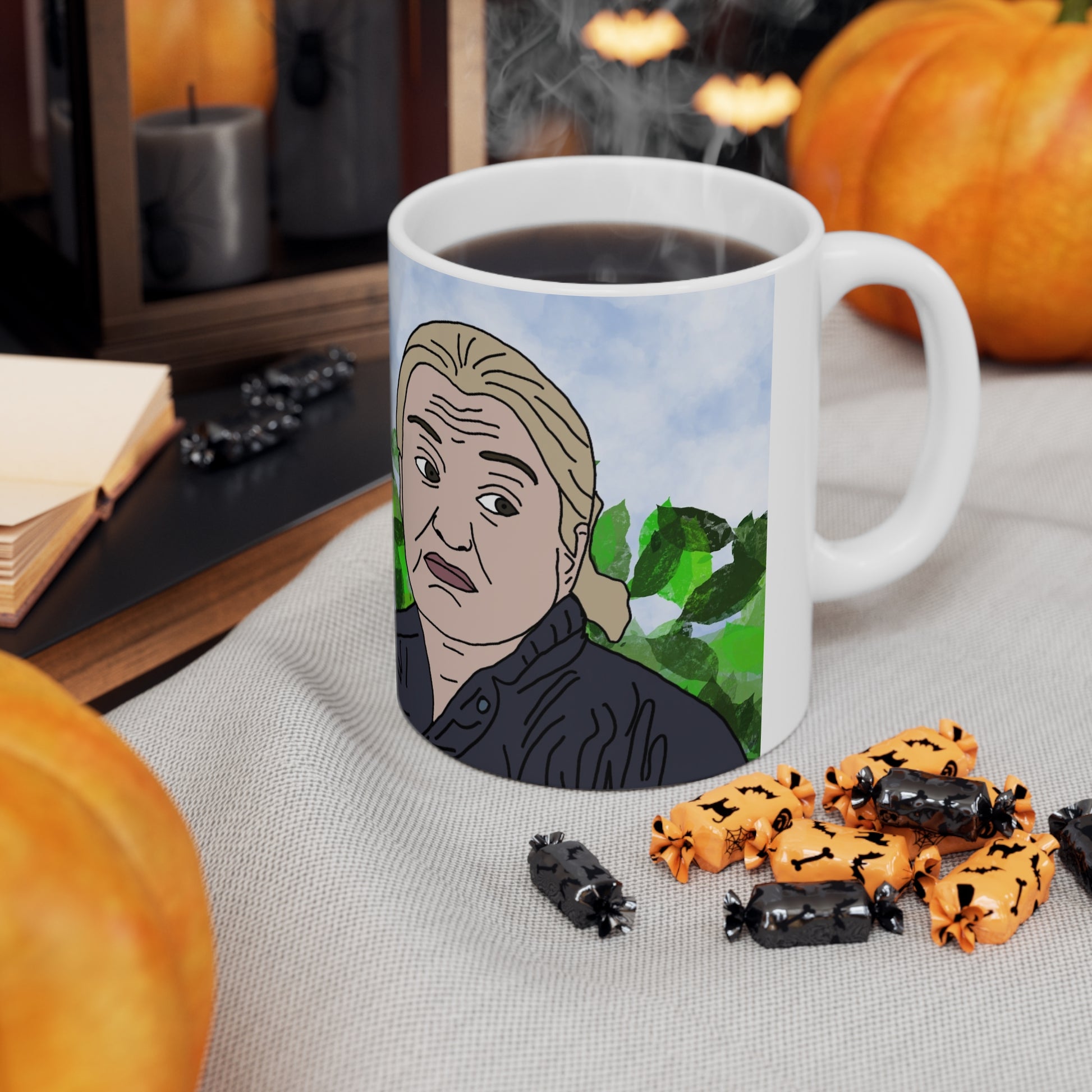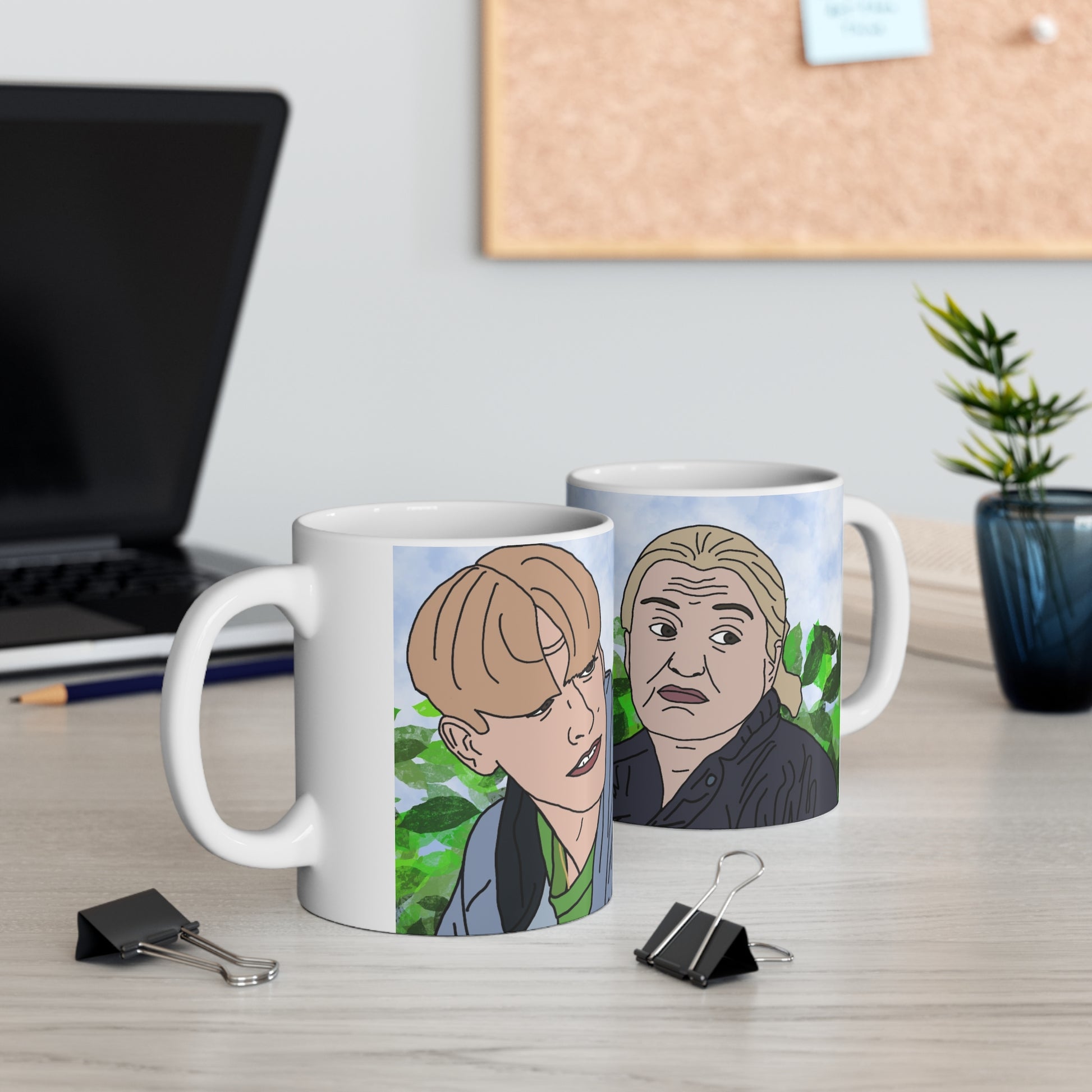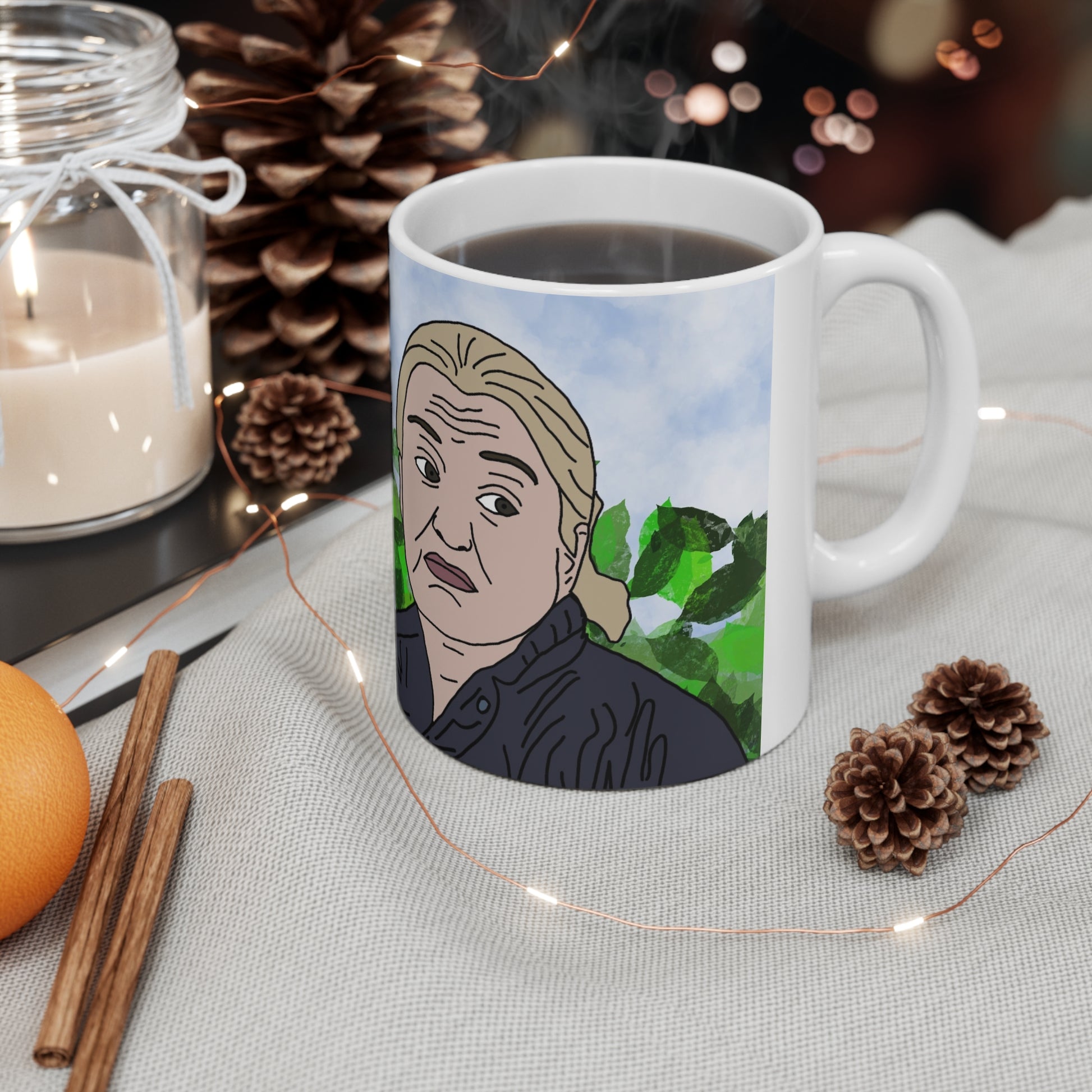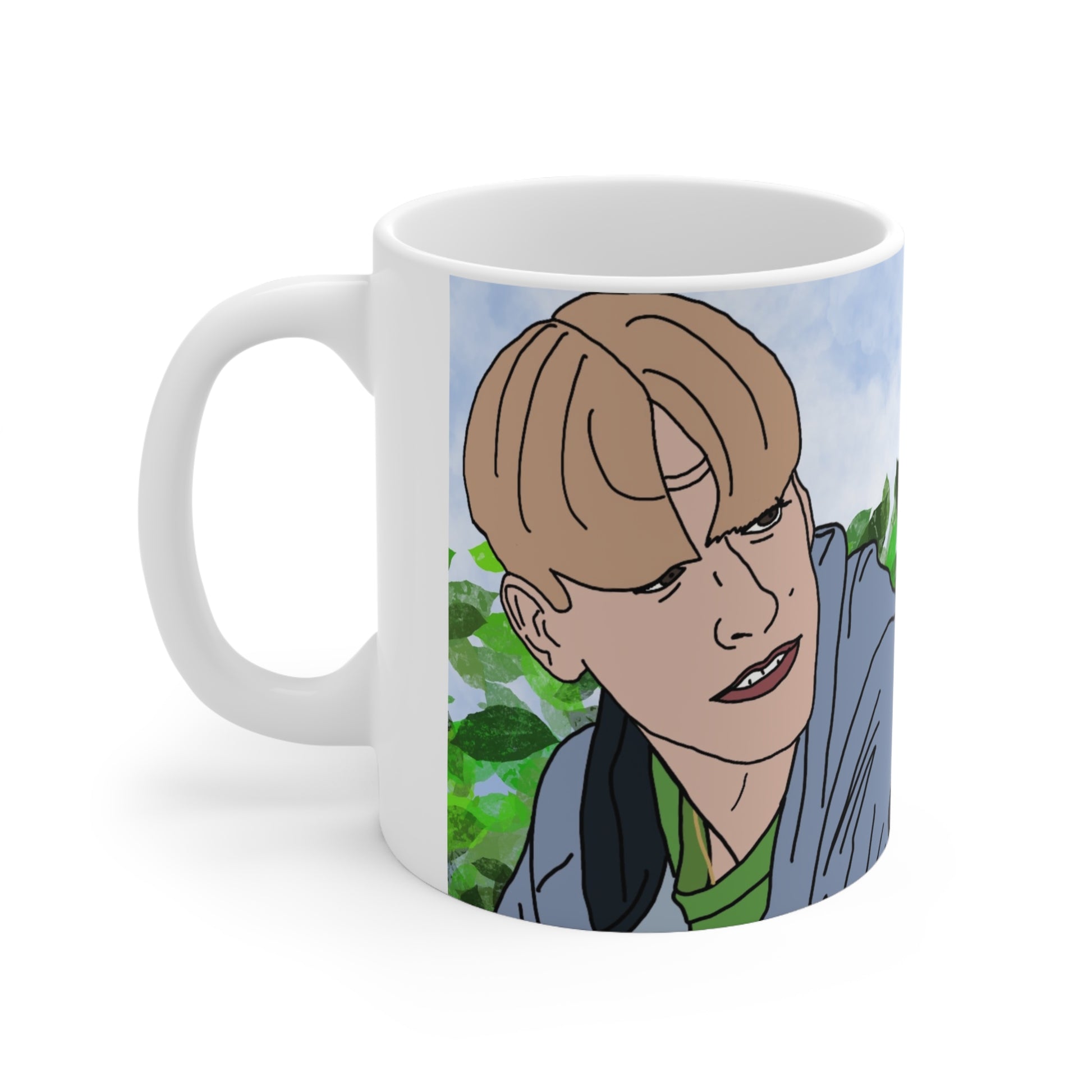 A bright, glossy ceramic coffee mug that brings a slice of playful, hand-illustrated personality to your morning ritual. The wraparound artwork shows expressive, comic-style characters set against a soft blue sky and leafy green background — a casual scene that invites conversation. Choose 11oz for a compact daily cup or 15oz when you need a little extra brew. The ORCA-coated print locks in vivid color and crisp linework, so the illustration stays lively through everyday use. Comfortable C-shaped handle and lead- and BPA-free ceramic make it safe for daily sipping. Easy to heat in the microwave and simple to clean in the dishwasher, this mug fits right into a lively kitchen or a cozy work desk where humor and art meet.
