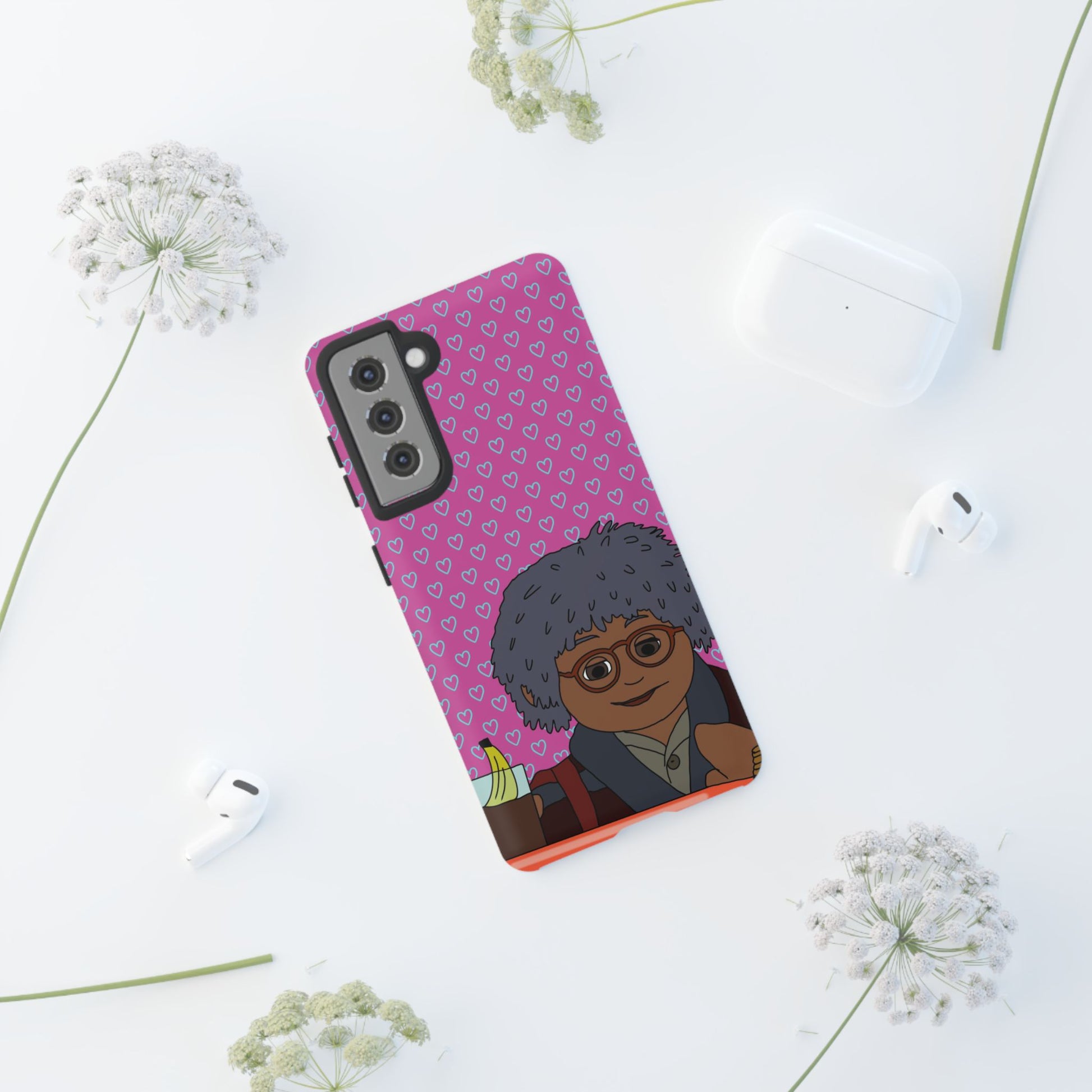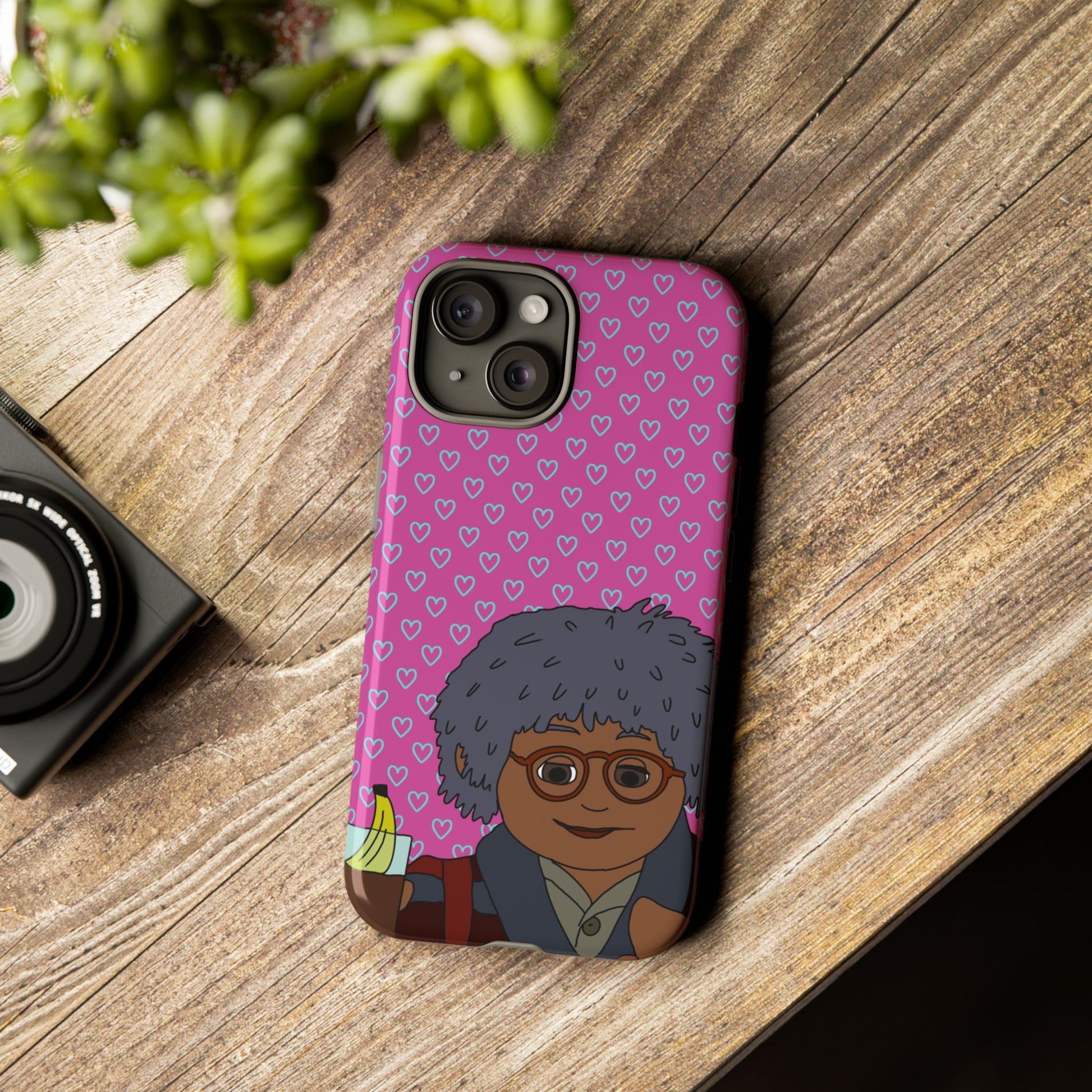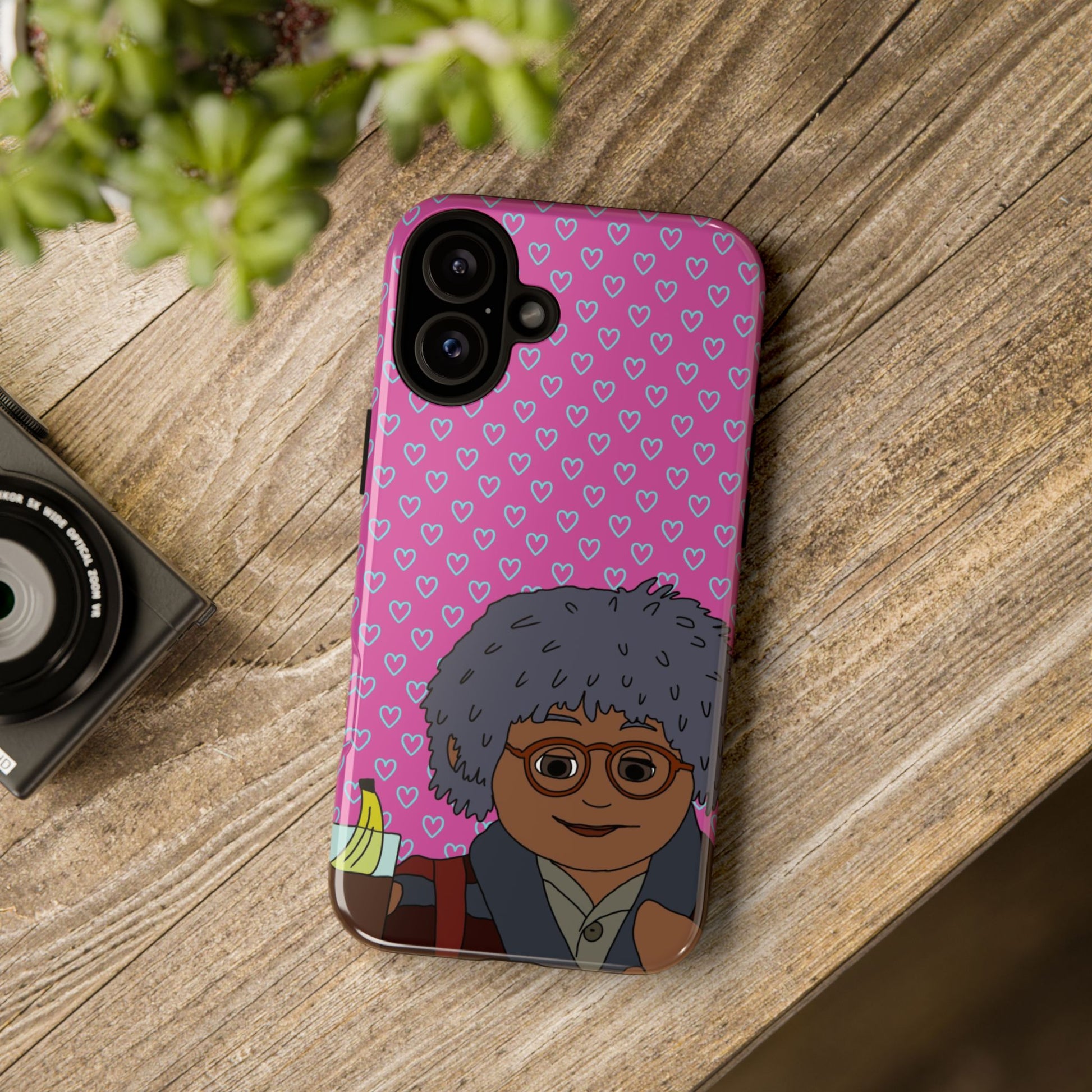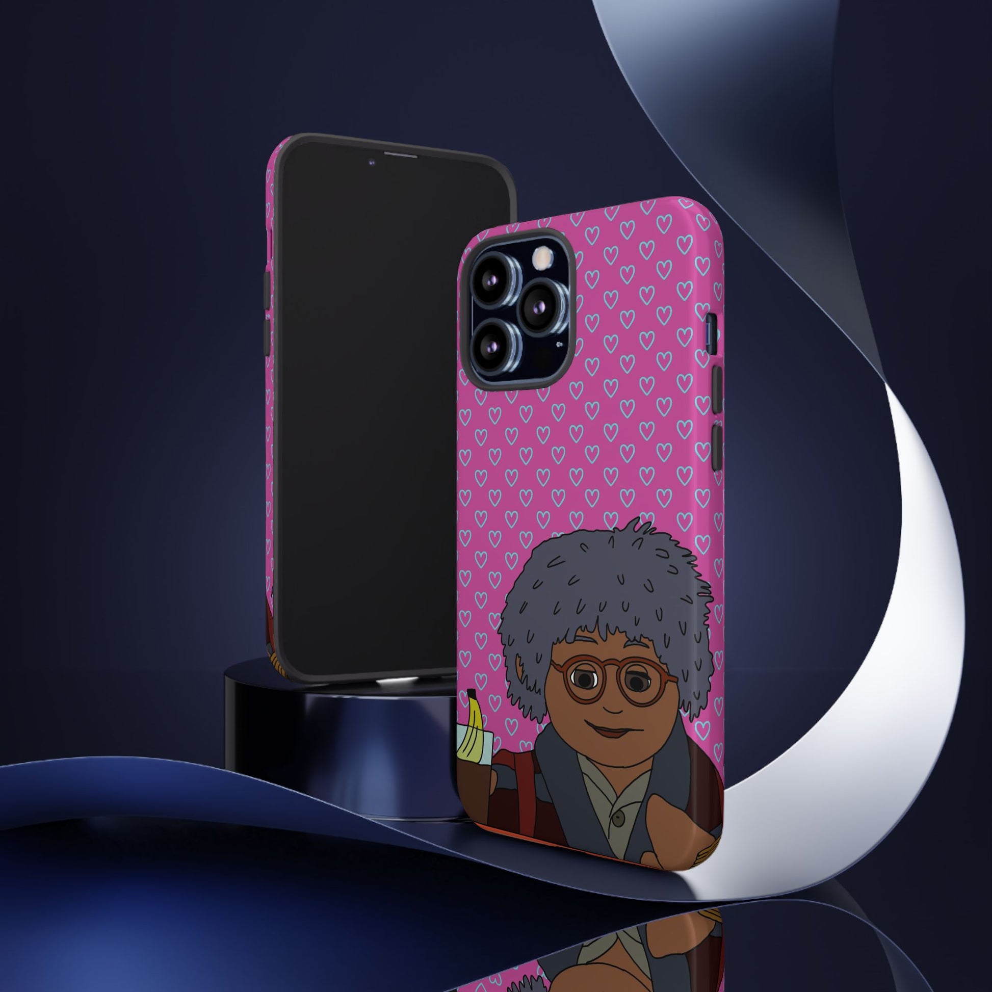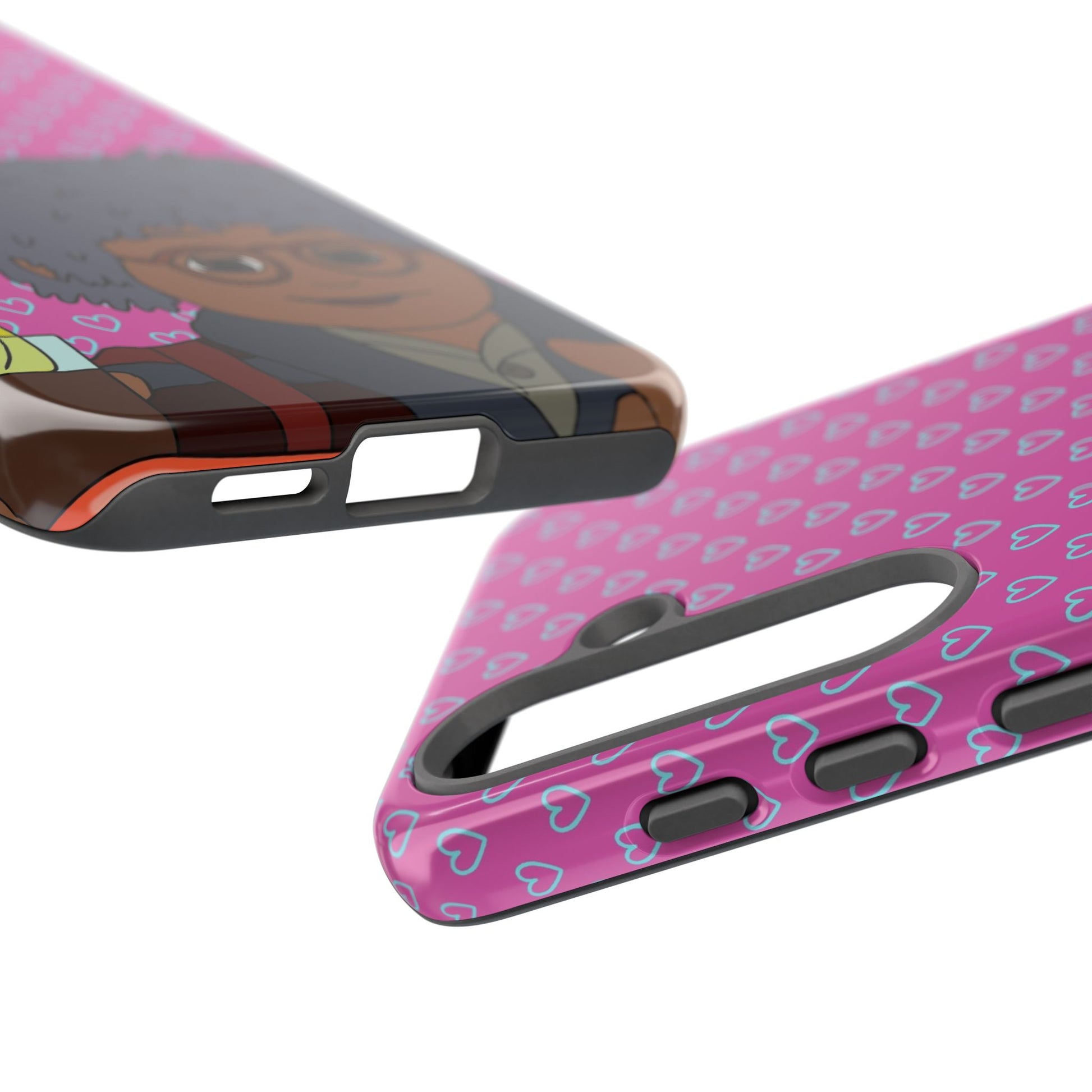 This sturdy protective case brings playful warmth to everyday life. A bright pink field peppered with tiny hearts wraps the phone, while a cozy, soft-edged character peeks up from the bottom—glasses, gray hair, and a gentle smile that suggests slow mornings, strong coffee, and quiet humor. The dual-layer build cushions against drops; the silicone liner and impact-resistant shell keep the edges intact while the glossy or matte finish preserves the cheerful art. Slip it on, and your phone becomes an instant reminder to carry a little comfort and personality through busy days and long commutes.