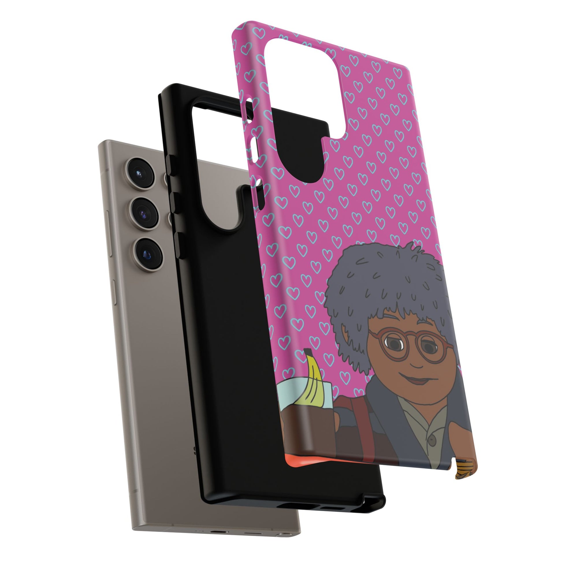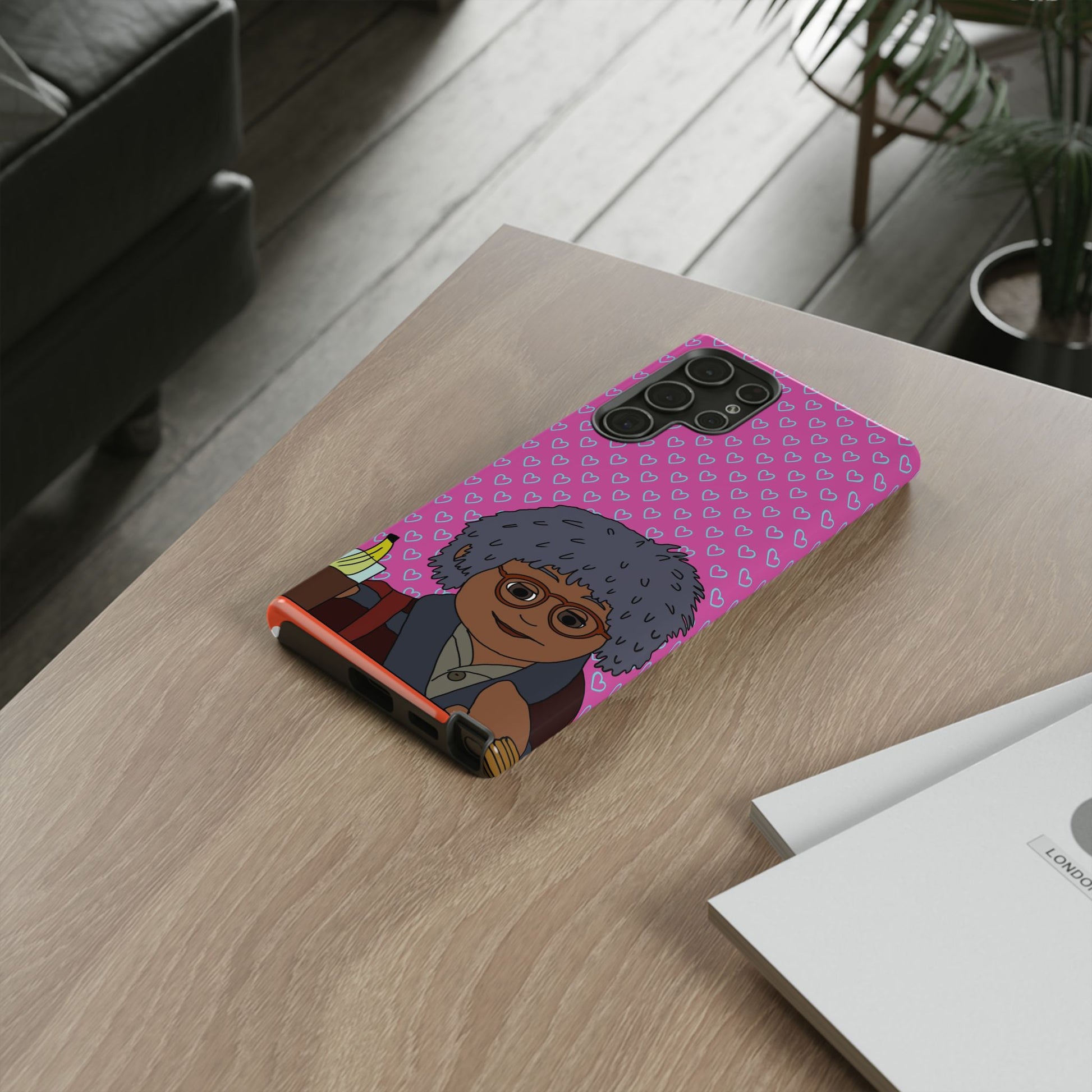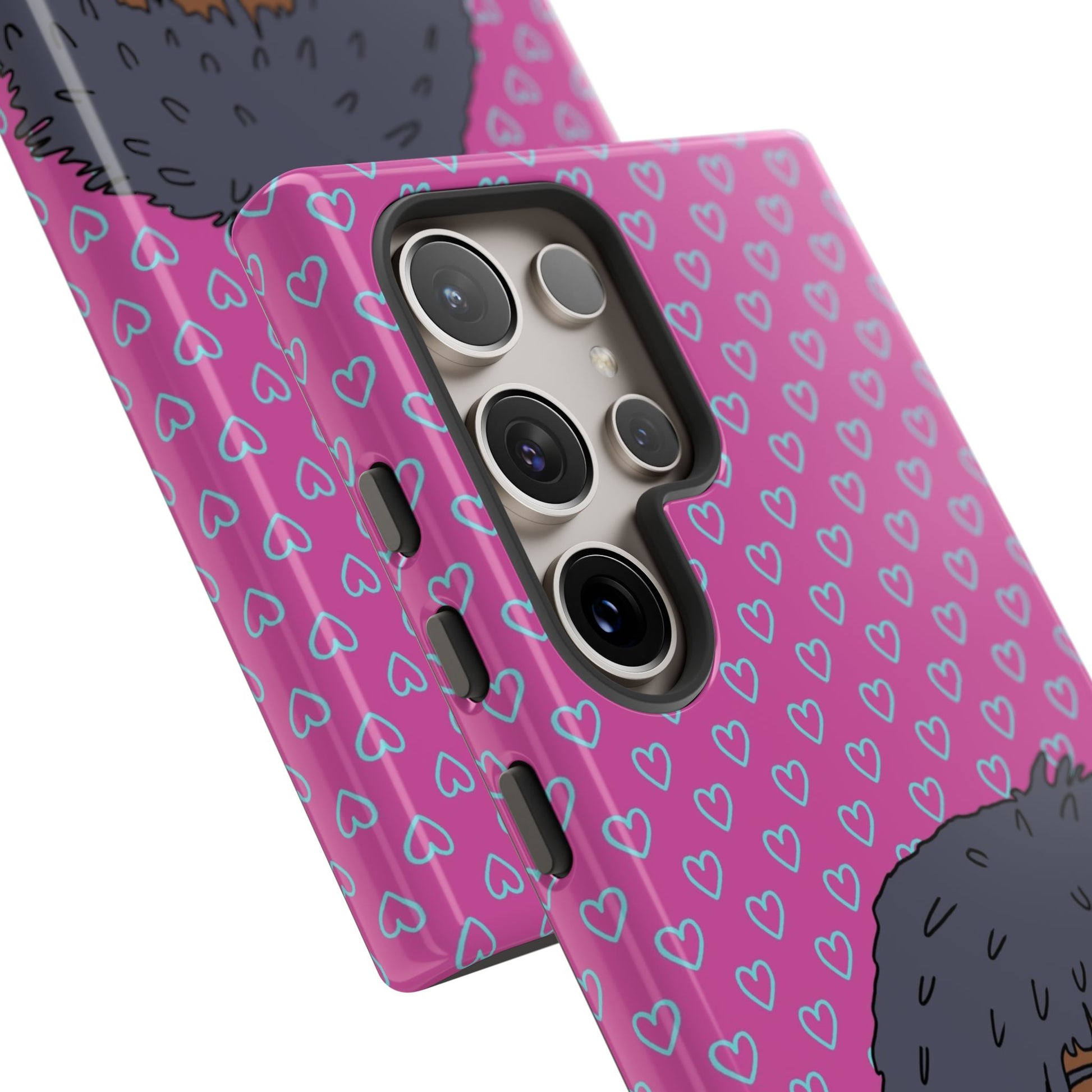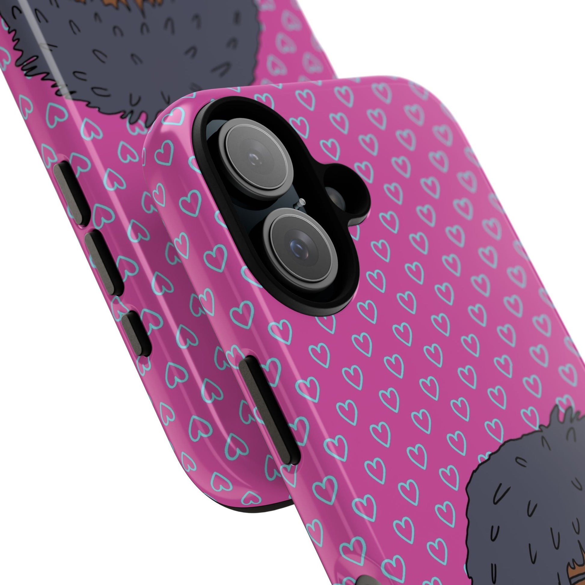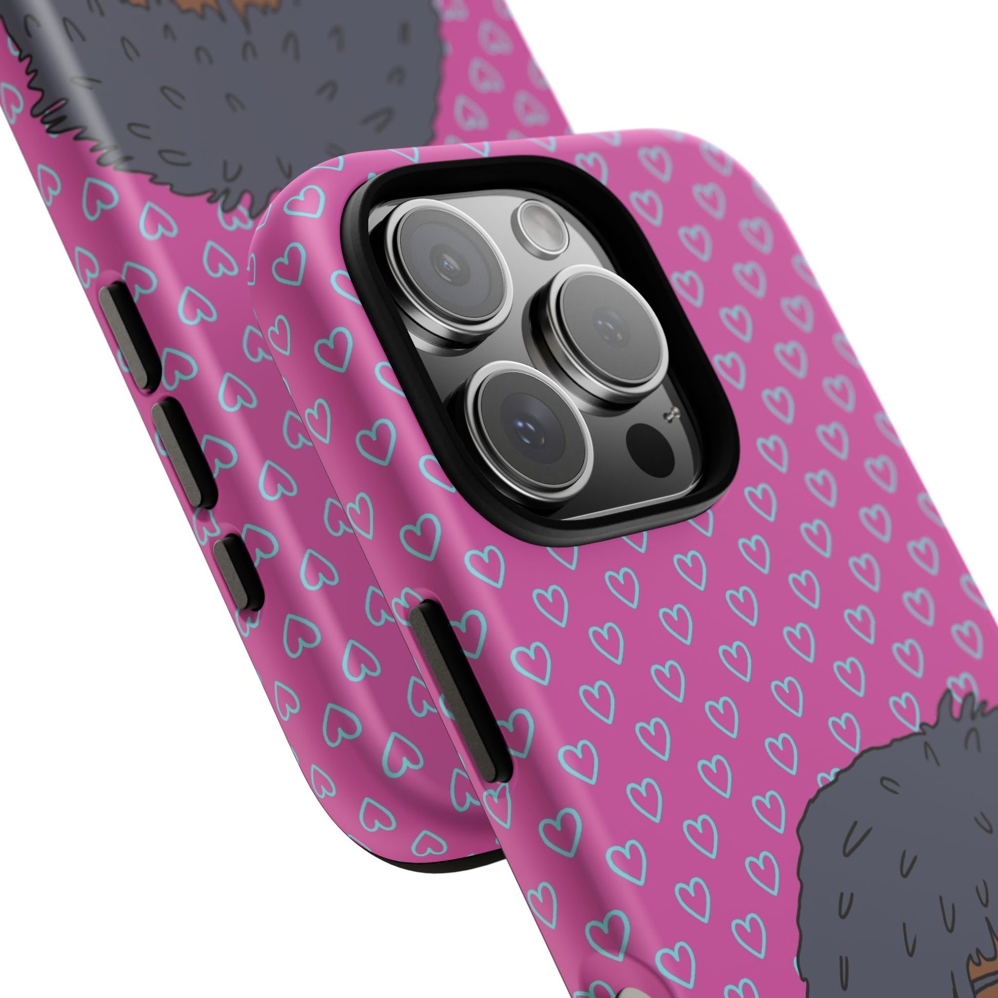 This sturdy protective case brings playful warmth to everyday life. A bright pink field peppered with tiny hearts wraps the phone, while a cozy, soft-edged character peeks up from the bottom—glasses, gray hair, and a gentle smile that suggests slow mornings, strong coffee, and quiet humor. The dual-layer build cushions against drops; the silicone liner and impact-resistant shell keep the edges intact while the glossy or matte finish preserves the cheerful art. Slip it on, and your phone becomes an instant reminder to carry a little comfort and personality through busy days and long commutes.